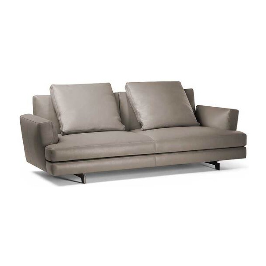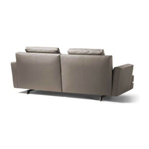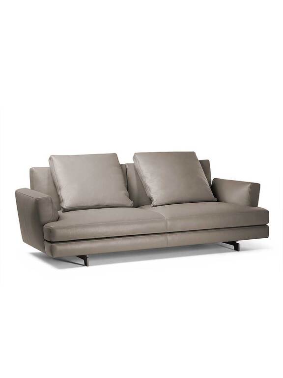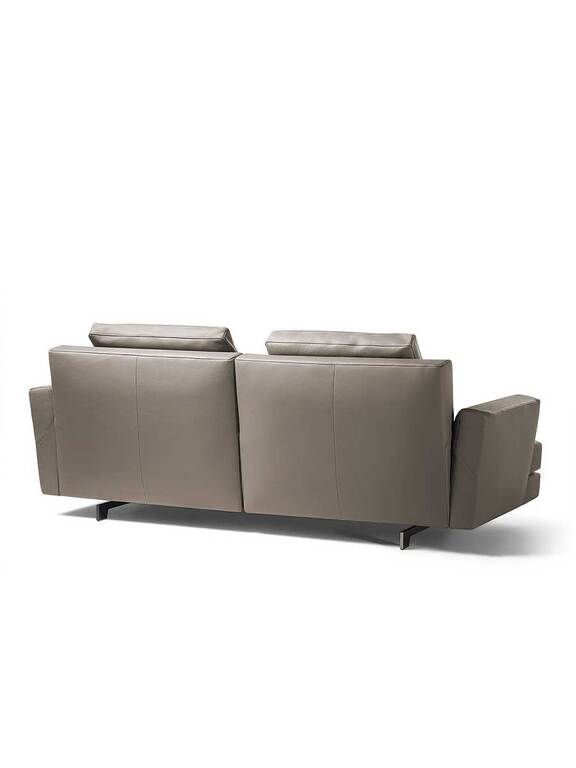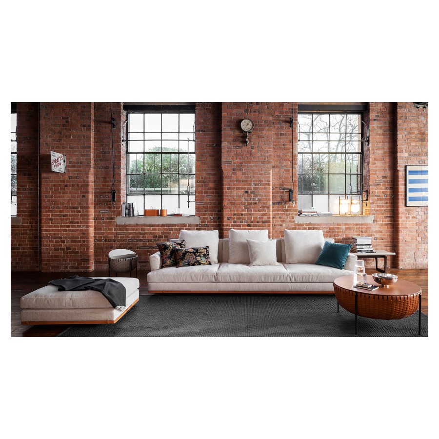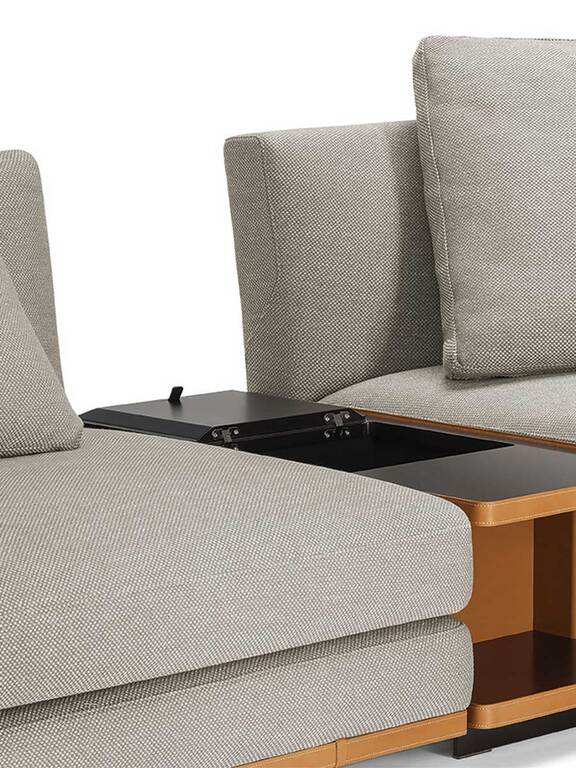 The Come Together sofa system is upholstered in Pelle Frau® leather or fabric. To emphasise the sensation of solidity, the sofa can be enriched right along the bottom edge by a band of Cuoio Saddle or Cuoio Saddle Extra leather decorated with loops to resemble belts or other small leather goods. The version without band emphasises the lightness of the design. The stitching traces a thin and harmonious graphical effect on the surfaces of the armrests. The feet can be cylindrical in black anodised aluminium or blade-shaped, in burnished and brushed steel or steel with Ruthenium galvanic treatment.