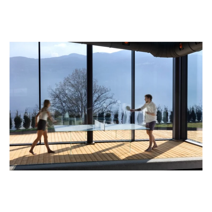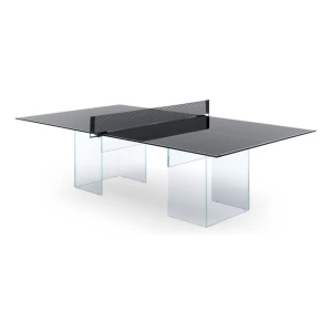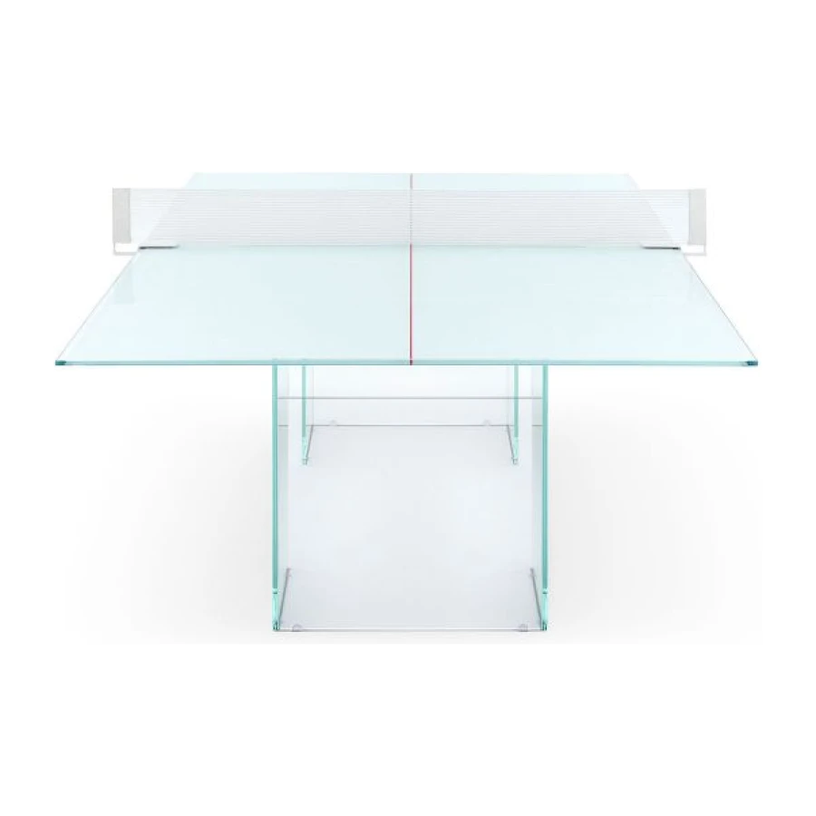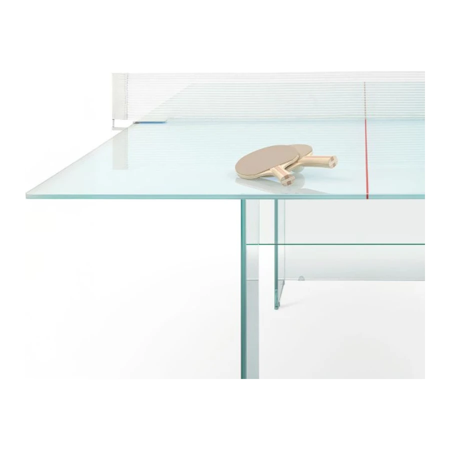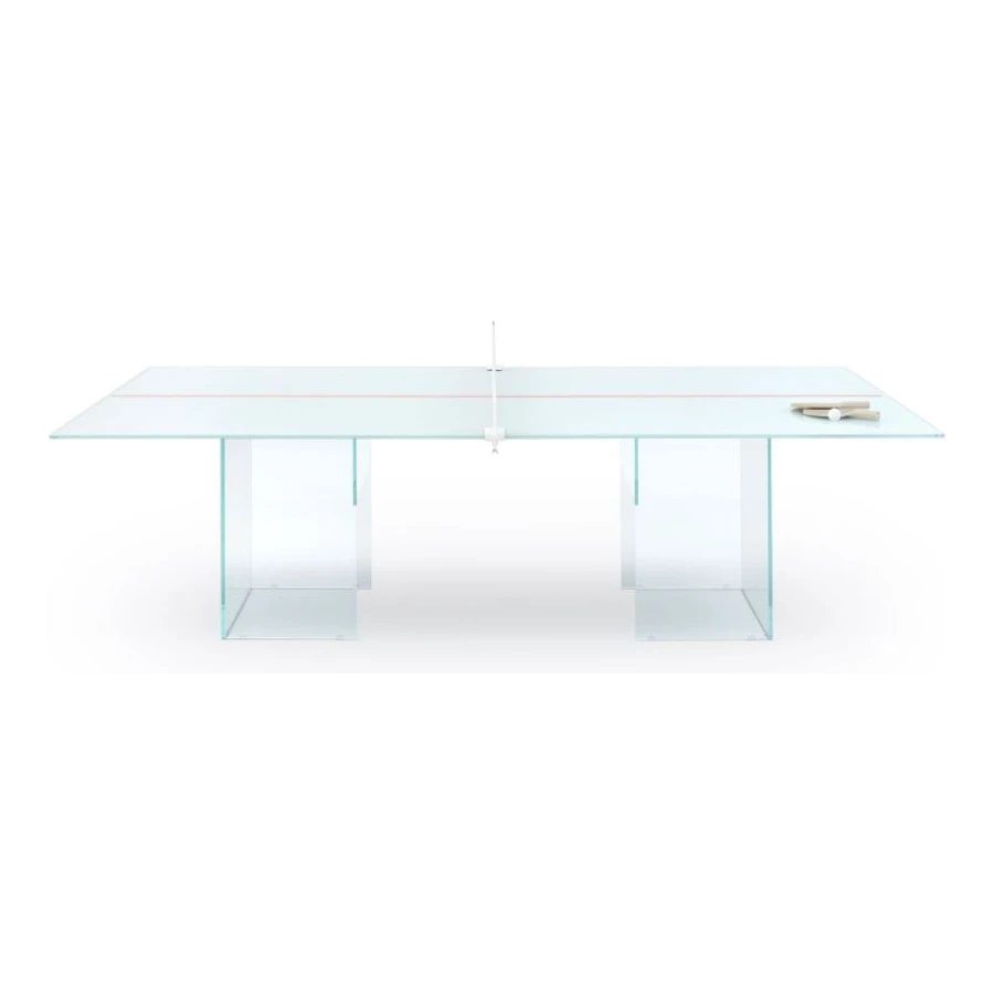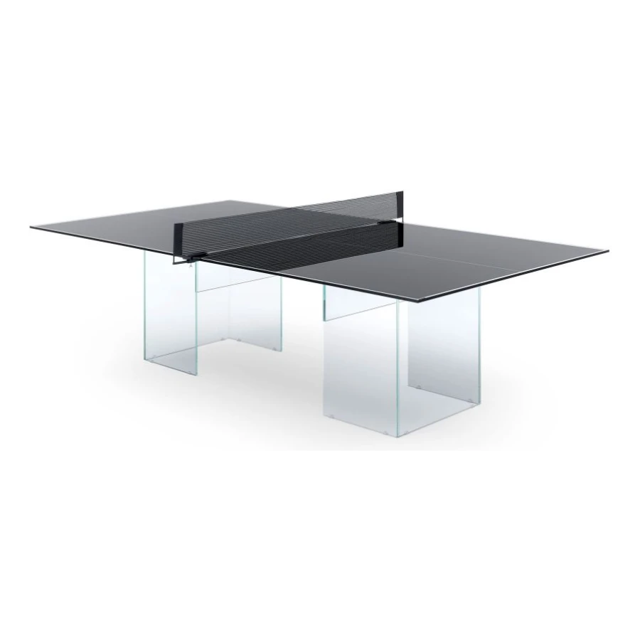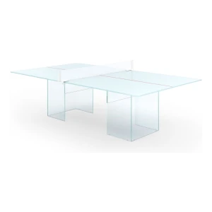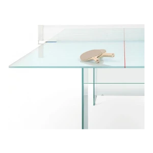 The innovative Ping-pong table made entirely of glass, with a silkscreened top; by eliminating the playing net, Crystal becomes an elegant and sober dining table, ideal for the most modern homes, new-concept hotels and the most important reception rooms.