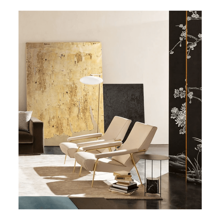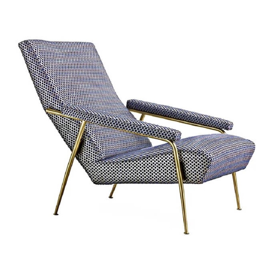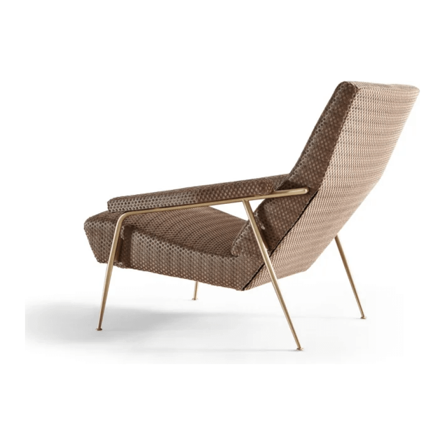 Brass structure, cover in bicolor white-blue leather or “Punteggiato” fabric, designed by Ponti for Rubelli in 1934. The fabric reinterprets the age-old technique of velvet-weaving, bringing it up to date with contemporary patterns, such as close sequences of staggered disks with various gradations of colour. Exhibited at the Salone del Mobile 2012, the D.153.1 chair enriches the Gio Ponti furnishing Collection.
