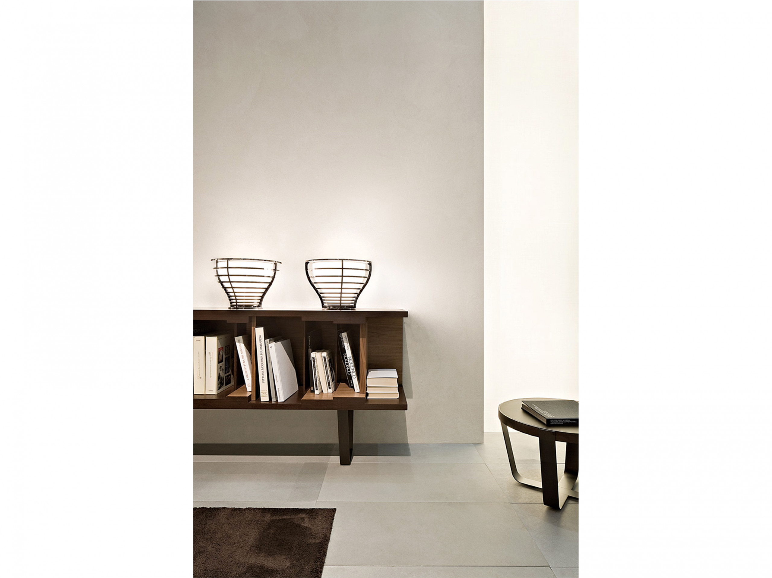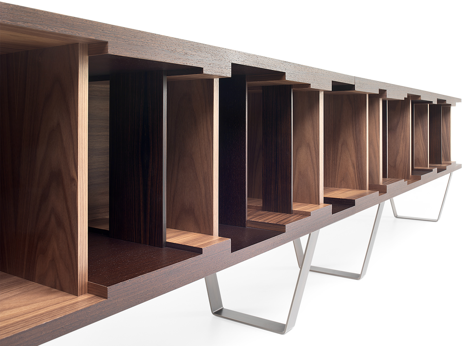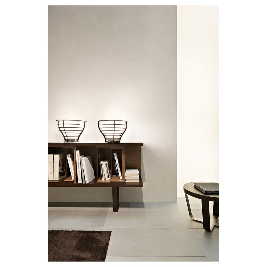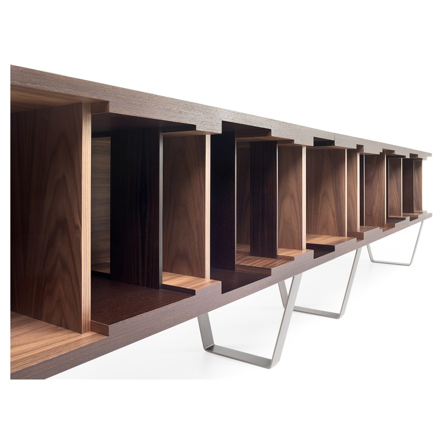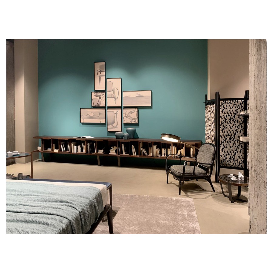 Inspired by the concepts of design flexibility and aesthetic versatility, DC 200/DC 250 is a modular bookcase in wenge. It is particularly notable for its elegant burnished brass base, which gives it a contemporary feel. Designed by Vincenzo De Cotiis in 2009, its characteristic graphical lines are underlined by interiors in American walnut and dividing panels in American walnut, ebony and wenge. Available in two different lengths, it is wall-mounted.
