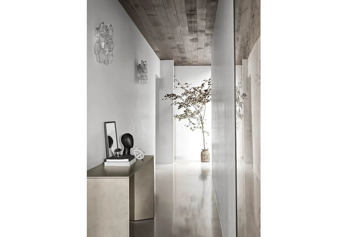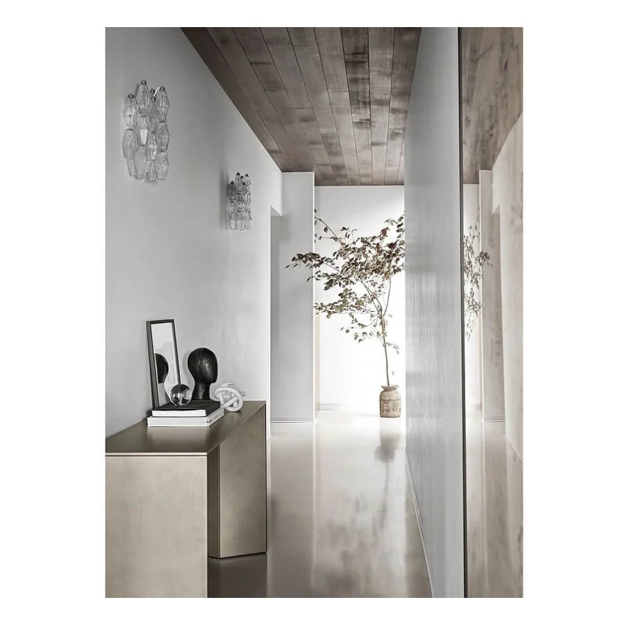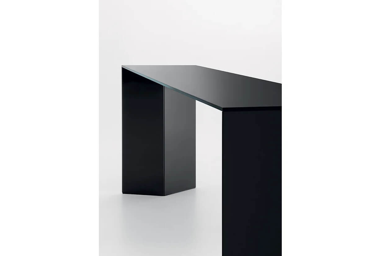Console with wooden base covered by 6mm tempered glass and 10mm extralight tempered glass top, painted as per samples in the bright or version. Also available version with glass painted with the exclusive “Cashmere” brushed finish in the colours gold grey and anthracite or patinated bronze.
