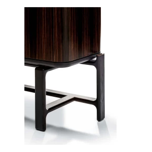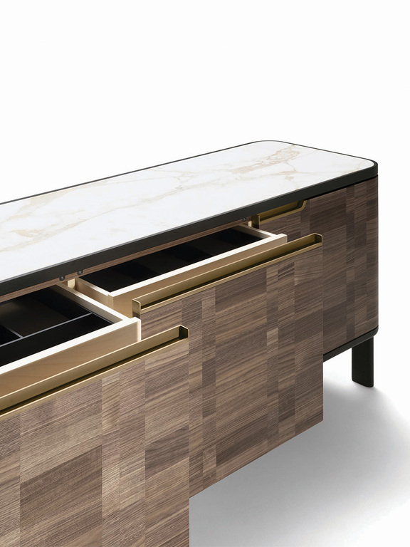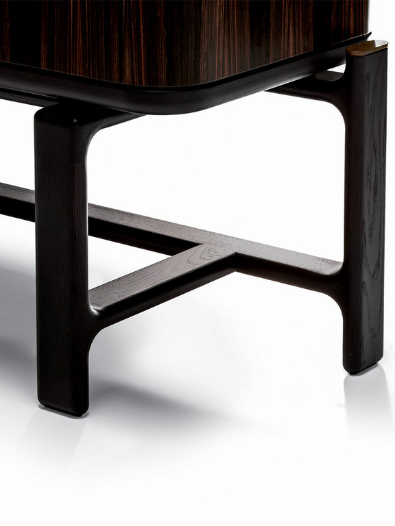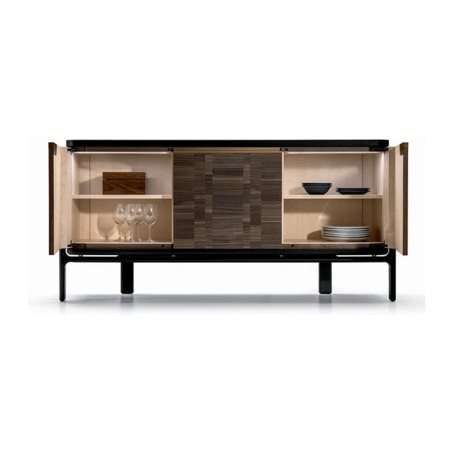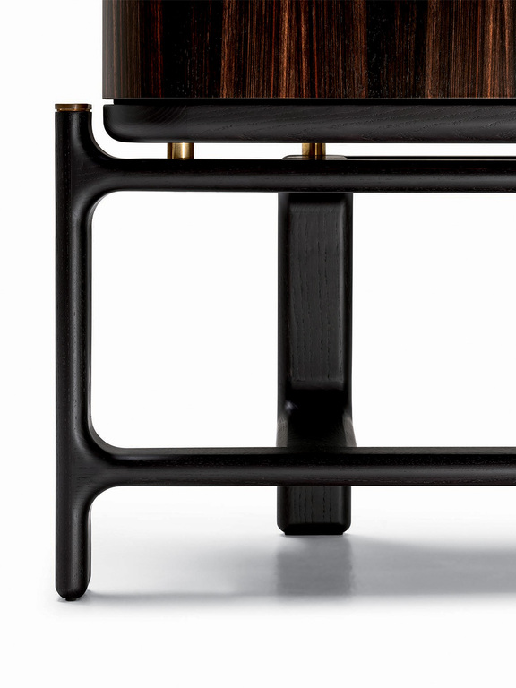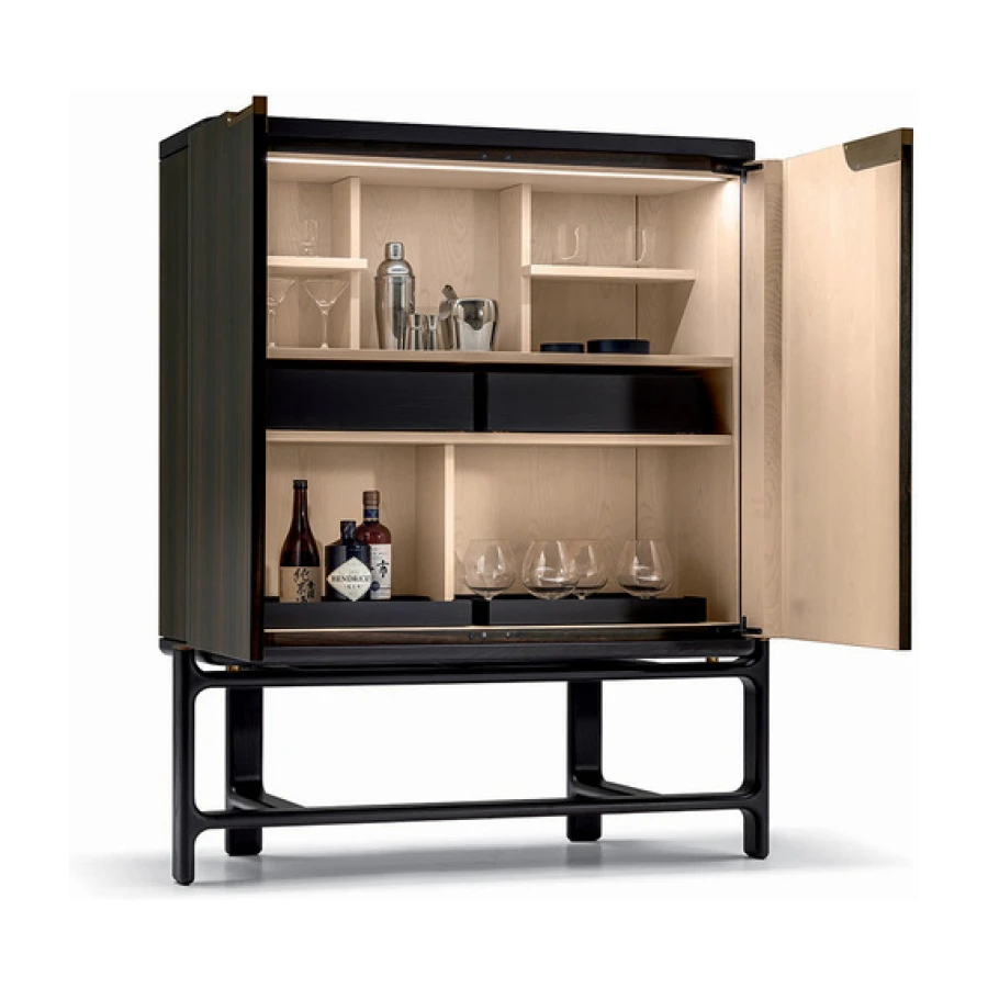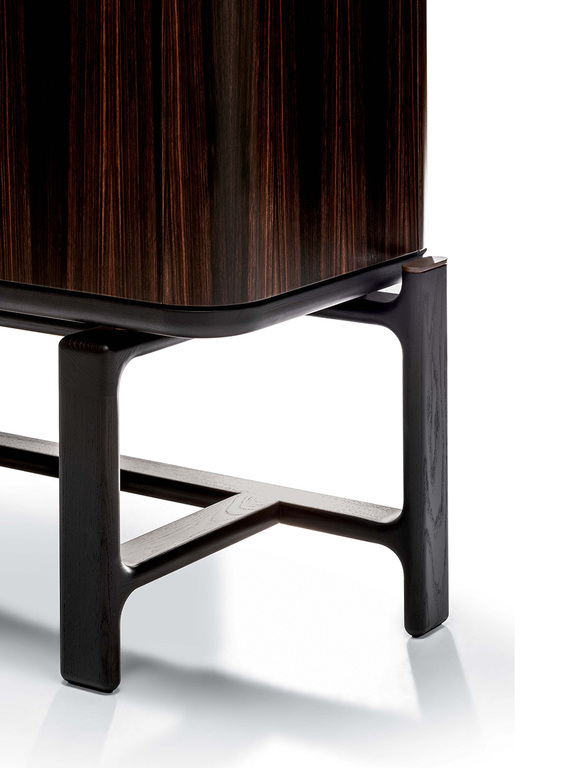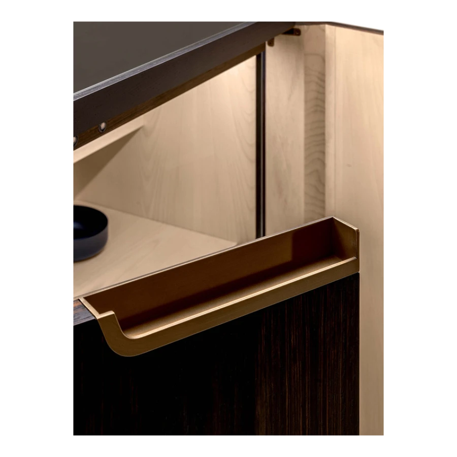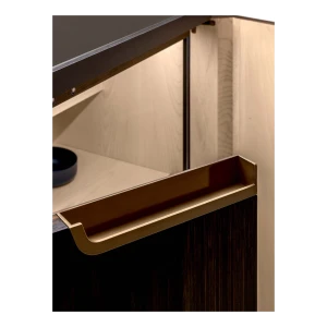 The DUO cabinet is available as high credenza and low credenza. The frame is solid ash wood stained in various finishes, while the storage unit has natural walnut, inlaid natural walnut or ebony finish. The interior is finished in maple. The handles are painted metal with a shaded bronze finish. The top is available in marble, back-painted glass or ash veneer of the same finish chosen for the frame. The feet have adjustable levelers to ensure stability on any surface. The DUO high cabinet has interior drawers with leather-covered bottoms (upon request), dividers and trays. The low sideboard has a central compartment consisting of a basket that can hold a drawer and, upon request, can be accessorized with a bottle holder. The DUO Cabinet, both high and low, can come with a LED light that turns on when the doors are opened for greater visibility of the objects inside.