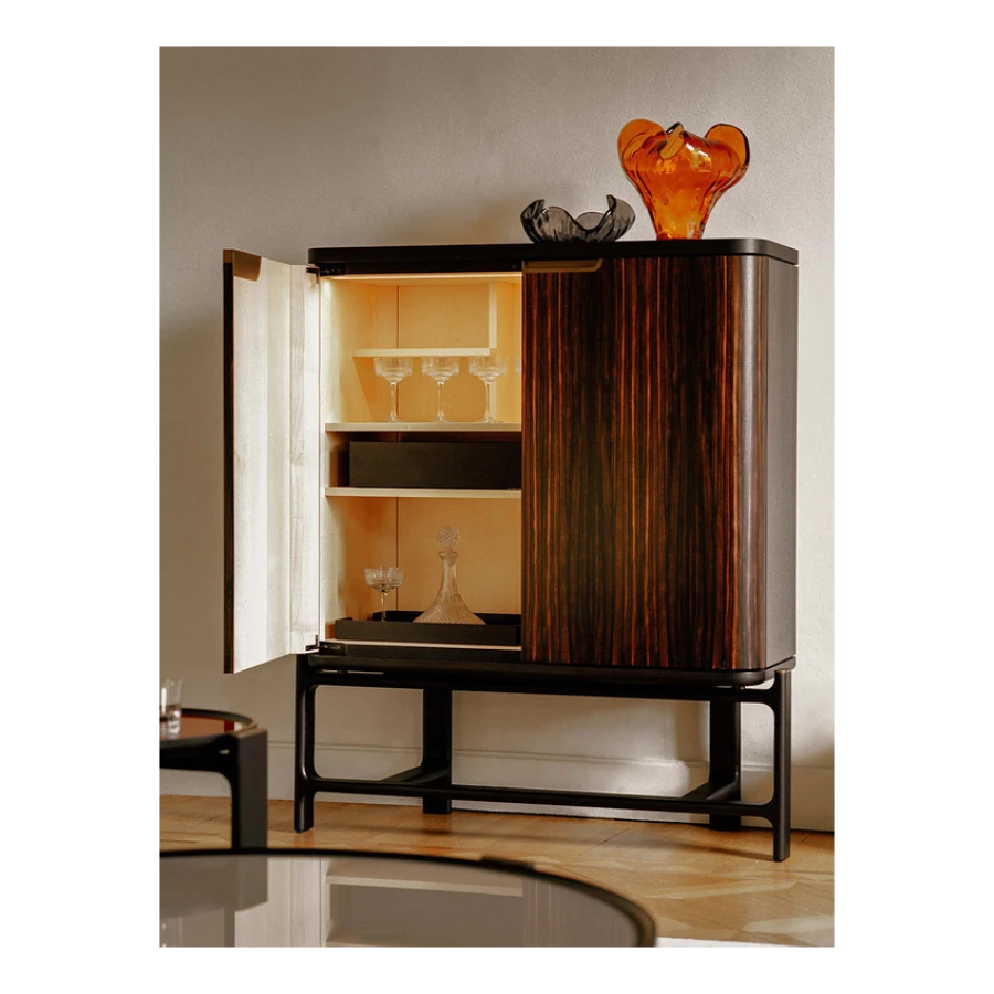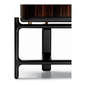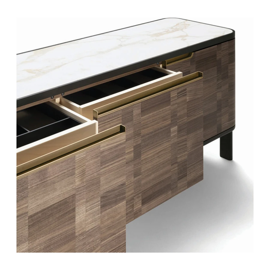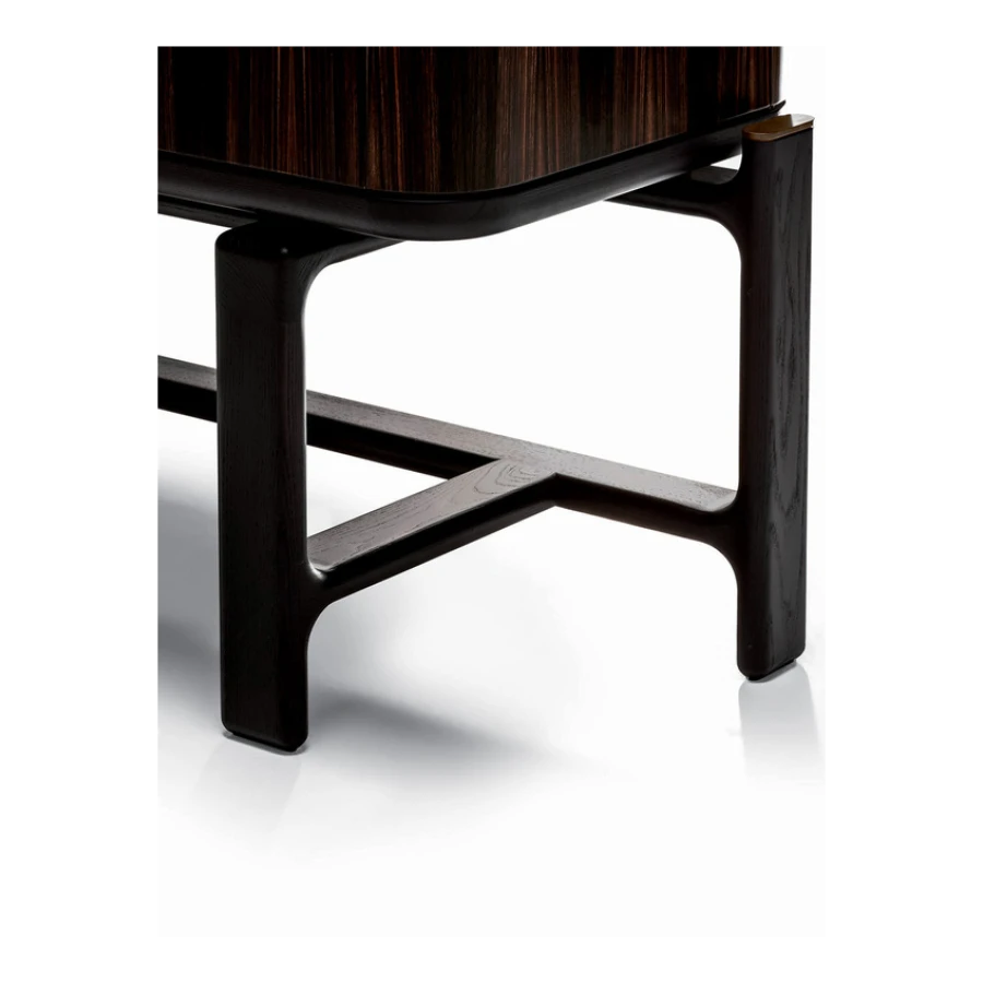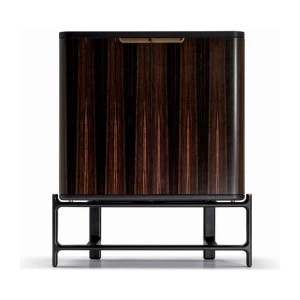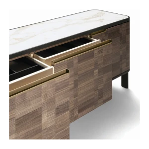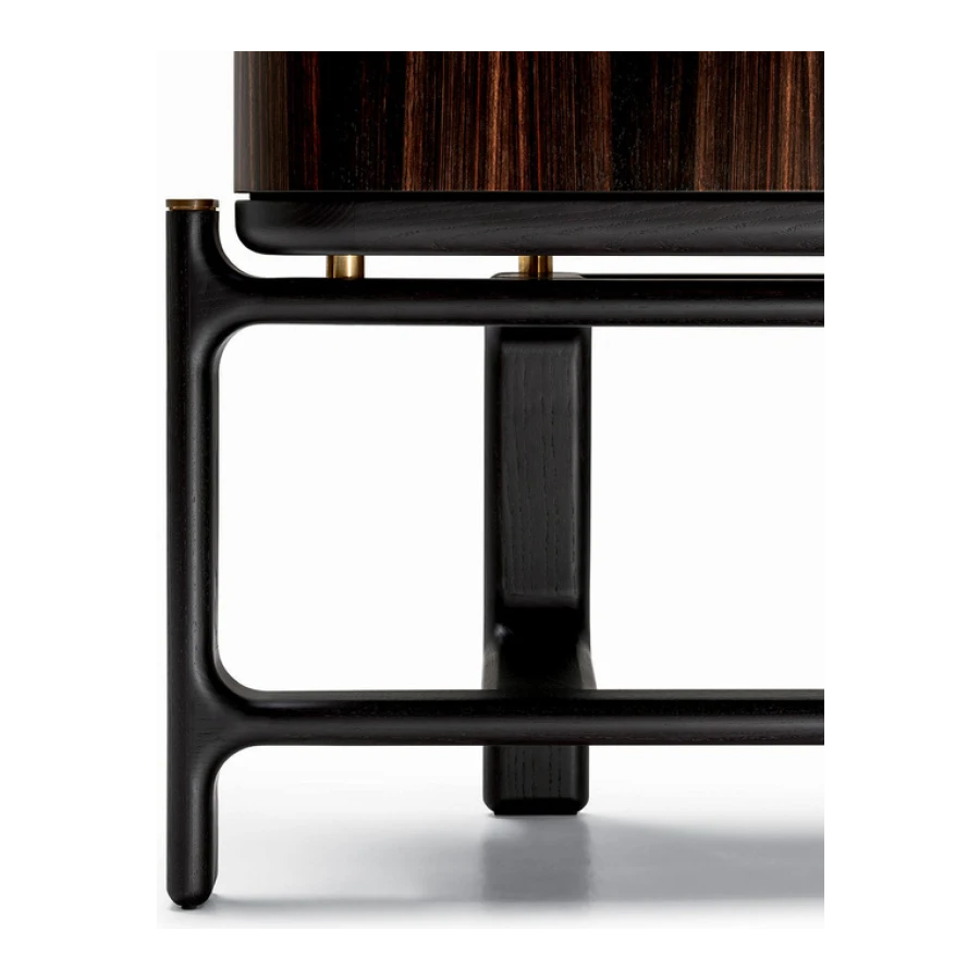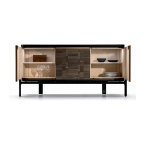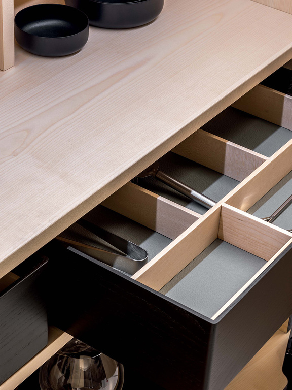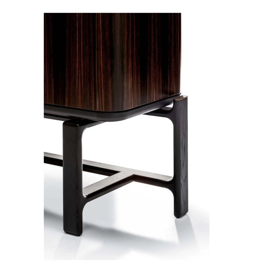 The DUO cabinet is available as high credenza and low credenza. The frame is solid ash wood stained in various finishes, while the storage unit has natural walnut, inlaid natural walnut or ebony finish. The interior is finished in maple. The handles are painted metal with a shaded bronze finish. The top is available in marble, back-painted glass or ash veneer of the same finish chosen for the frame. The feet have adjustable levelers to ensure stability on any surface. The DUO high cabinet has interior drawers with leather-covered bottoms (upon request), dividers and trays. The low sideboard has a central compartment consisting of a basket that can hold a drawer and, upon request, can be accessorized with a bottle holder. The DUO Cabinet, both high and low, can come with a LED light that turns on when the doors are opened for greater visibility of the objects inside.