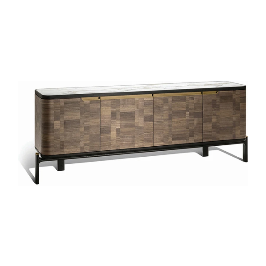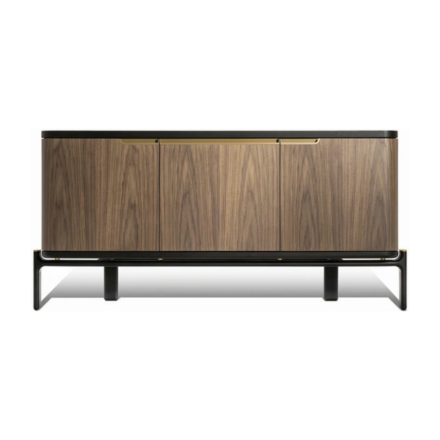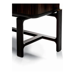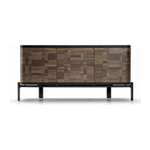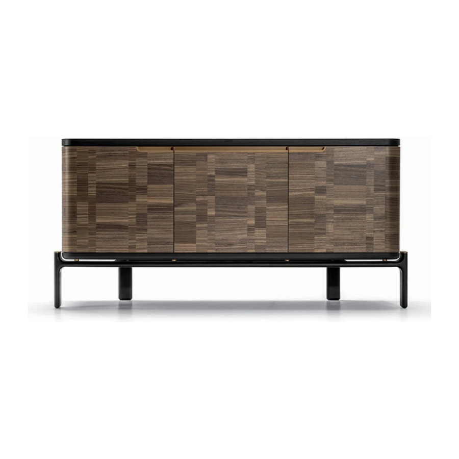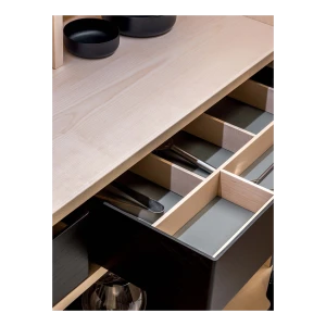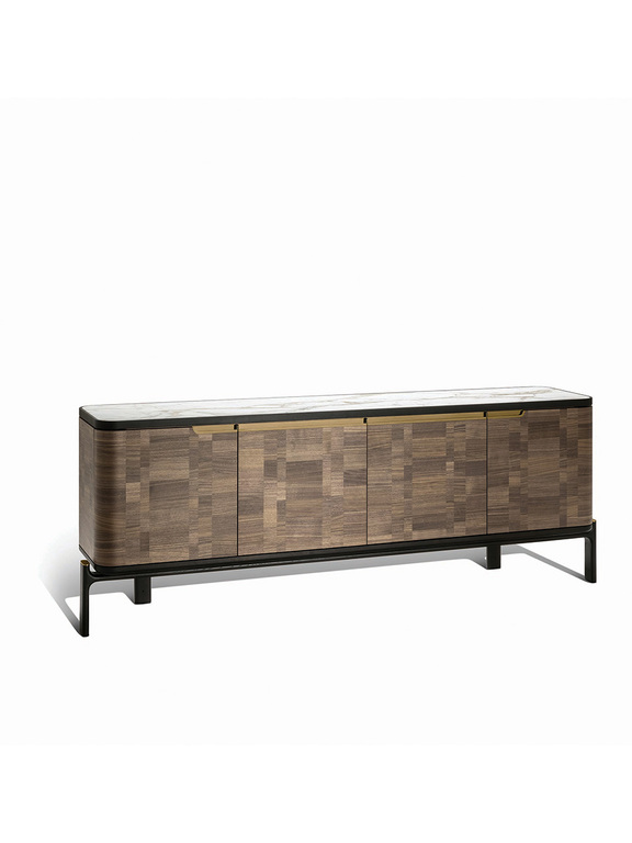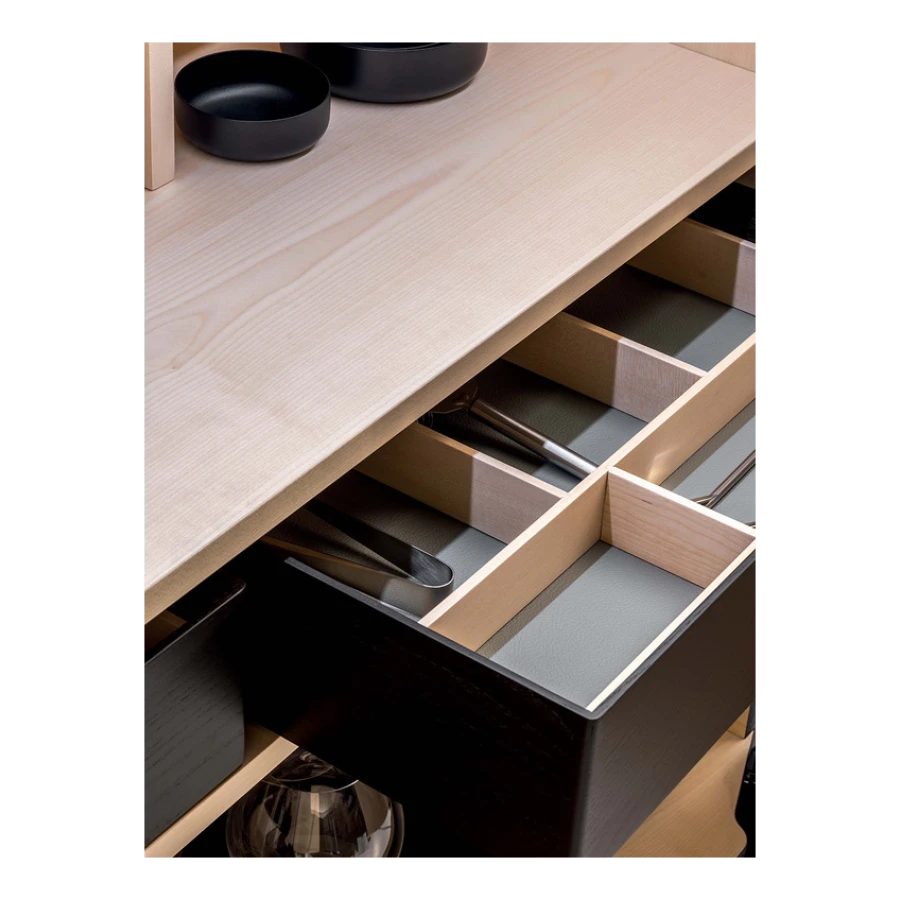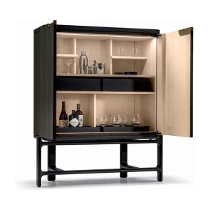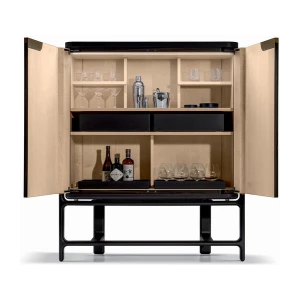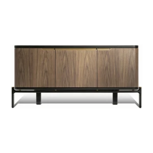 The DUO cabinet is available as high credenza and low credenza. The frame is solid ash wood stained in various finishes, while the storage unit has natural walnut, inlaid natural walnut or ebony finish. The interior is finished in maple. The handles are painted metal with a shaded bronze finish. The top is available in marble, back-painted glass or ash veneer of the same finish chosen for the frame. The feet have adjustable levelers to ensure stability on any surface. The DUO high cabinet has interior drawers with leather-covered bottoms (upon request), dividers and trays. The low sideboard has a central compartment consisting of a basket that can hold a drawer and, upon request, can be accessorized with a bottle holder. The DUO Cabinet, both high and low, can come with a LED light that turns on when the doors are opened for greater visibility of the objects inside.