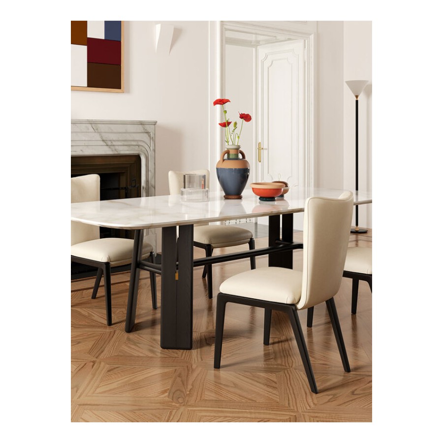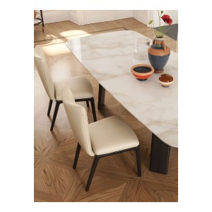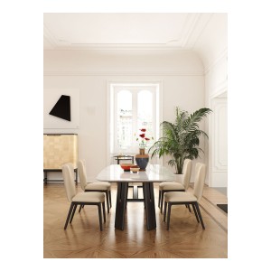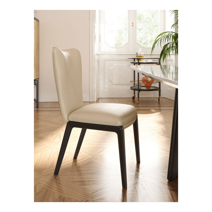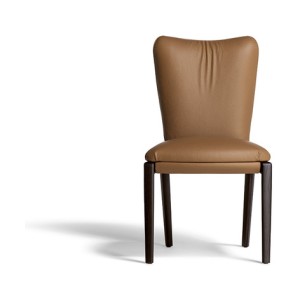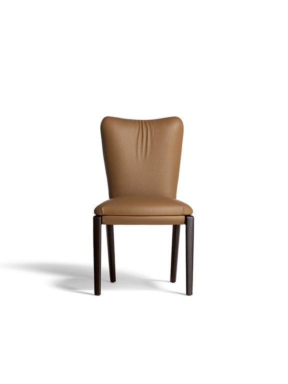 The DUO dining chair features a high back and comfortable, luxuriously upholstered seat fully covered in Pelle Frau® leather or fabric, enhancing comfort and inviting relaxation and conversation. The solid ash wood legs are available in various finishes.
