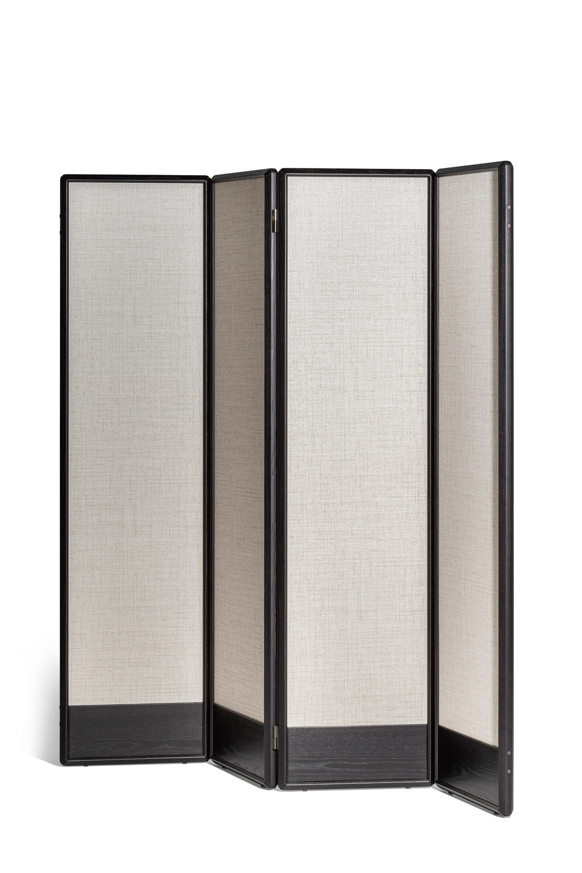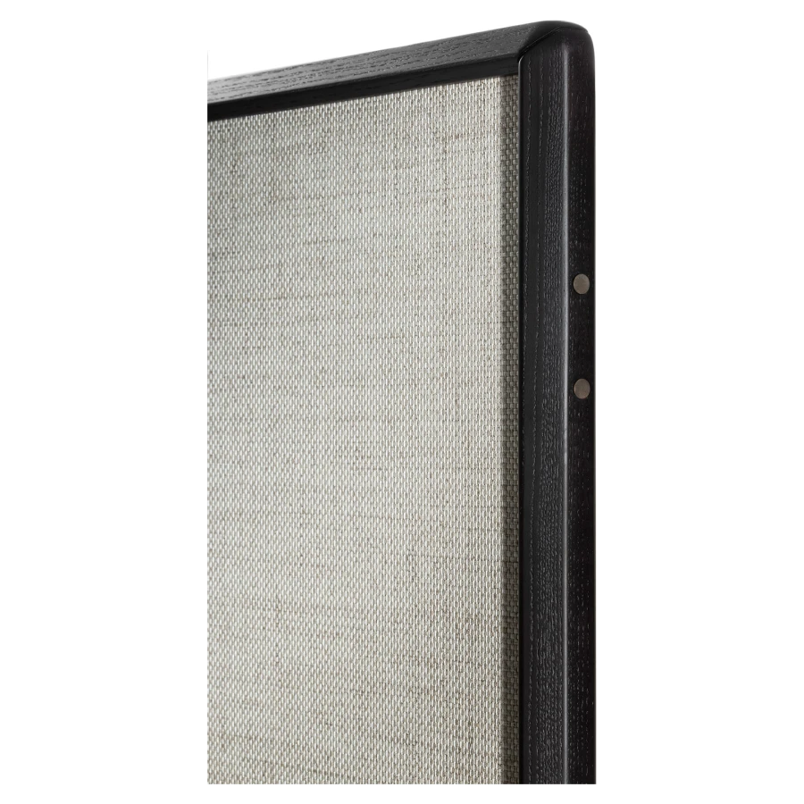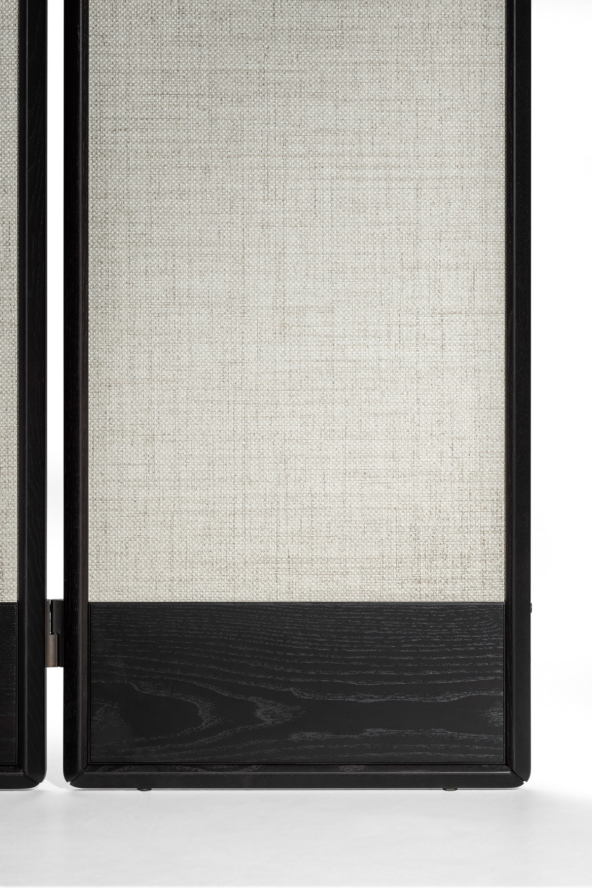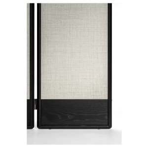 The DUO screen consists of 3, 4 or 5 modules with a height of 180 cm, a solid ash wood frame in various finishes and a hollow-core panel. The screen is fully customizable: it is possible to select for the modules either a wallpaper or, upon request, fabric or leather. In addition, the modules can have the two sides with different finishes. The screen feet are adjustable in height thanks to levelers. The metal details are finished in bronzed brass.
