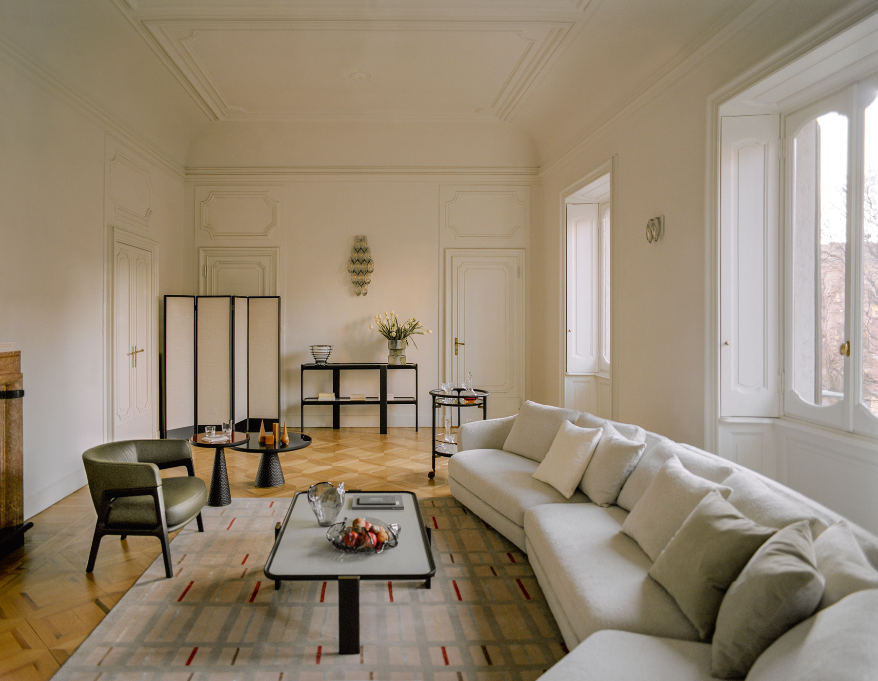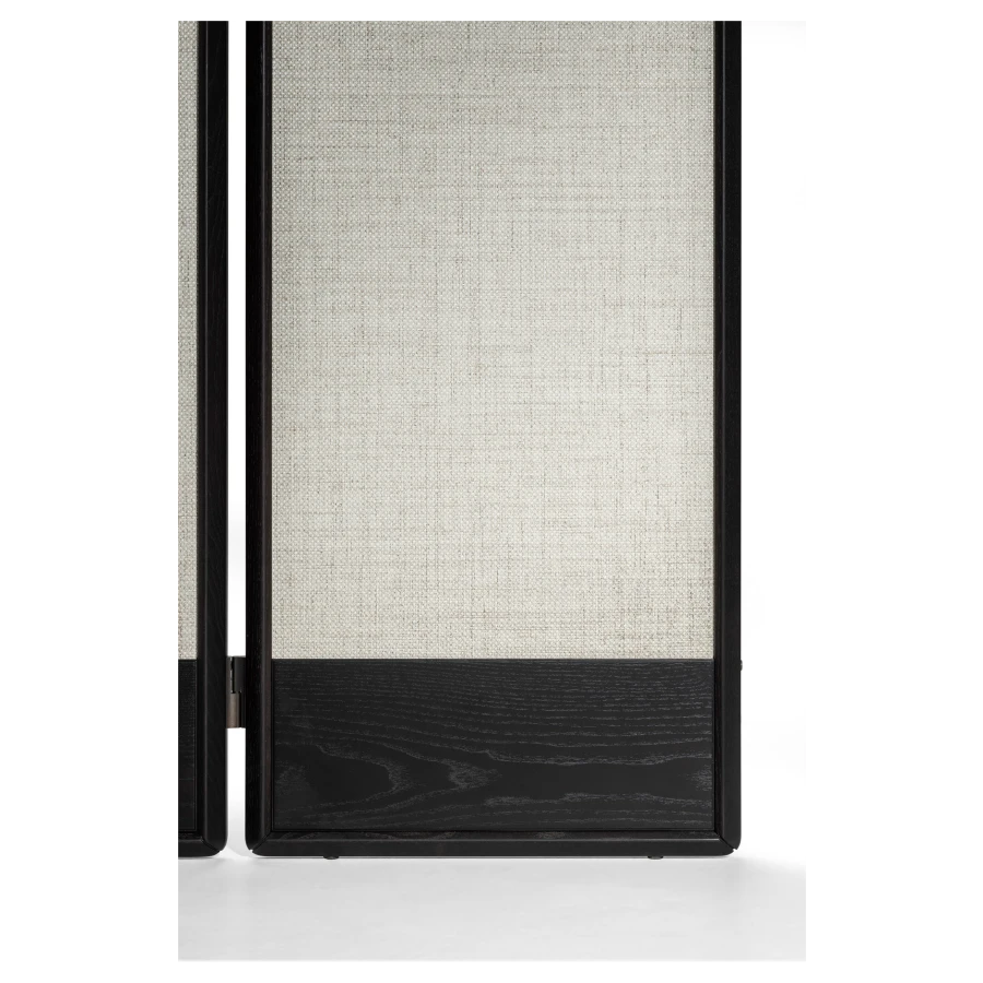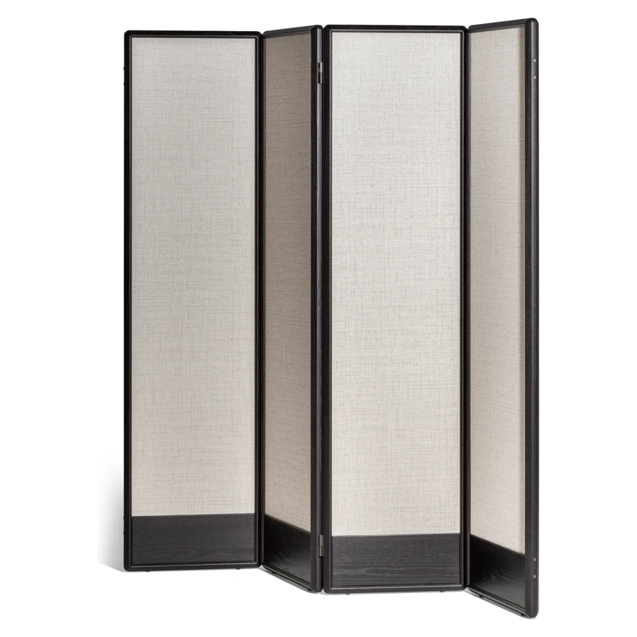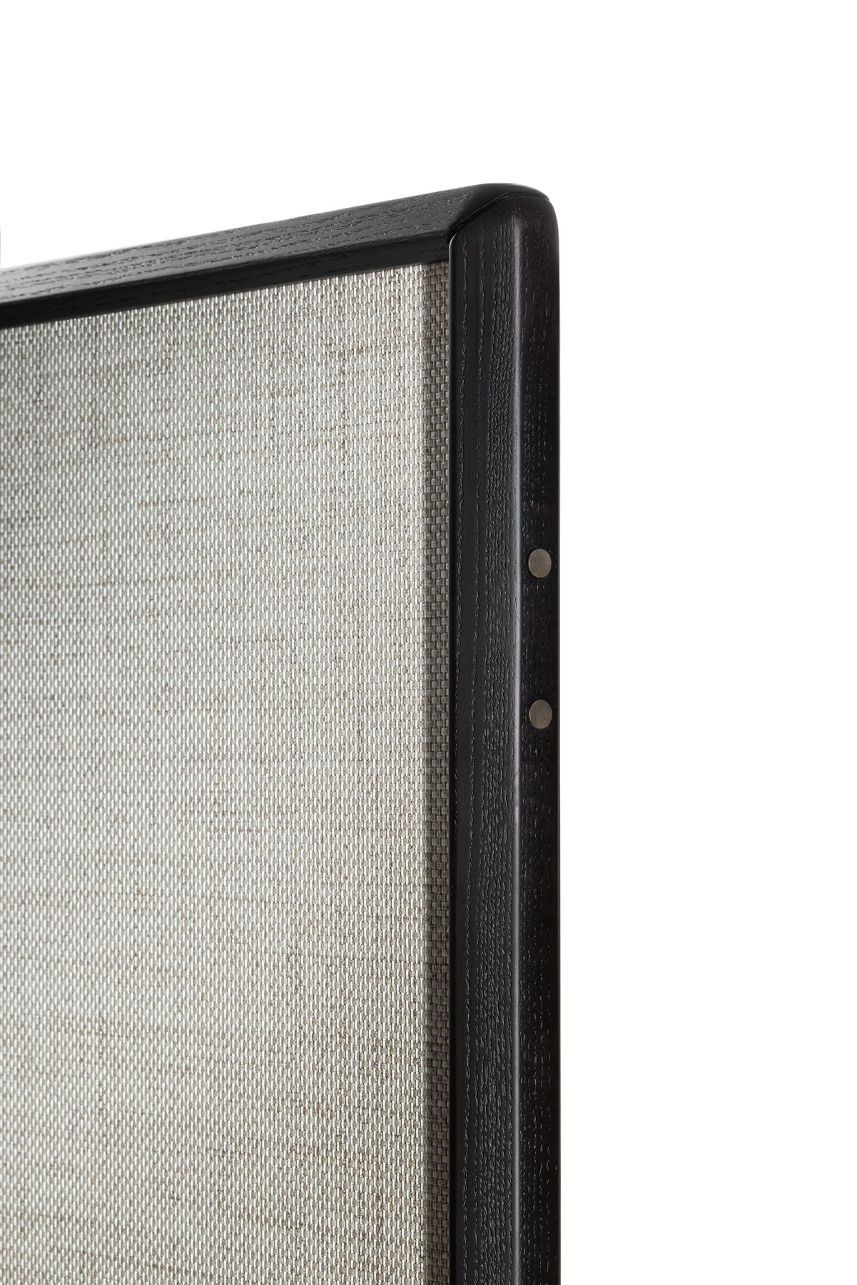 The DUO screen consists of 3, 4 or 5 modules with a height of 180 cm, a solid ash wood frame in various finishes and a hollow-core panel. The screen is fully customizable: it is possible to select for the modules either a wallpaper or, upon request, fabric or leather. In addition, the modules can have the two sides with different finishes. The screen feet are adjustable in height thanks to levelers. The metal details are finished in bronzed brass.