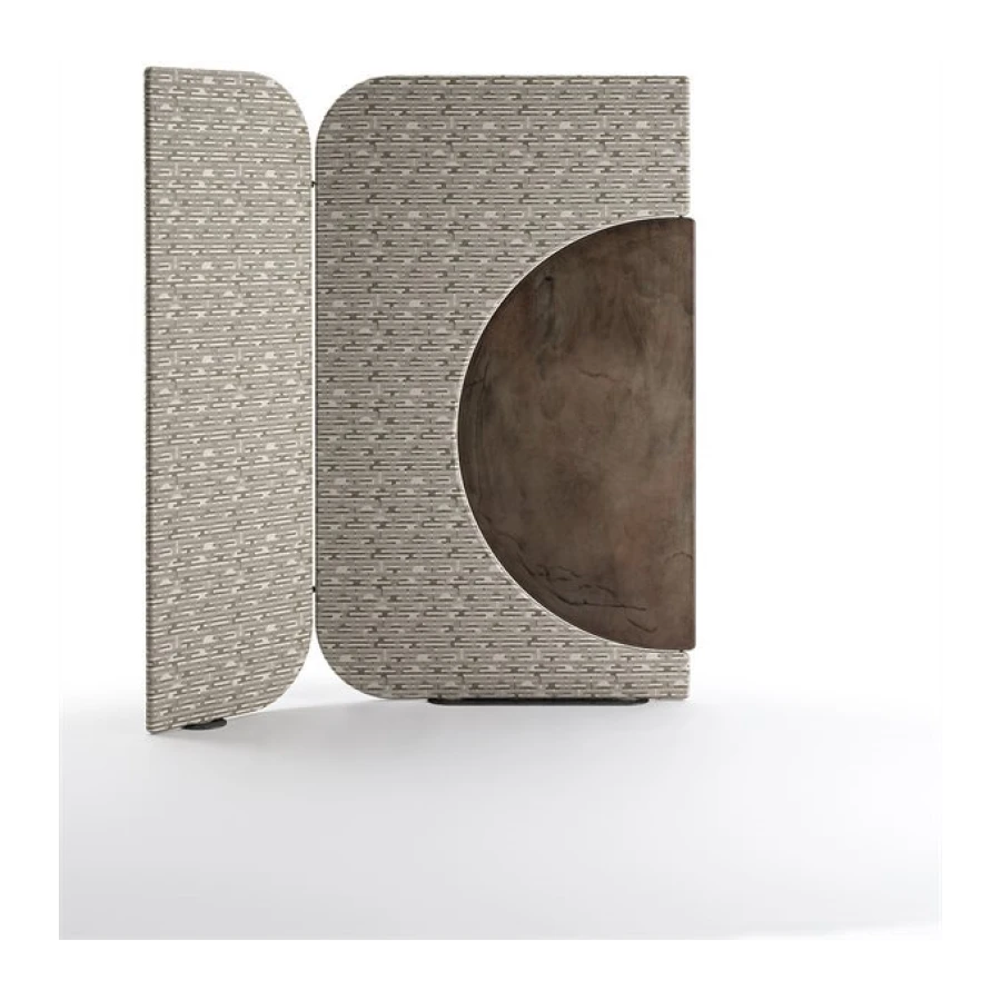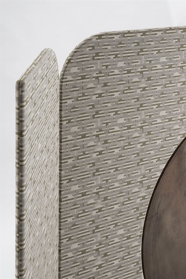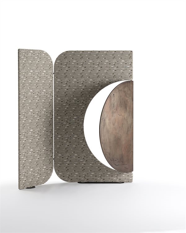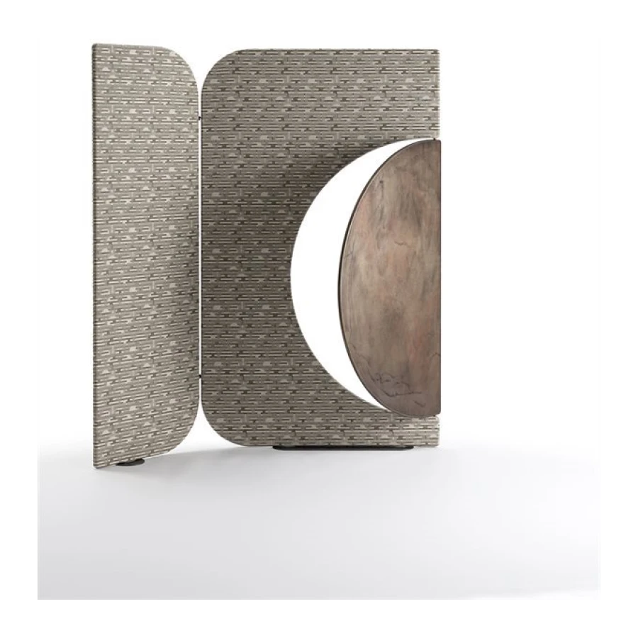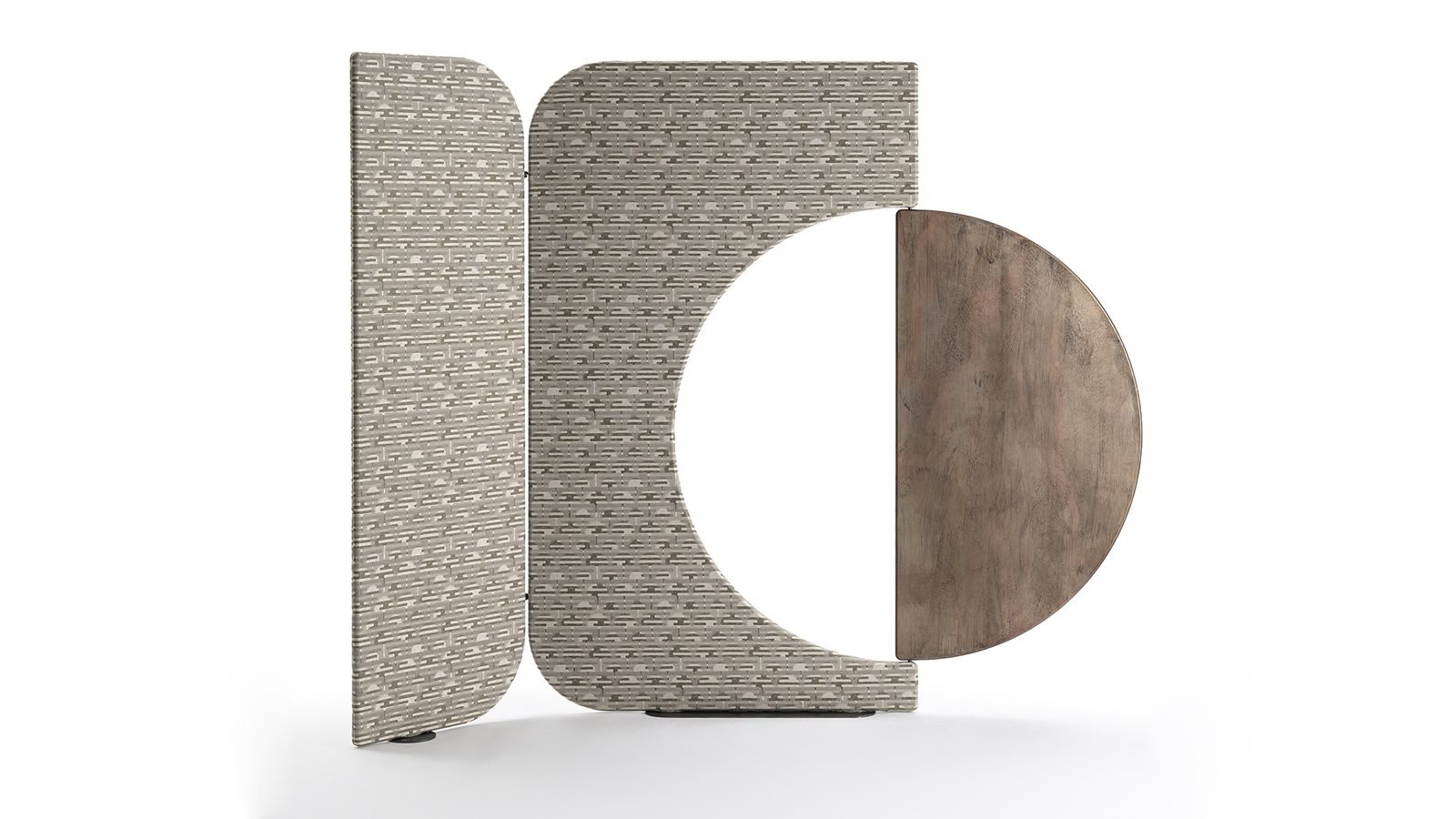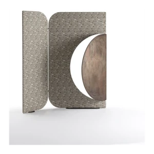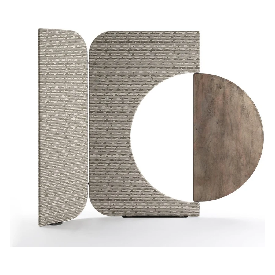 Screen composed of two wooden panels covered by Utopia silver 101 fabric or by Sagi silver 022 fabric and of a movable crescent-shaped wooden panel decorated with “burnished effect”. Metal feet lacquered in the “fango” colour. Not removable cover.