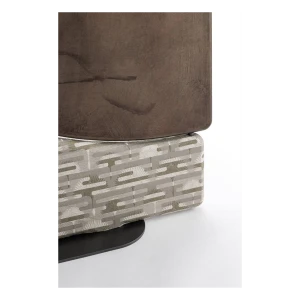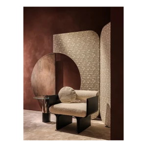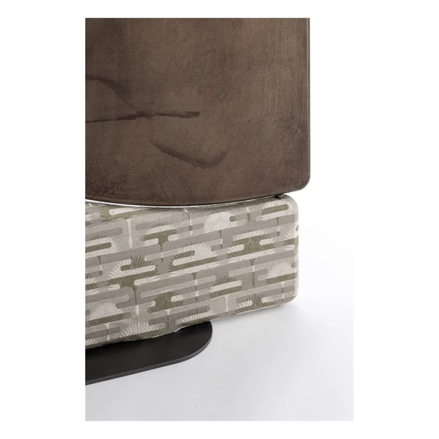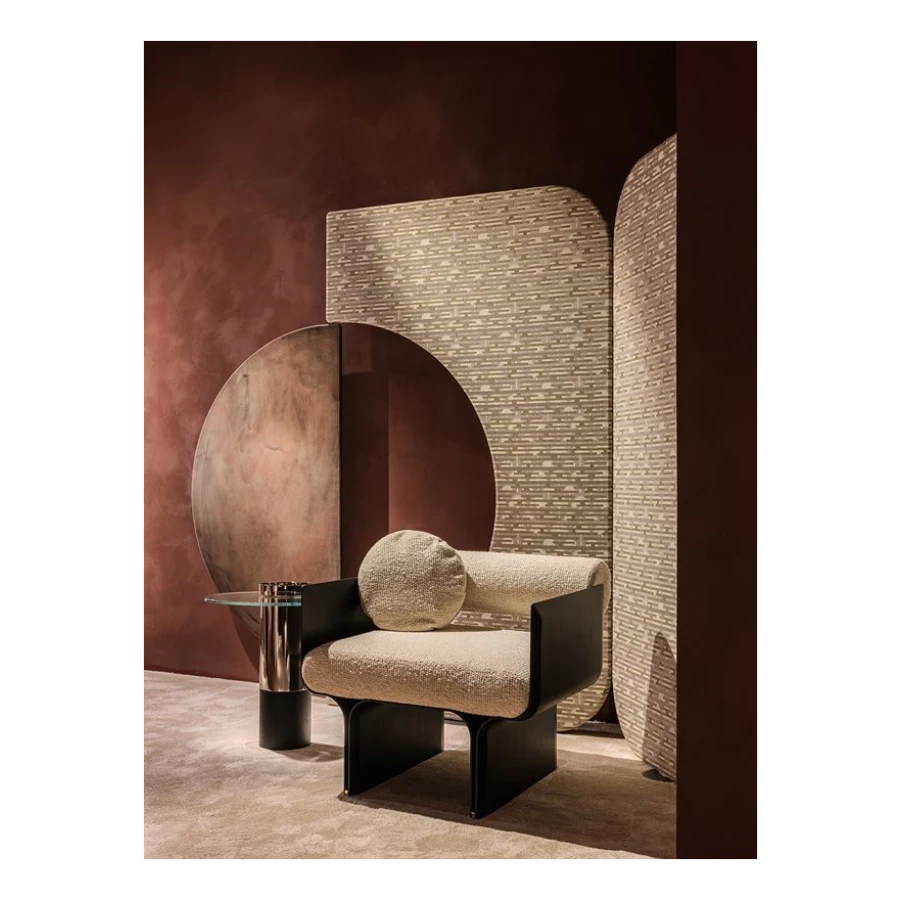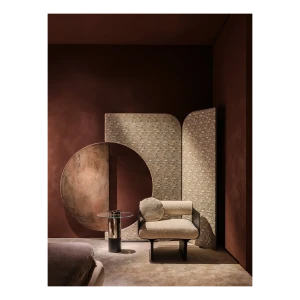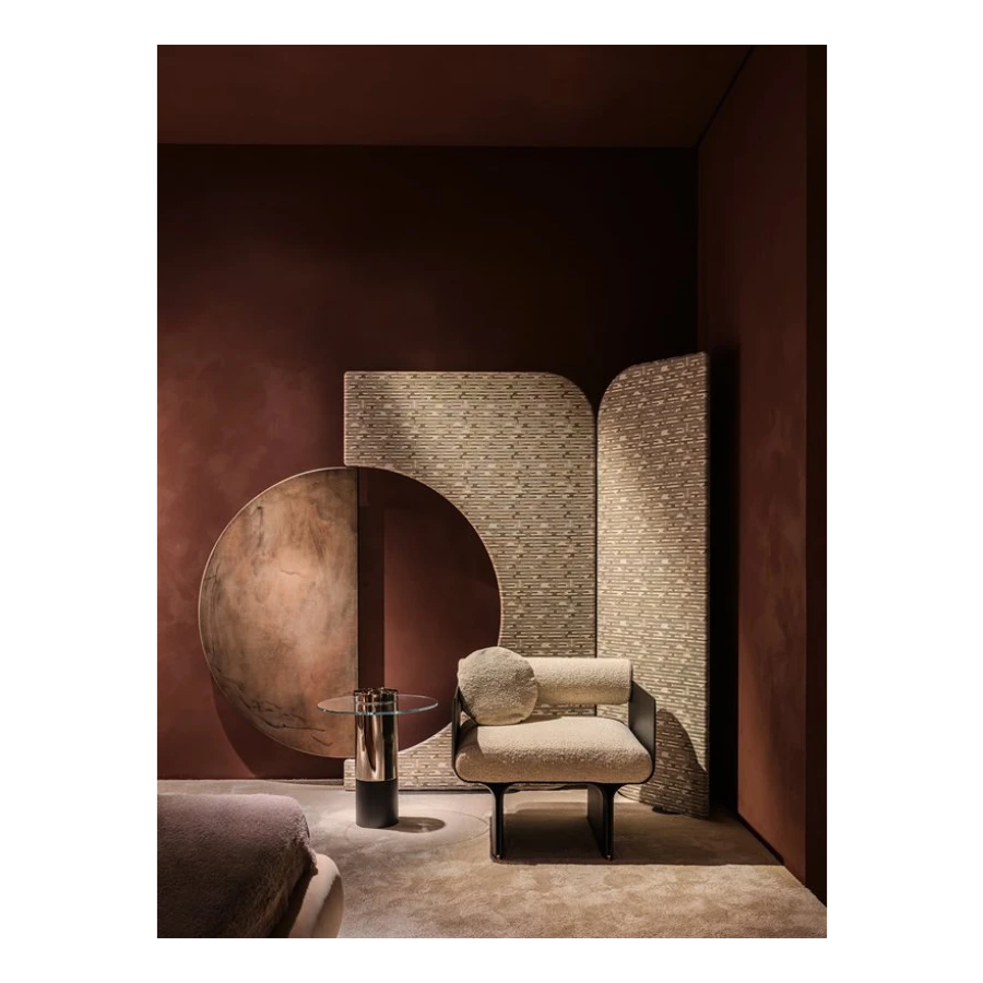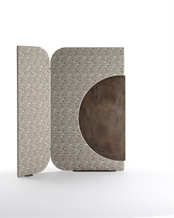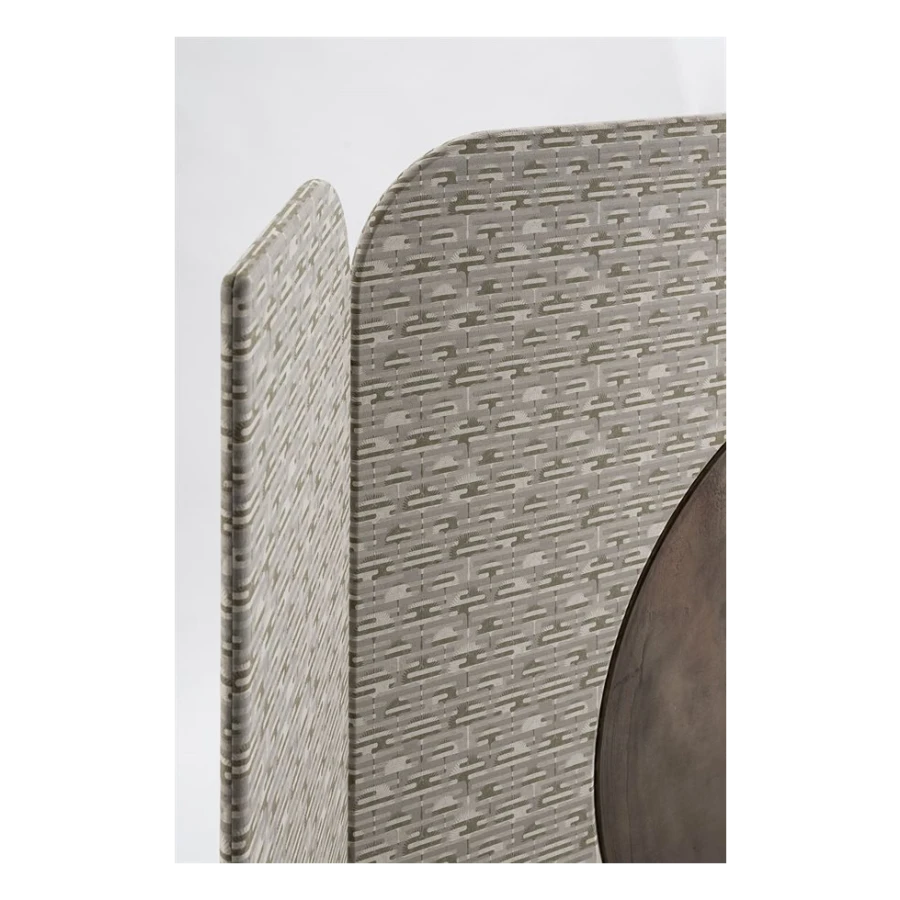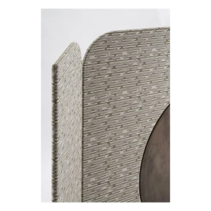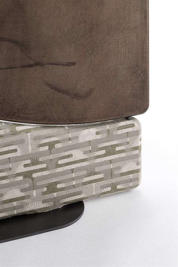 Screen composed of two wooden panels covered by Utopia silver 101 fabric or by Sagi silver 022 fabric and of a movable crescent-shaped wooden panel decorated with “burnished effect”. Metal feet lacquered in the “fango” colour. Not removable cover.