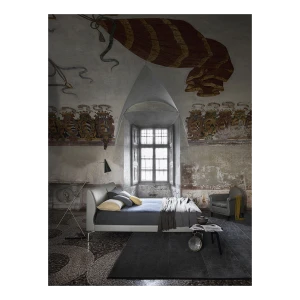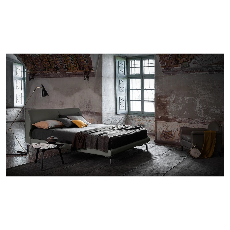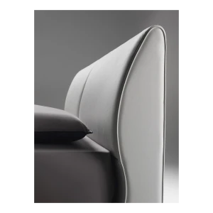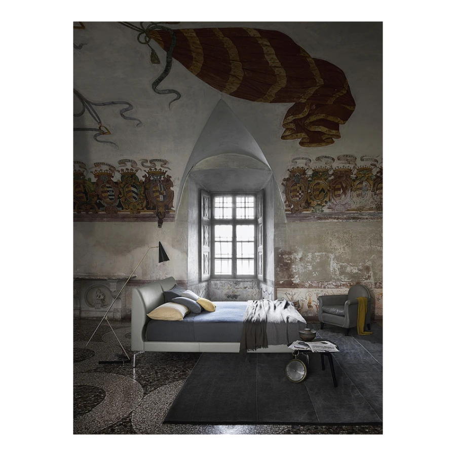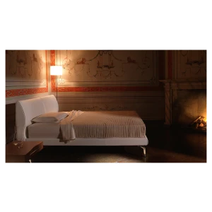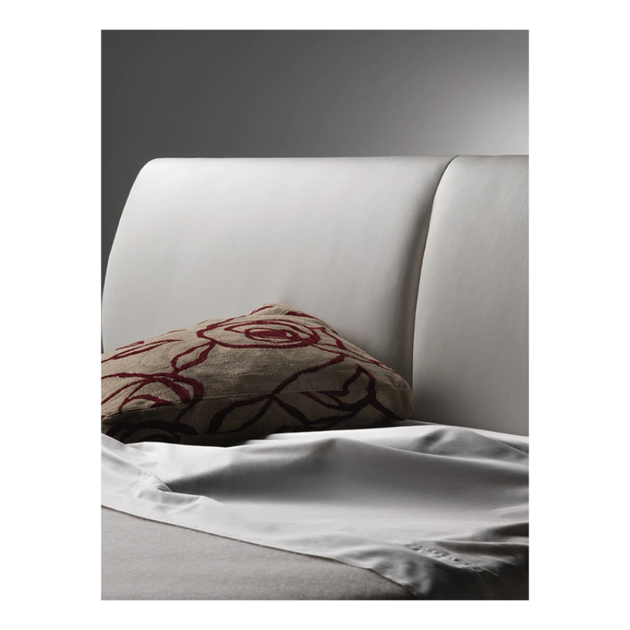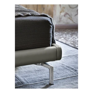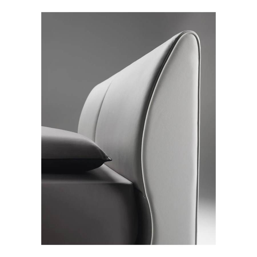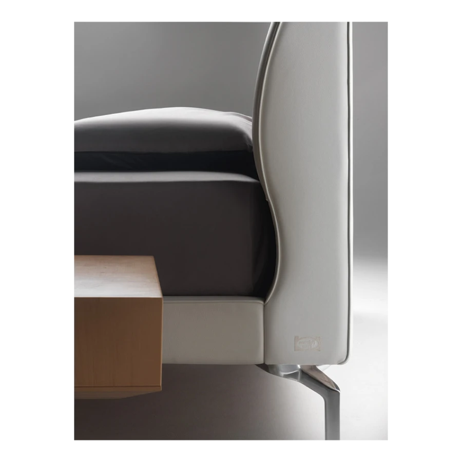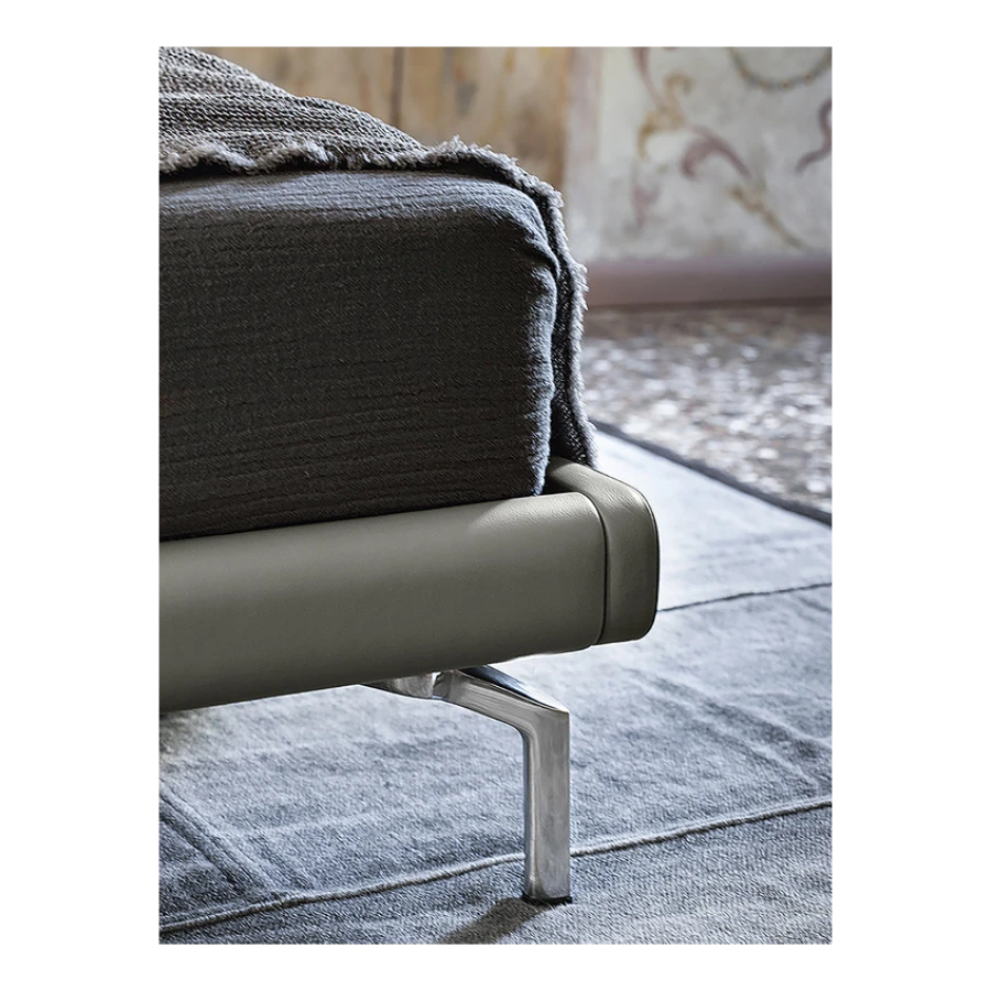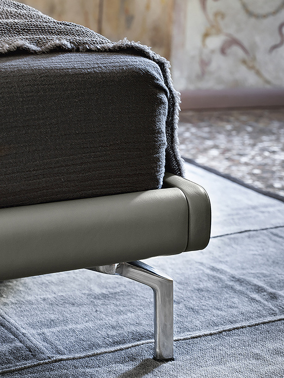 The headboard of the Eosonno bed is made from seasoned beechwood with padding in polyurethane foam and dacron. The base is composed of spruce blockboard for the sides and poplar plywood for the footboard. The upholstery is in soft Pelle Frau® leather. The feet are available with polished aluminium or brushed aluminium colour finishes, or covered with 60 mm diameter leather.