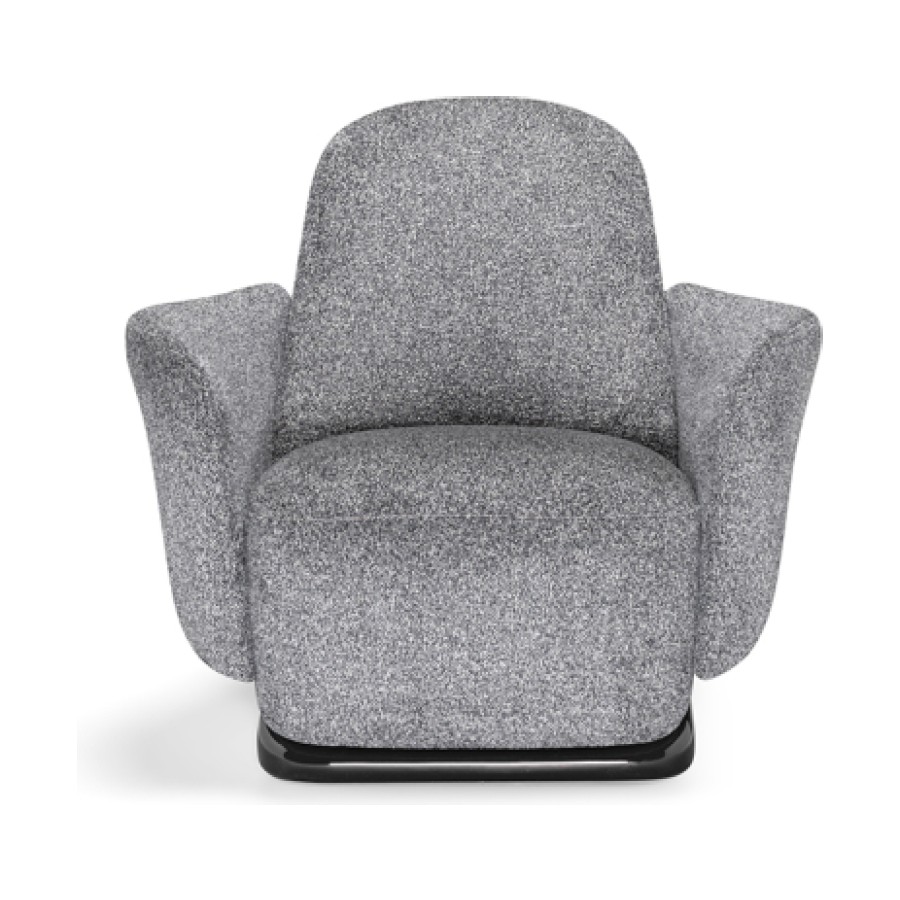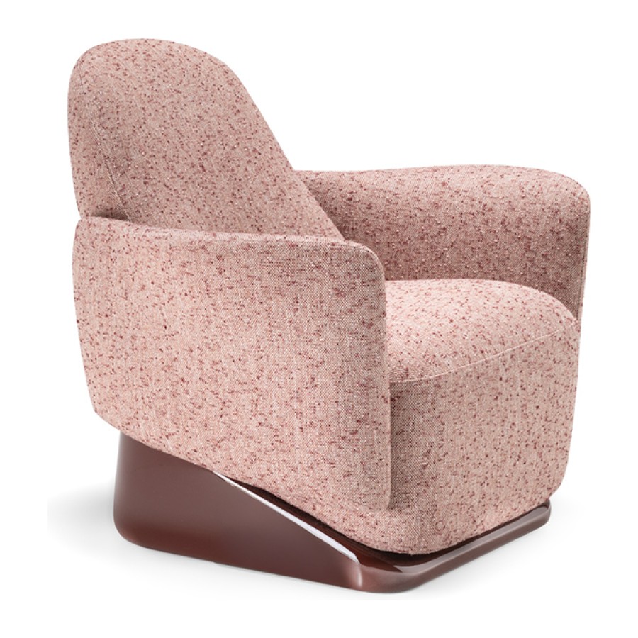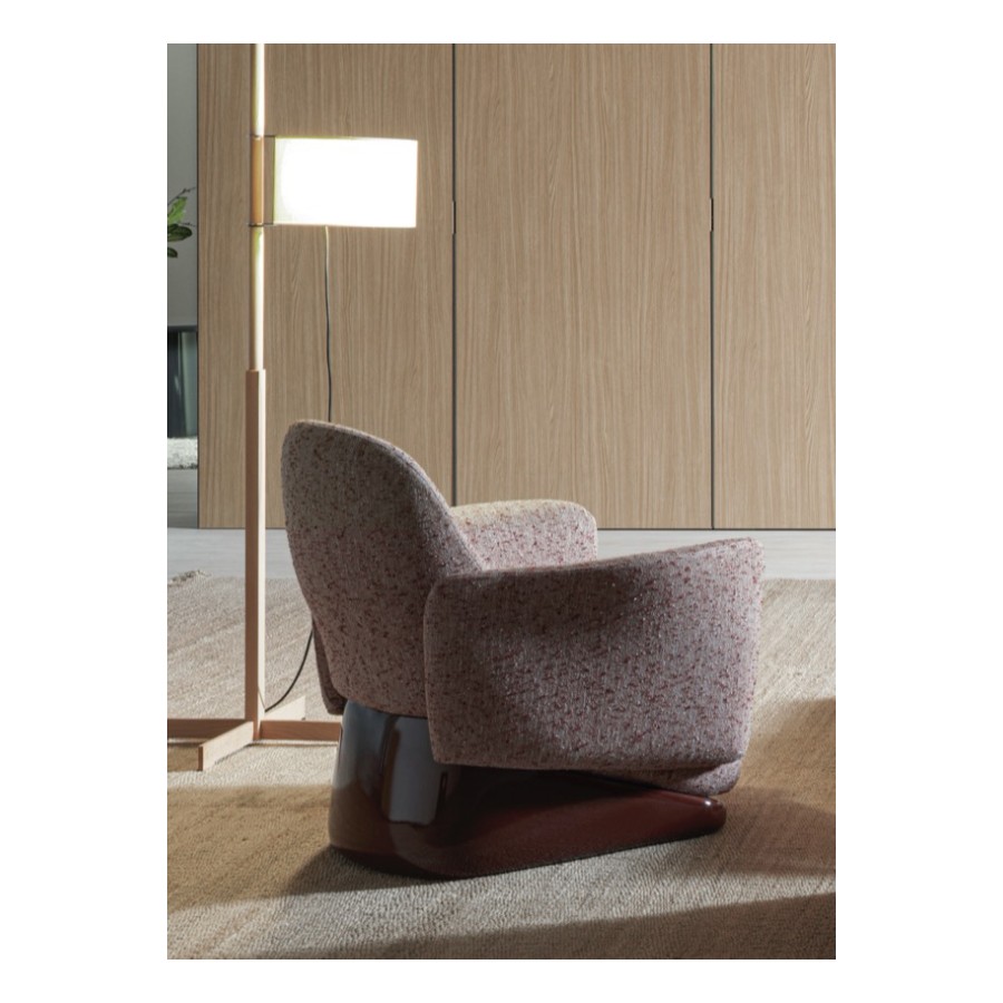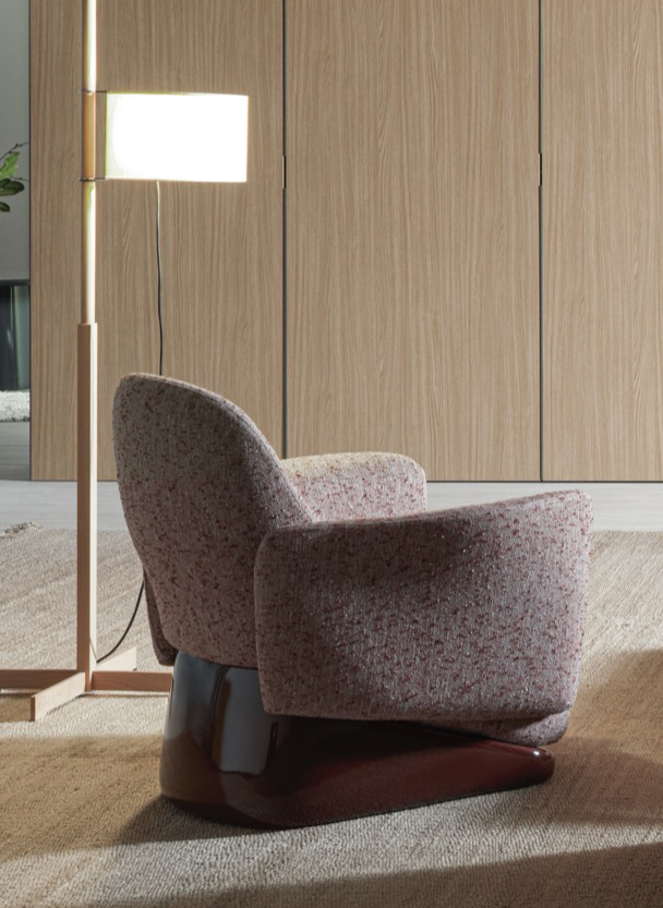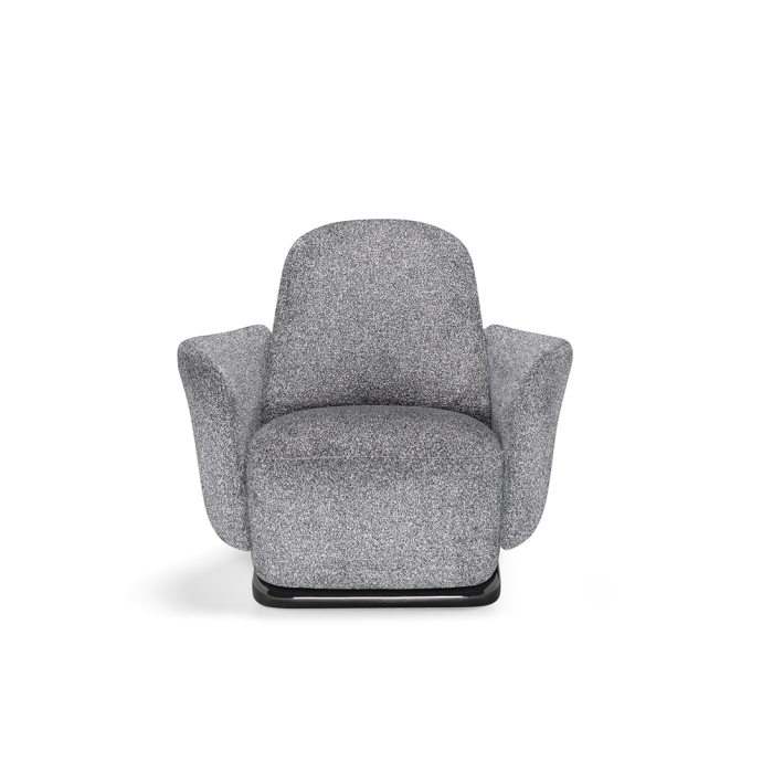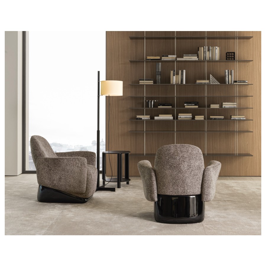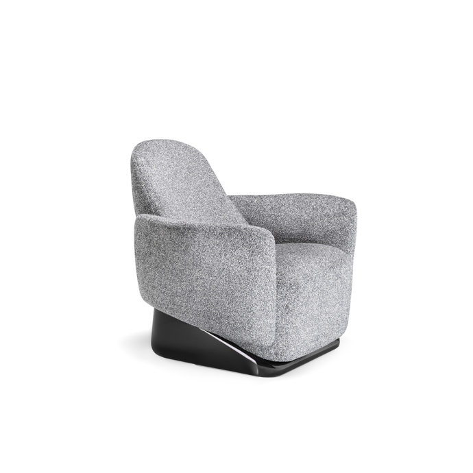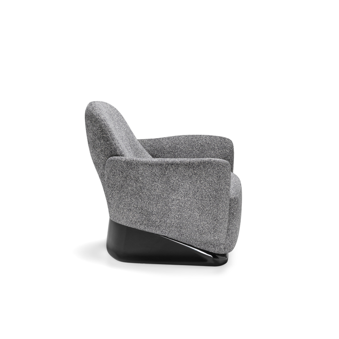The armchair’s design deconstructs traditional comfort, reimagining its components with invisible joints that create a seamless integration of form and function. Its solid, yet lightweight profile is perfectly complemented by a sleek base finished in glossy lacquer, accentuating its clean, linear design.