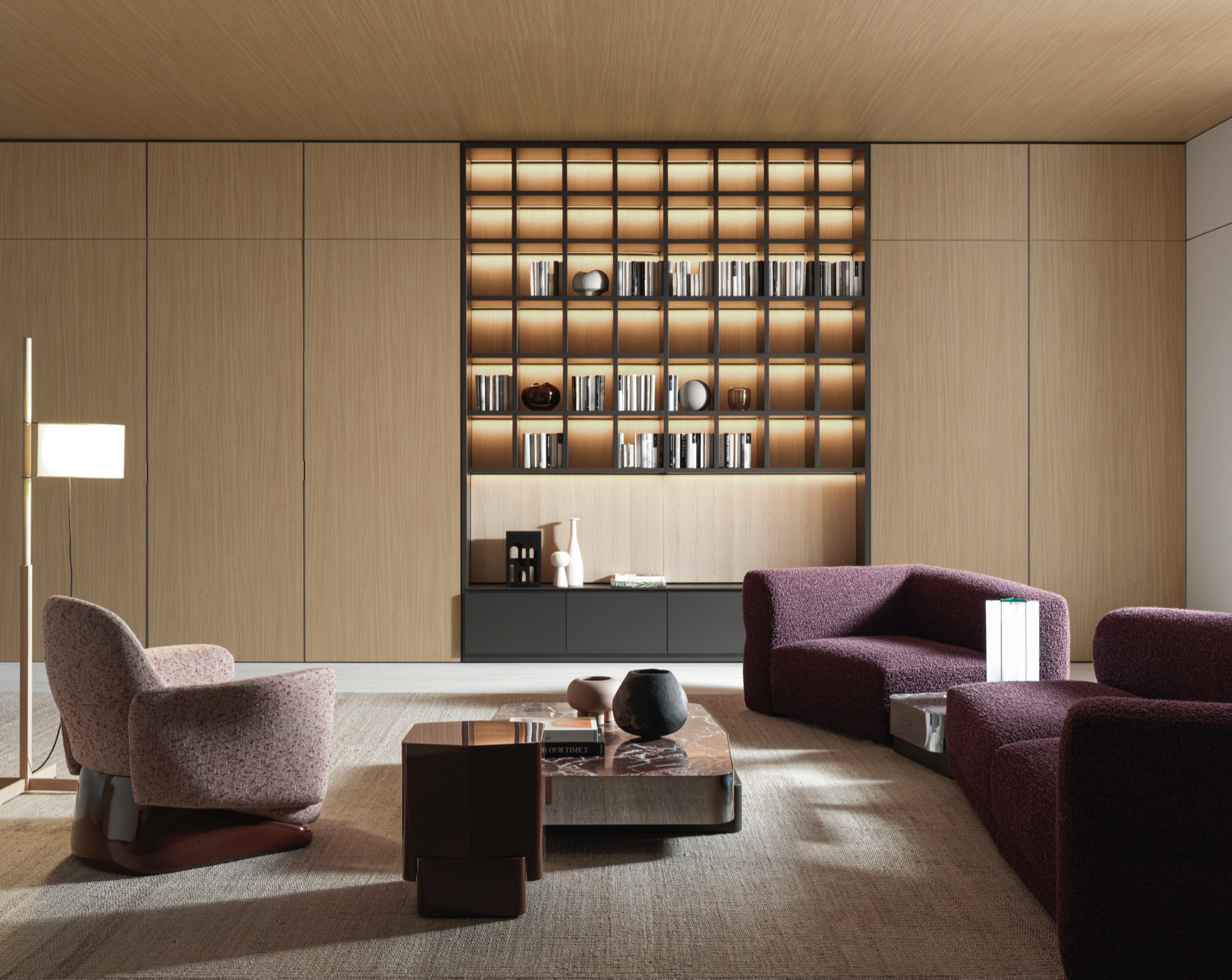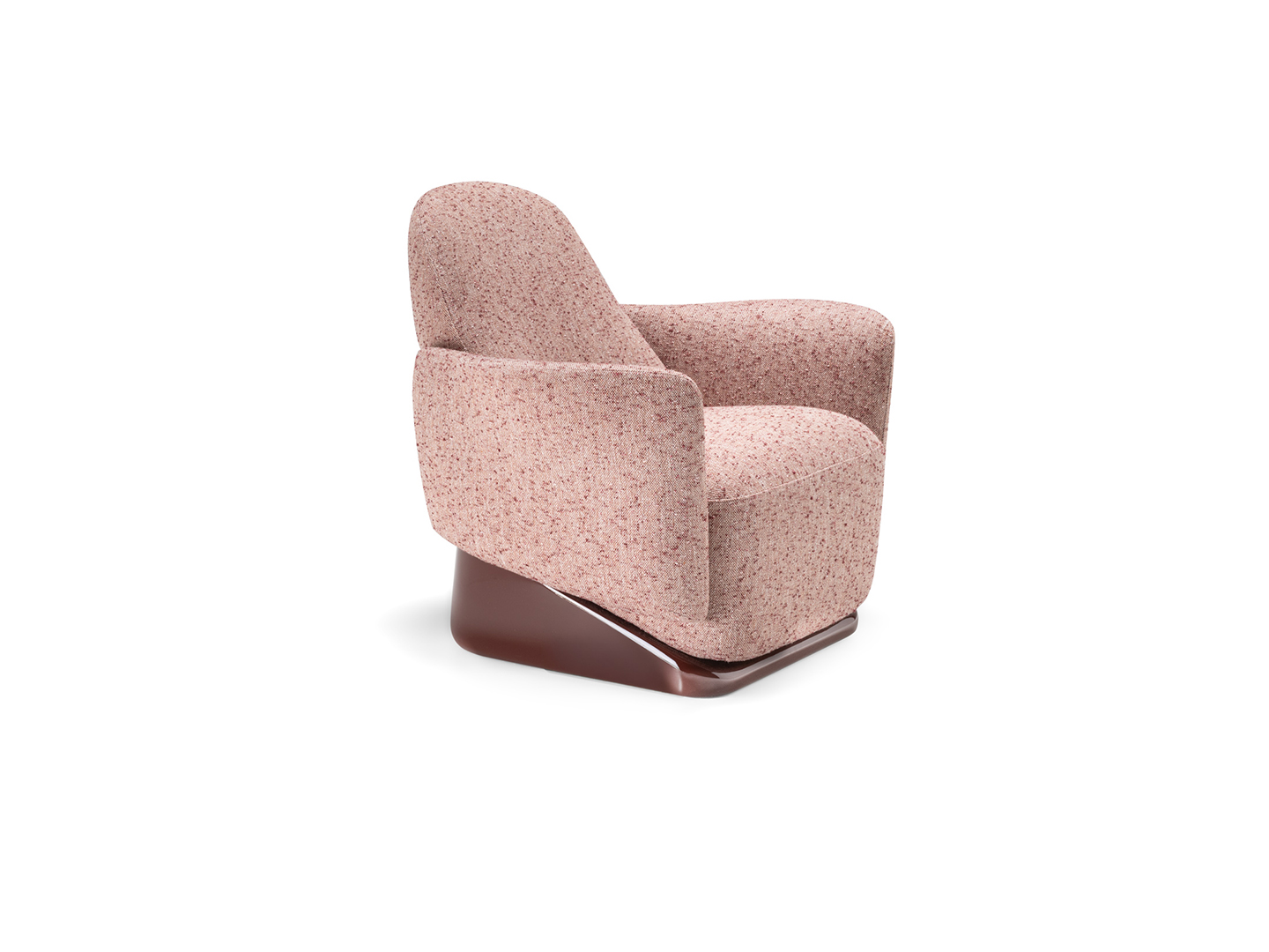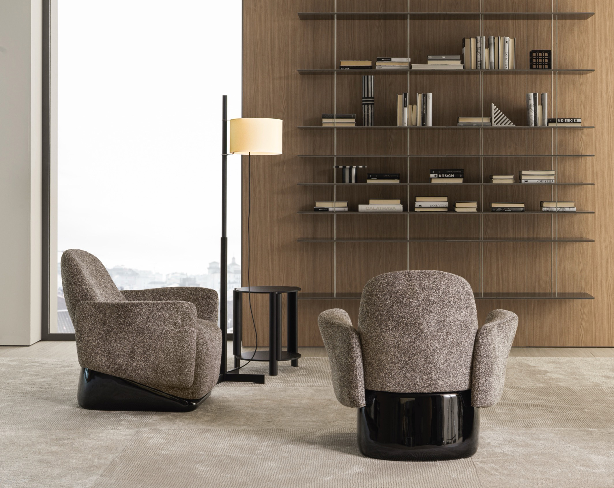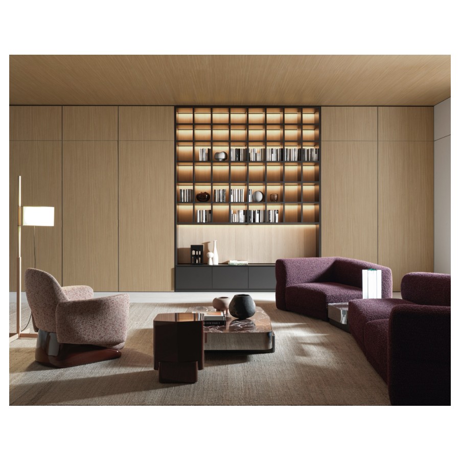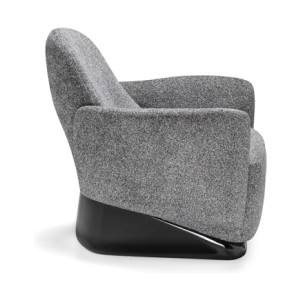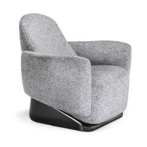 The armchair’s design deconstructs traditional comfort, reimagining its components with invisible joints that create a seamless integration of form and function. Its solid, yet lightweight profile is perfectly complemented by a sleek base finished in glossy lacquer, accentuating its clean, linear design.