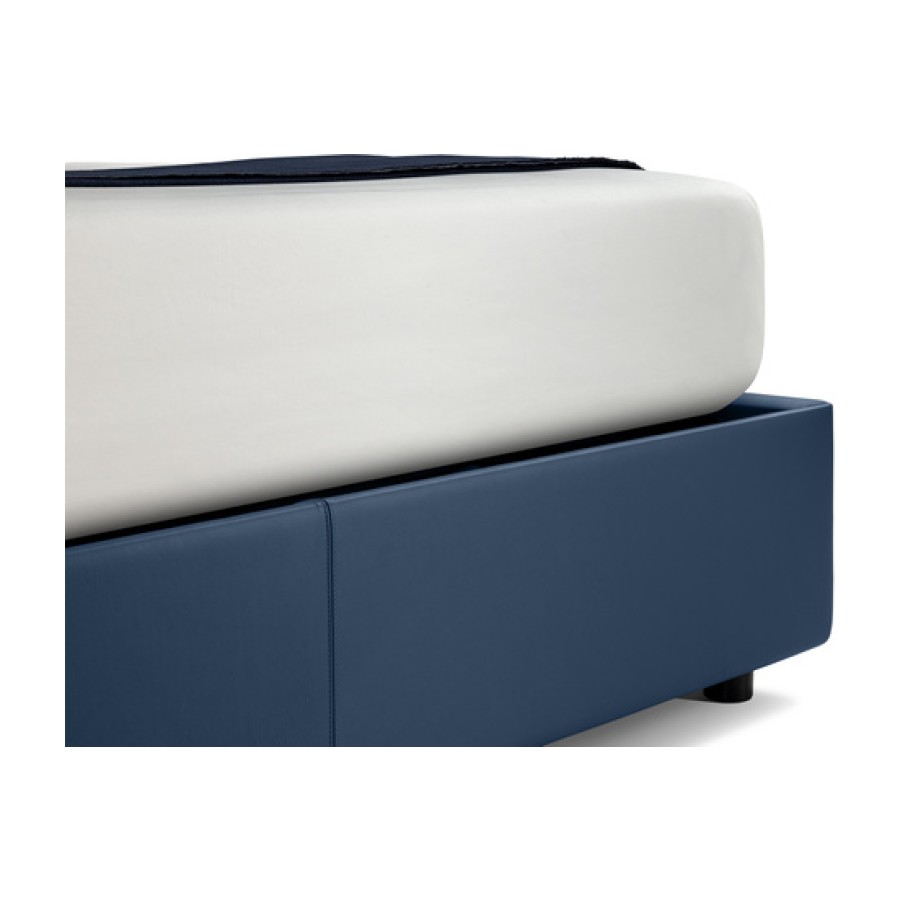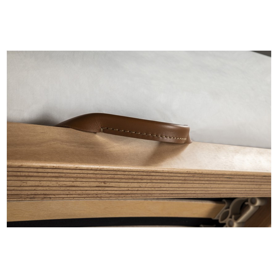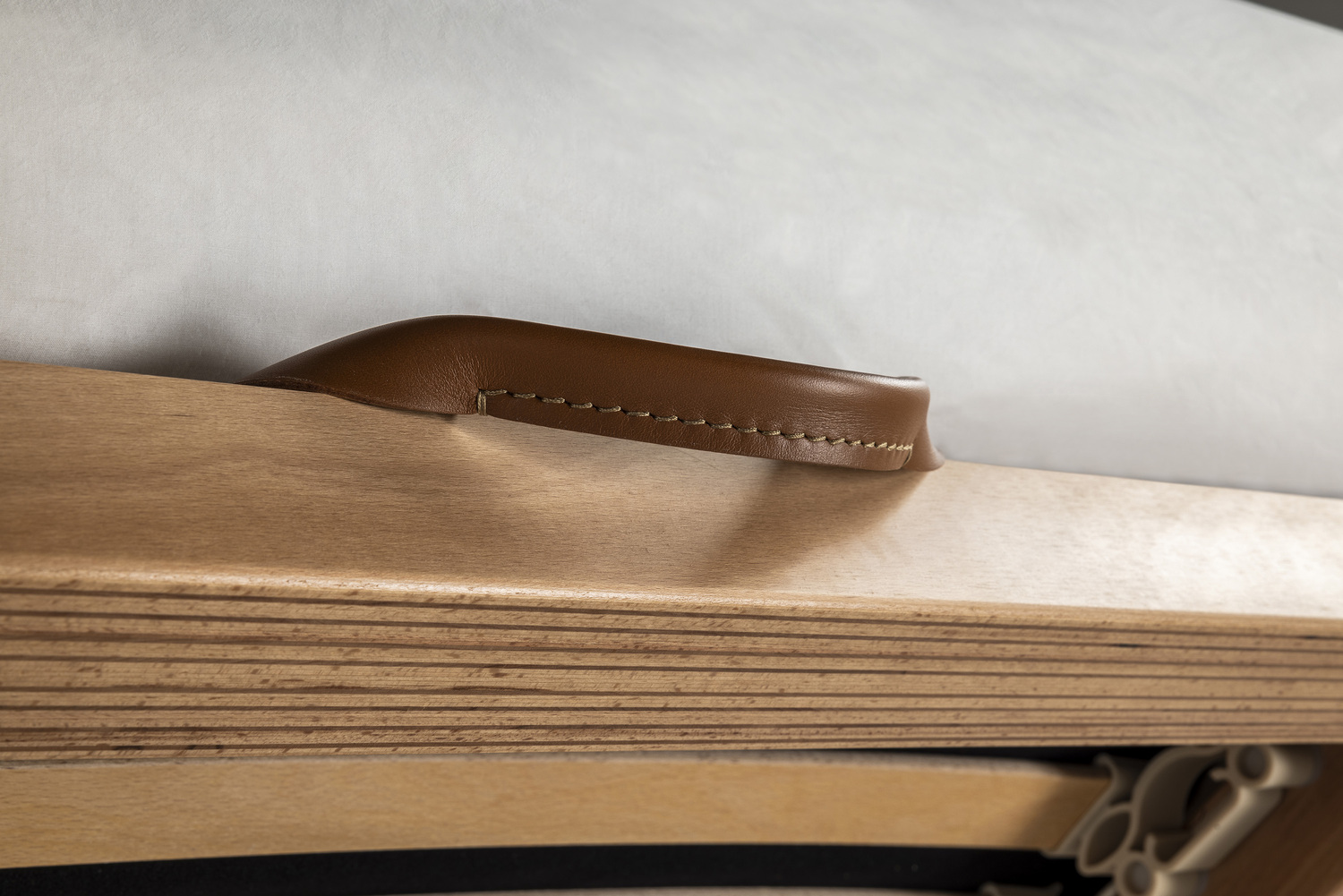 The frame of the Ferdinandea bed with storage unit is made of poplar plywood with light polyurethane foam padding upholstered in Pelle Frau® leather and delicate matching tone-on-tone stitching. The cylindrical feet are in black painted metal. The support surface of the storage compartment is made with raw chipboard panels, laminated with a melamine decorative finish that imitates the “Linen” effect in the color Ecru on both sides, and with an edge matching the decorative finish. The lifting mechanism to access the storage unit requires a single opening movement through two leather handles, positioned on the side of the footboard, which lifts the top to the classic tilted position with a gas spring mechanism. The lifting system supports a 170x200cm, up to 45 kg mattress. The Ferdinandea bed with storage unit can be combined with a coordinated soft headboard upholstered in leather, an epitome of the excellent craftsmanship that identifies all Poltrona Frau products and guarantees maximum comfort. The headboard is available in two versions, with either a vertical or horizontal geometric design, and tone-on-tone padding stitching.