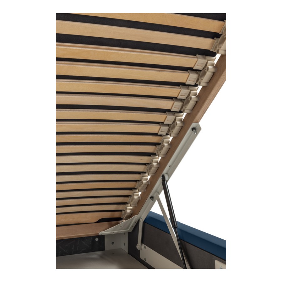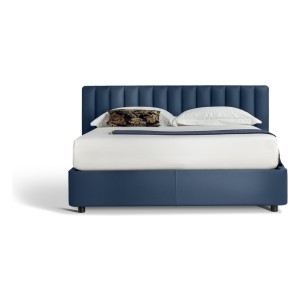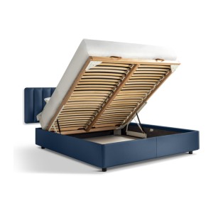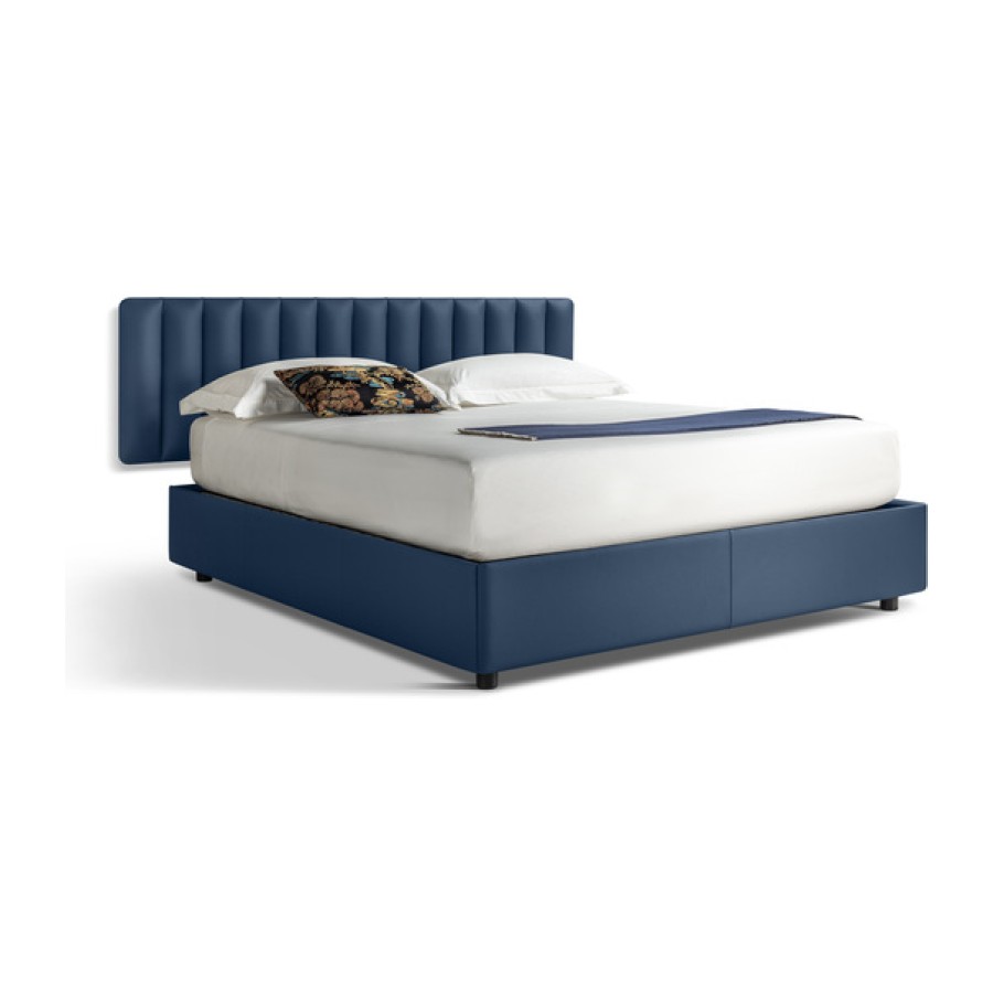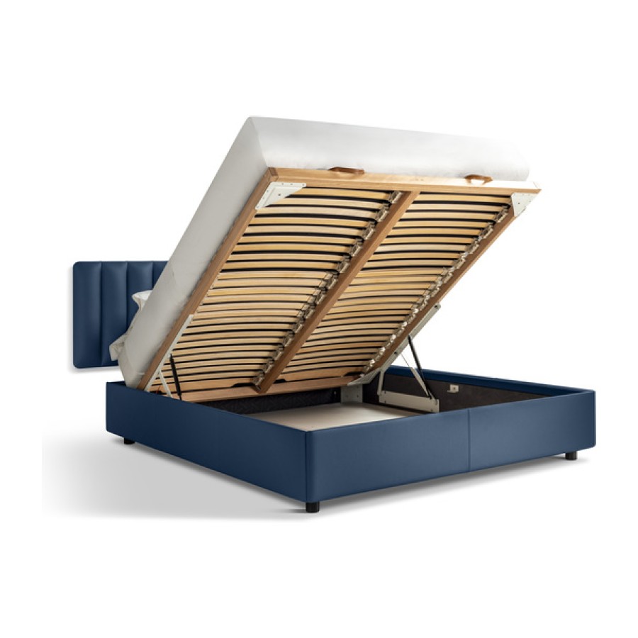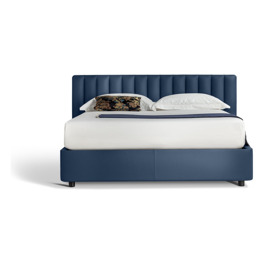The frame of the Ferdinandea bed with storage unit is made of poplar plywood with light polyurethane foam padding upholstered in Pelle Frau® leather and delicate matching tone-on-tone stitching. The cylindrical feet are in black painted metal. The support surface of the storage compartment is made with raw chipboard panels, laminated with a melamine decorative finish that imitates the “Linen” effect in the color Ecru on both sides, and with an edge matching the decorative finish. The lifting mechanism to access the storage unit requires a single opening movement through two leather handles, positioned on the side of the footboard, which lifts the top to the classic tilted position with a gas spring mechanism. The lifting system supports a 170x200cm, up to 45 kg mattress. The Ferdinandea bed with storage unit can be combined with a coordinated soft headboard upholstered in leather, an epitome of the excellent craftsmanship that identifies all Poltrona Frau products and guarantees maximum comfort. The headboard is available in two versions, with either a vertical or horizontal geometric design, and tone-on-tone padding stitching.