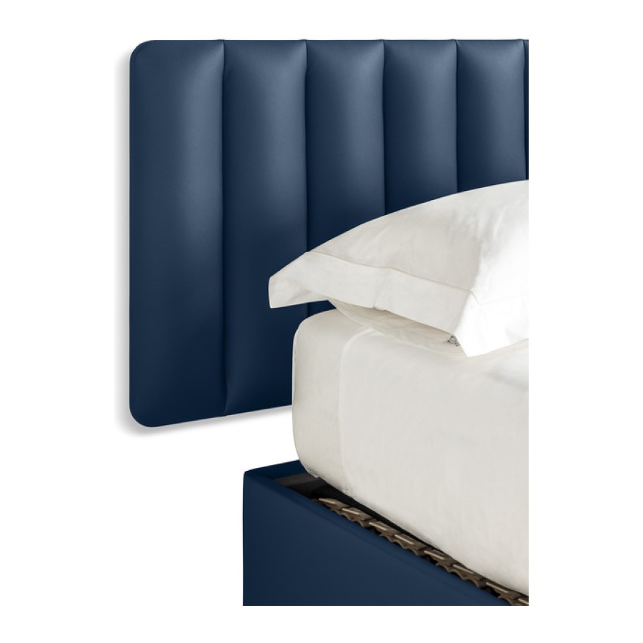 The Ferdinandea headboard features a birch plywood frame coated with a layer of polyurethane foam and polyester wadding and upholstered in Pelle Frau®, with delicate matching tone-on-tone stitching that makes up a geometric pattern available in two variations: horizontal or vertical. The back of the Ferdinandea headboard is covered in black canvas and can be anchored to the wall using a bayonet fastening system made of matte black painted metal. Designed to be combined in complete freedom with the different Ferdinandea bed variations, the headboard is available in different lengths: