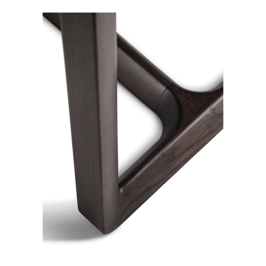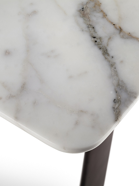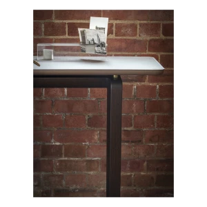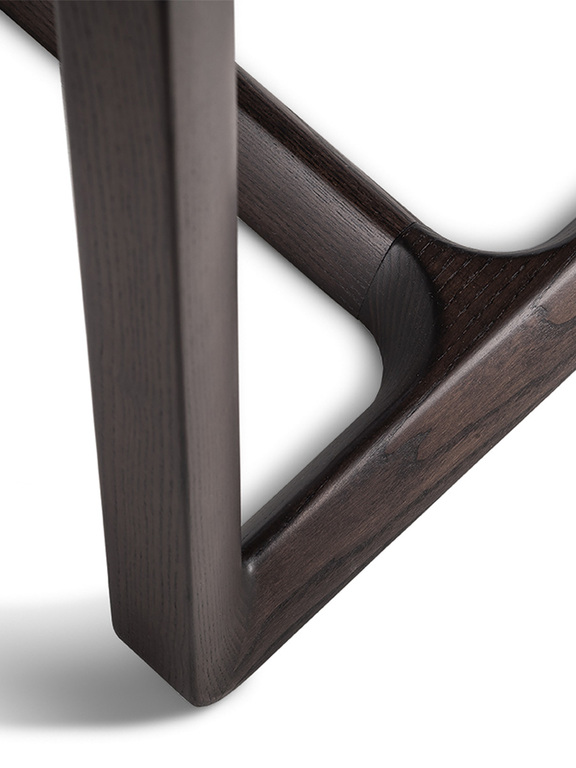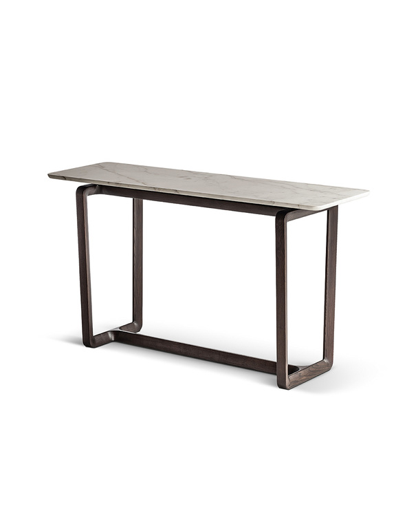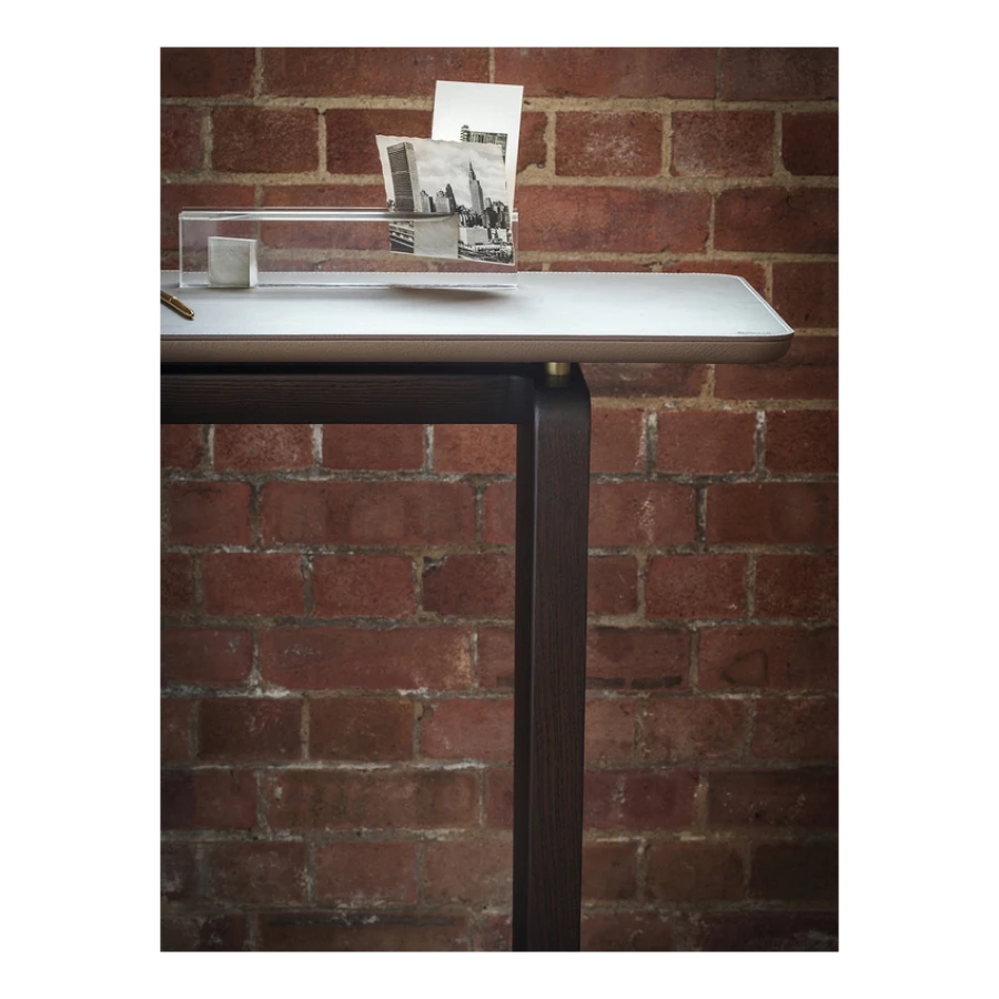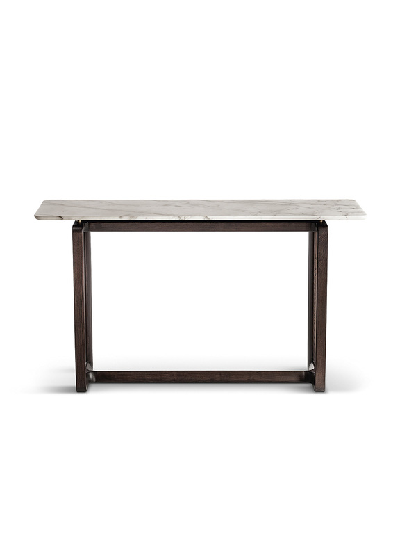 The Fidelio console table is 75 cm high, 135 cm wide and 45 cm deep. The base, in solid ash with a Moka or Wengé stain, supports the two double uprights with characteristic triangular section. The plates for mounting the tops are made from steel and painted matt black. Spacers in brushed steel with a natural brass finish. Self-adhesive felt pads protect the floor. The top surface is in Emperador or Calacatta Gold marble. Both have a polished finish to which a transparent polyester paint is applied to guarantee greater resistance and prevent the absorption of liquids. The Calacatta gold marble can also come with a semi-polished finish, treated with a water-repellent oil with a highly natural appearance. The marble top is completed with a supporting MDF panel with a non-scratch matt black painted finish, and the underneath is strengthened with a technical mesh to guarantee its resistance. On request, the top can also come in birch plywood upholstered with Saddle Extra leather. In this case the underneath is in matching Pelle Frau® leather.