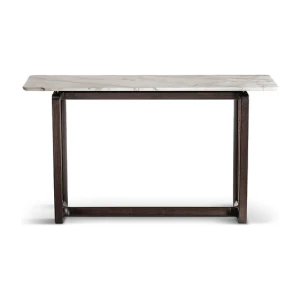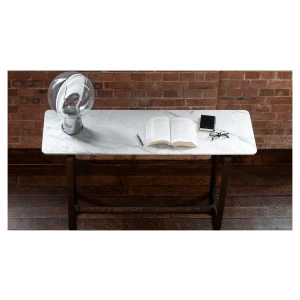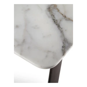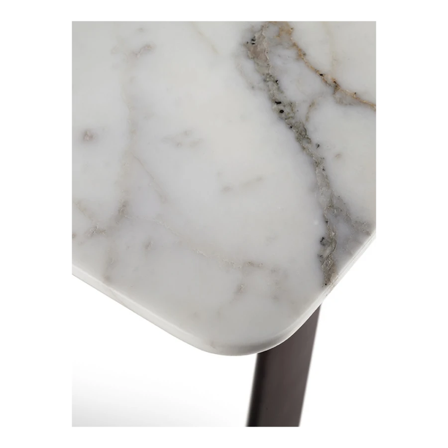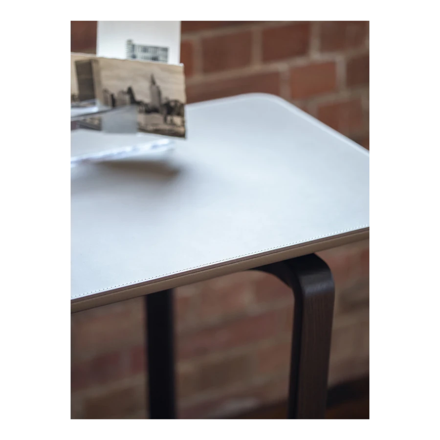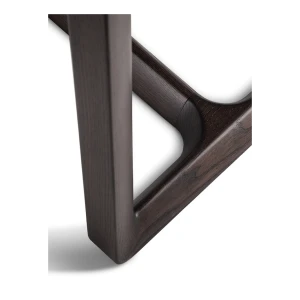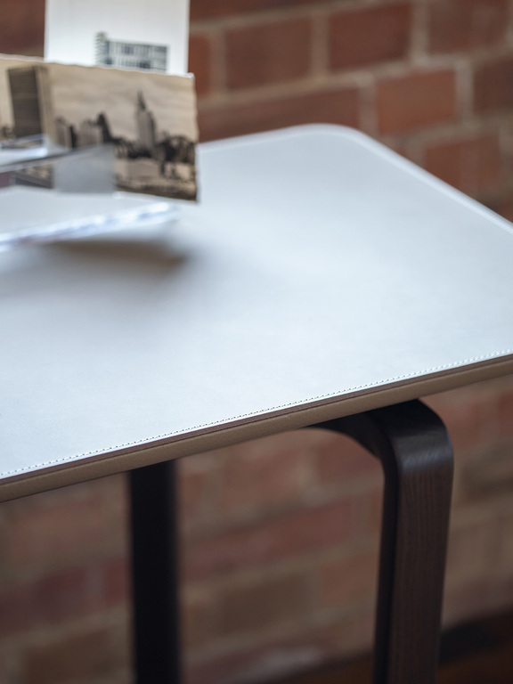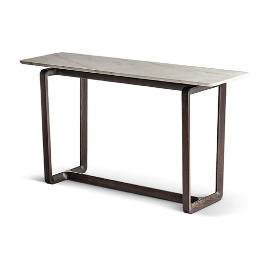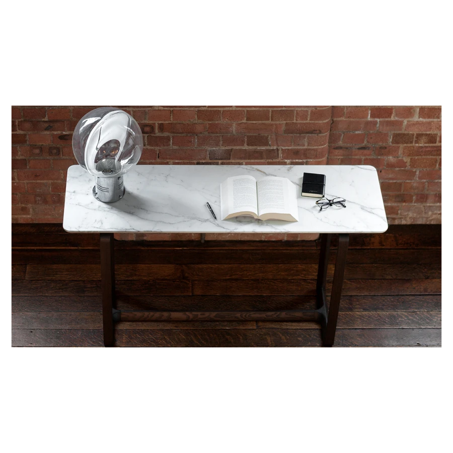 The Fidelio console table is 75 cm high, 135 cm wide and 45 cm deep. The base, in solid ash with a Moka or Wengé stain, supports the two double uprights with characteristic triangular section. The plates for mounting the tops are made from steel and painted matt black. Spacers in brushed steel with a natural brass finish. Self-adhesive felt pads protect the floor. The top surface is in Emperador or Calacatta Gold marble. Both have a polished finish to which a transparent polyester paint is applied to guarantee greater resistance and prevent the absorption of liquids. The Calacatta gold marble can also come with a semi-polished finish, treated with a water-repellent oil with a highly natural appearance. The marble top is completed with a supporting MDF panel with a non-scratch matt black painted finish, and the underneath is strengthened with a technical mesh to guarantee its resistance. On request, the top can also come in birch plywood upholstered with Saddle Extra leather. In this case the underneath is in matching Pelle Frau® leather.