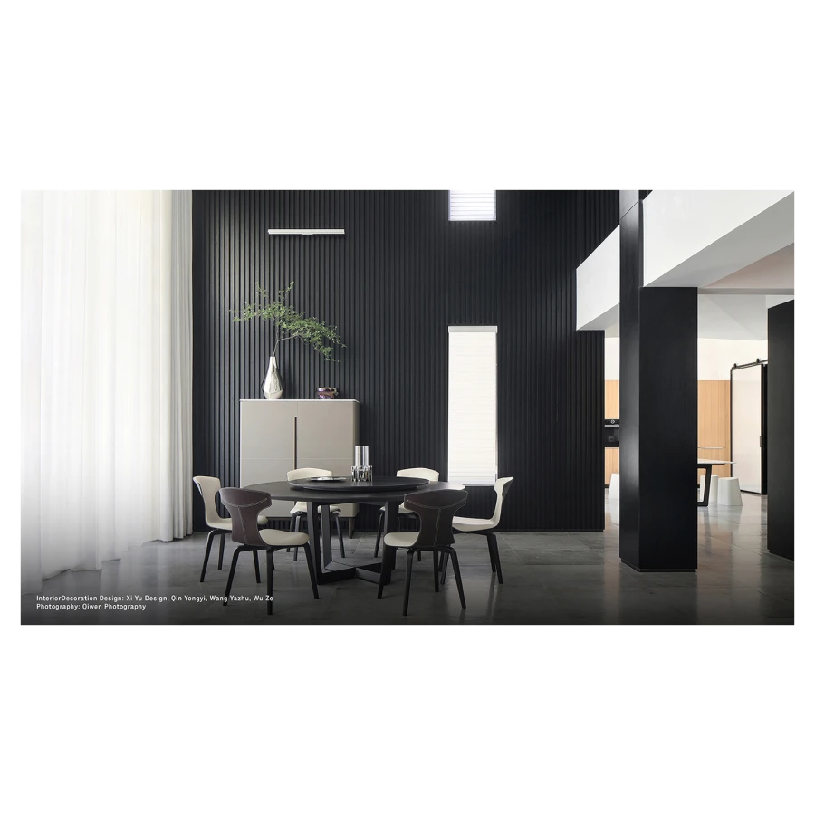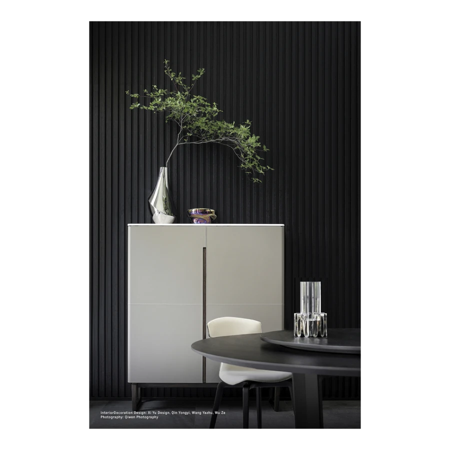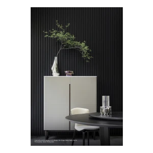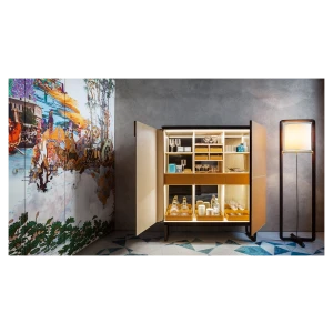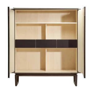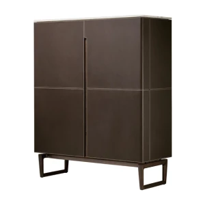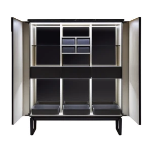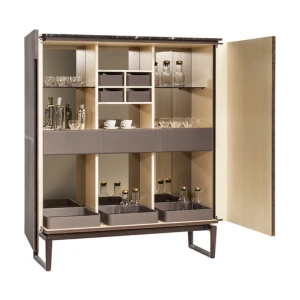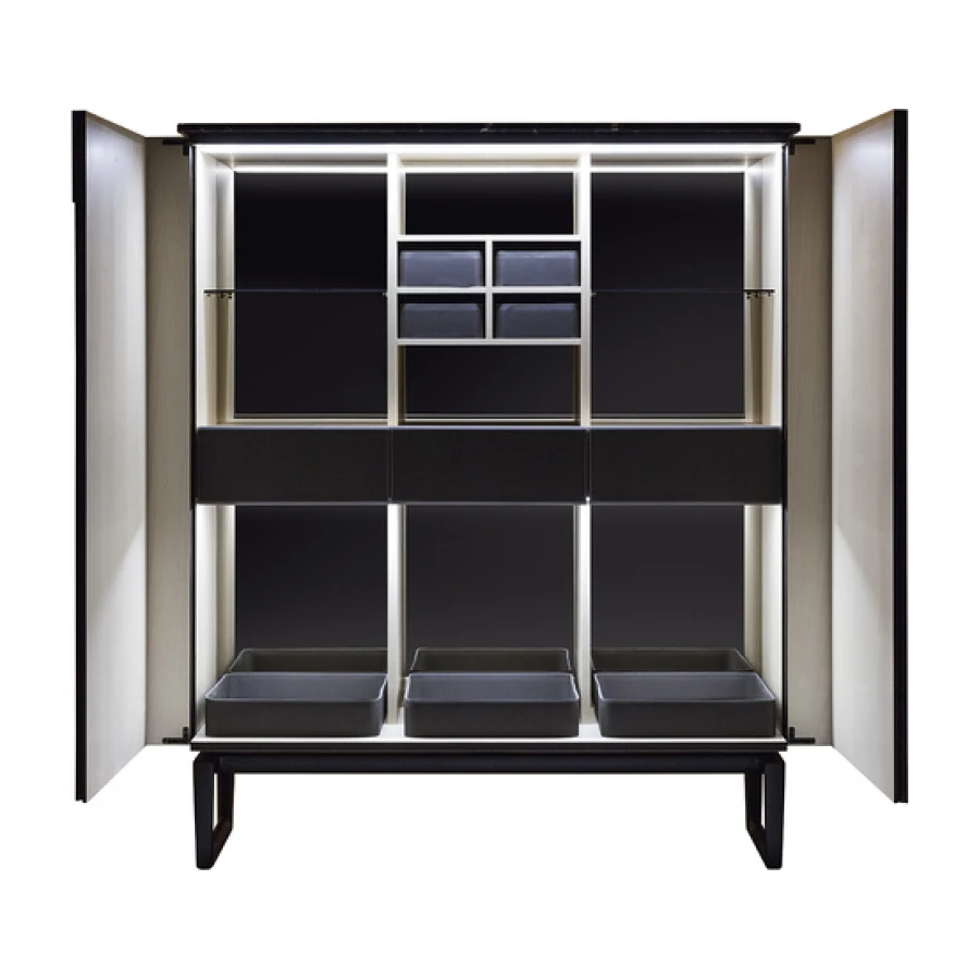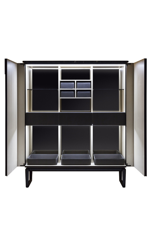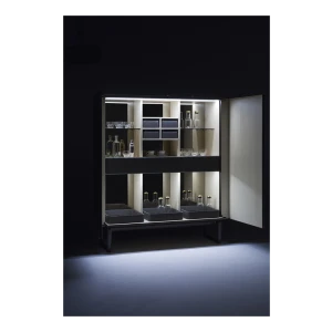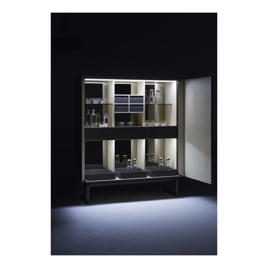 When designing the Fidelio series (Low Cabinet, High Cabinet and Mobile Bar), Roberto Lazzeroni opted for a deliberately clean design combined with precious materials: formal simplicity and sophisticated finishes for a versatile collection that is easy to combine with all other Poltrona Frau furnishings. The functional details become highly distinctive aesthetic elements, like the recessed handles on the surfaces. There is also the intense contrast between the warm, dark tones of the saddle-leather and wood that covers the exteriors, and the luminous explosion of the light natural maple that reveals itself in the compartments.