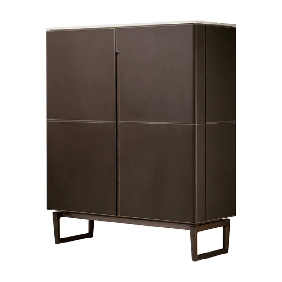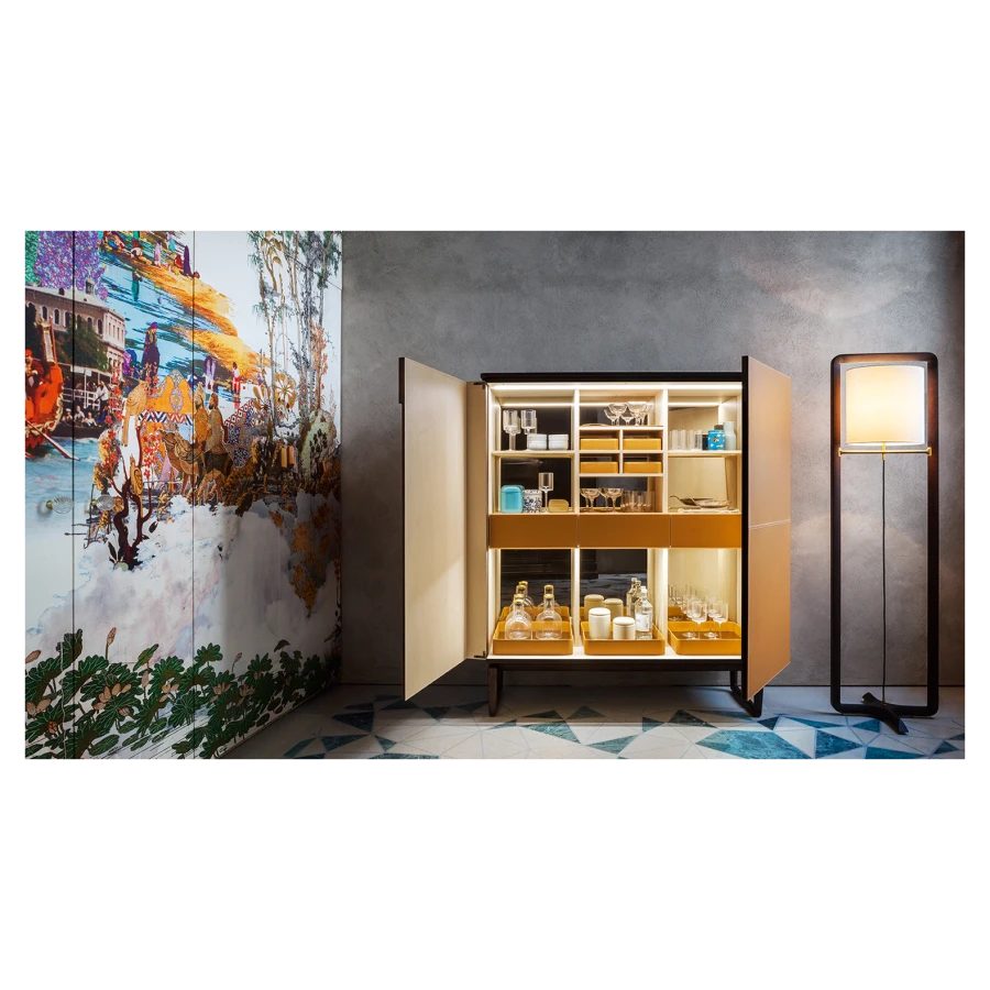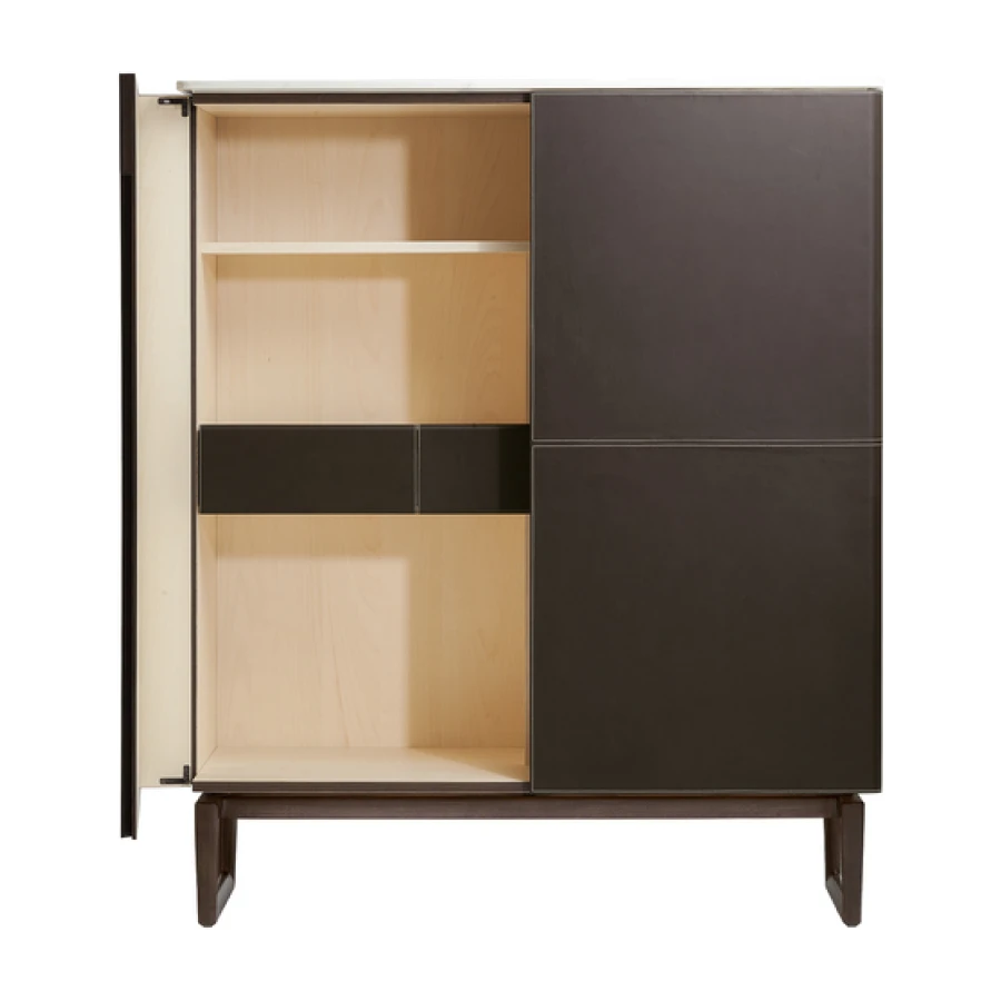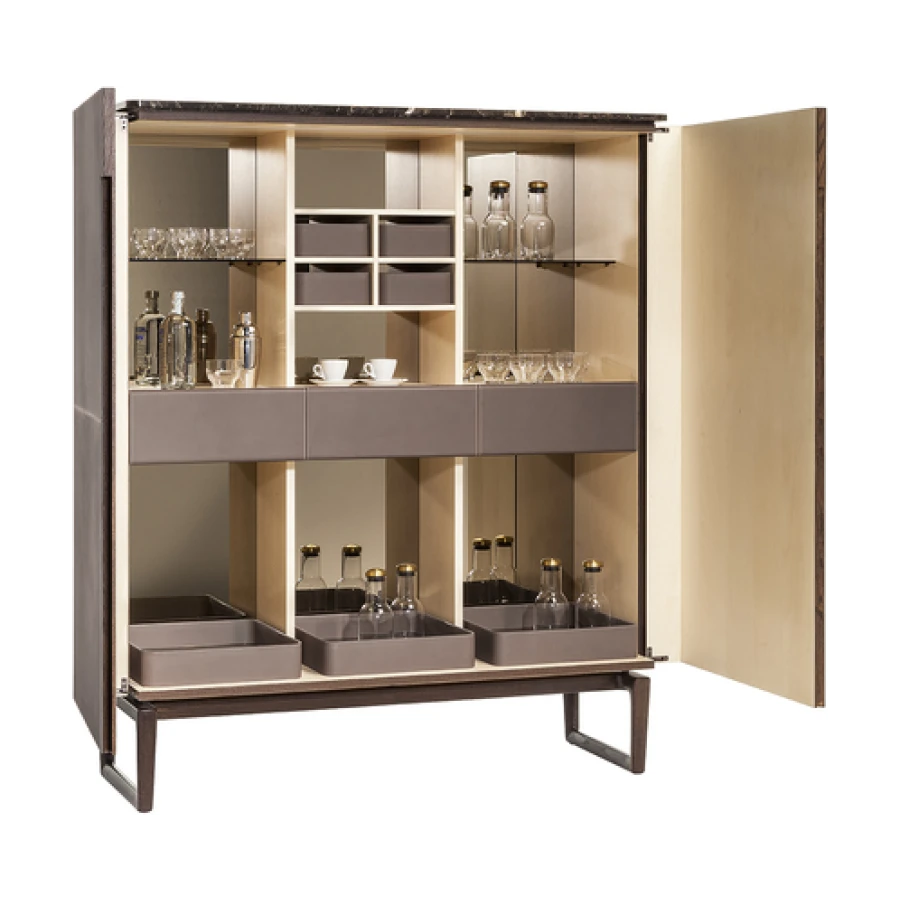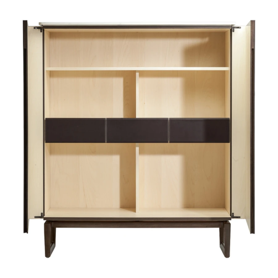 The collection includes the Low Cabinet, the High Cabinet and the Fidelio Mobile Bar. The supporting structure is in solid ash and birch plywood with moka-coloured ash veneer on the outside. The extra light natural maple wood brightens the interior. The doors are in birch plywood and poplar with the insides veneered in moka-stained ash for the Fidelio Low Cabinet and extra light natural cut maple wood in the Fidelio High Cabinet. The edging of the doors is produced from solid ash in a moka stain. The top is available in moka-stained ash, in glossy or semi-glossy Calacatta gold marble and in glossy Emperador marble. The sawhorse base, in moka-stained solid ash with triangular cross-section, adds to the light feel of the design. The base is fixed to the structure with cylindrical spacers in matt black painted steel. The adjustable steel feet have rubber caps. Fine saddle-leather is used to upholster the sides, doors, inside drawers and, on request, the back of the cabinet. Choice between tone-on-tone or contrast stitching. The inside of the Fidelio Mobile Bar is designed to lighten up when the doors are opened. The back wall of the cabinet is covered with two bronzed mirrors.