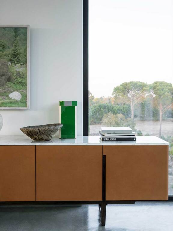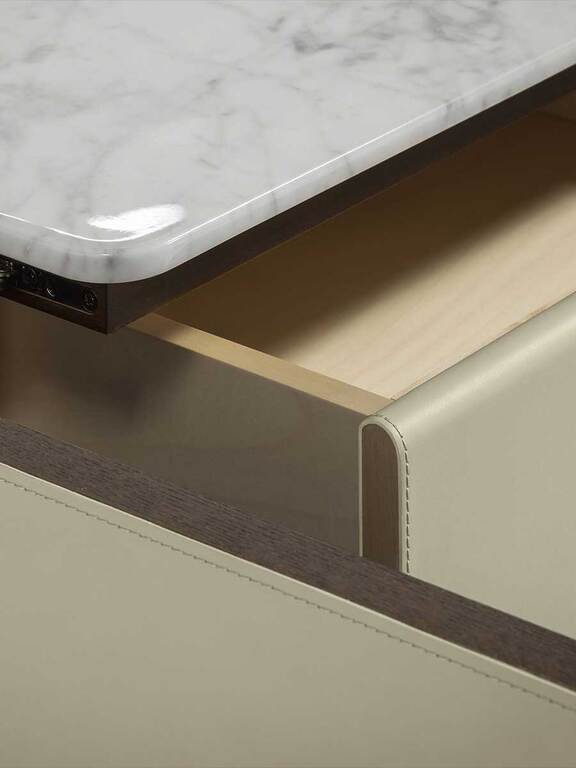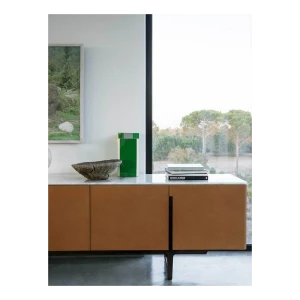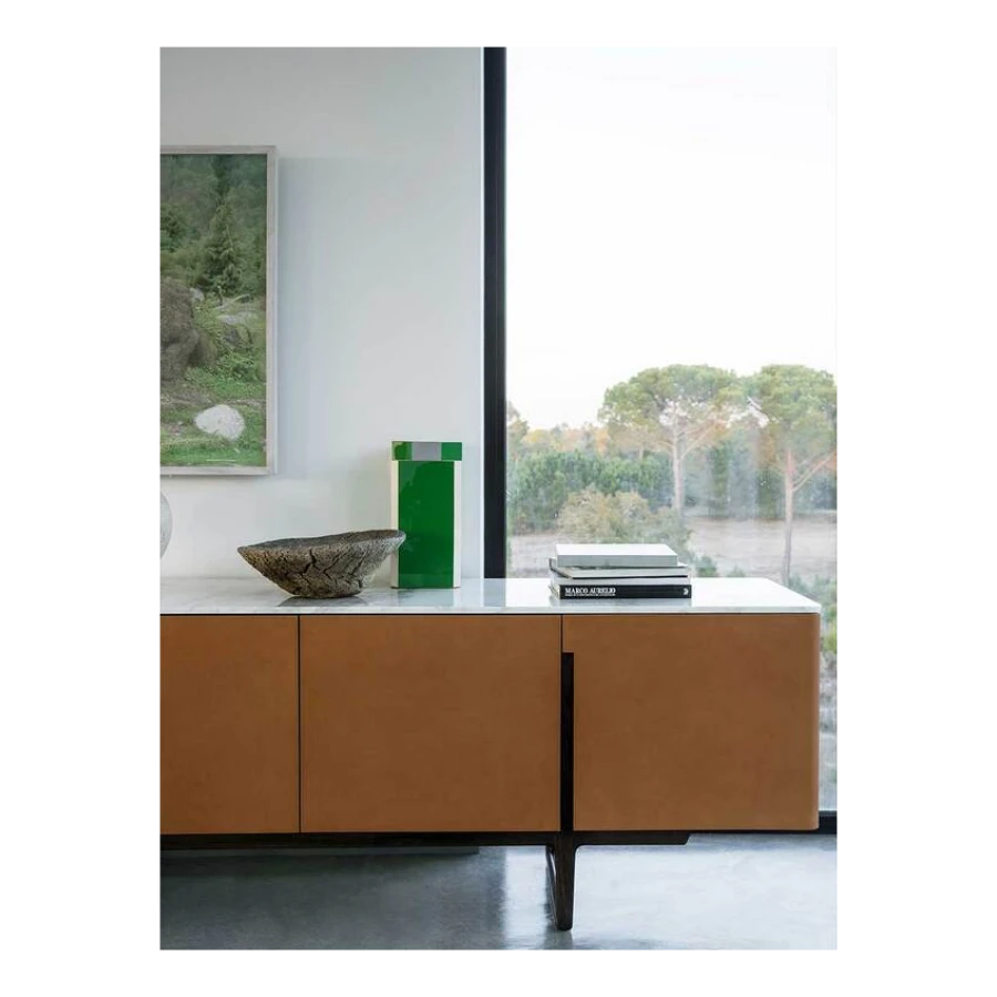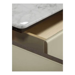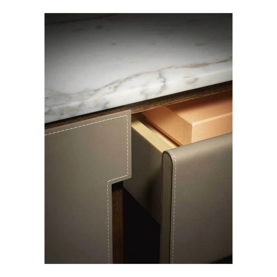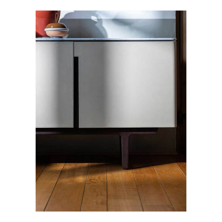The Fidelio Low Cabinet is available in two variations, one larger and one smaller. The sideboard structure is solid ash wood and birch plywood veneered in ash. The inside frame is made of extra light maple. The sideboard is covered in leather on the sides and doors, while the top is in marble. The left compartment of the Fidelio Low Cabinet in the larger version is equipped with a double drawer in the upper part and a center divider in the lower part. The smaller Fidelio Low Cabinet, on the other hand, has a single drawer in the upper part or full height compartment. The inner drawers are upholstered in leather to match the outer cover, while the divider panels are in extra light maple.