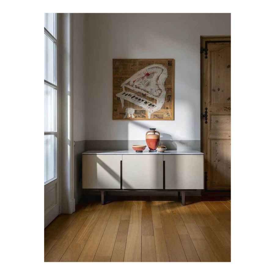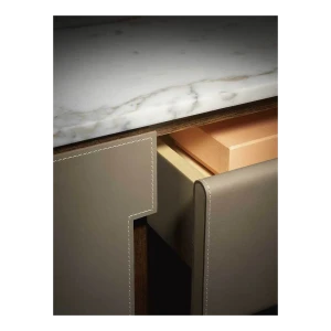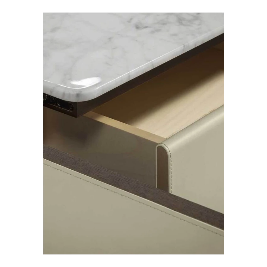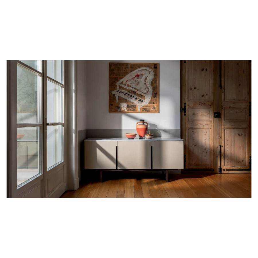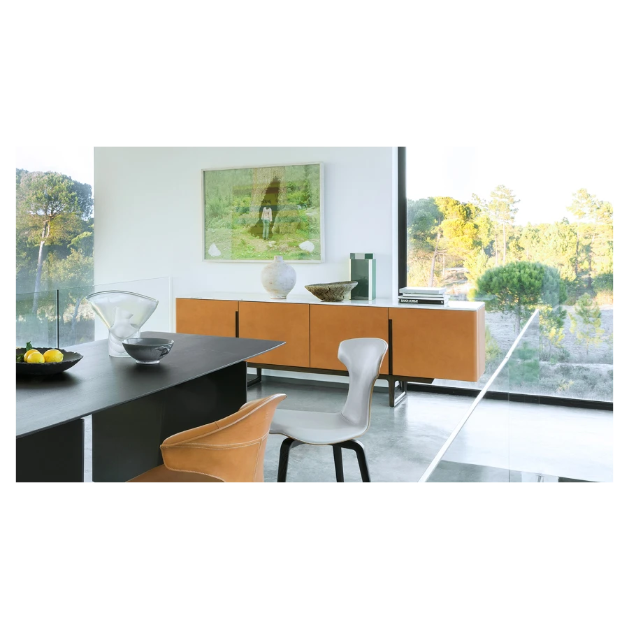 The Fidelio Low Cabinet is available in two variations, one larger and one smaller. The sideboard structure is solid ash wood and birch plywood veneered in ash. The inside frame is made of extra light maple. The sideboard is covered in leather on the sides and doors, while the top is in marble. The left compartment of the Fidelio Low Cabinet in the larger version is equipped with a double drawer in the upper part and a center divider in the lower part. The smaller Fidelio Low Cabinet, on the other hand, has a single drawer in the upper part or full height compartment. The inner drawers are upholstered in leather to match the outer cover, while the divider panels are in extra light maple.