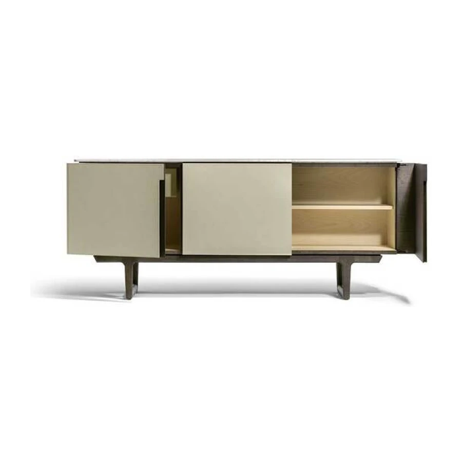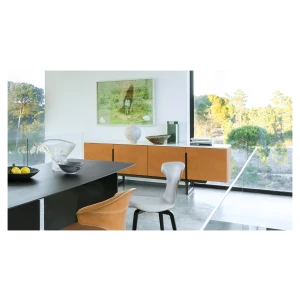 When designing the Fidelio series, Roberto Lazzeroni opted for a deliberately clean design combined with precious materials: formal simplicity and sophisticated finishes for a versatile collection that is easy to combine with all other Poltrona Frau furnishings. The functional details become highly distinctive aesthetic elements, like the handles that graphically mark the surfaces. An intense contrast runs between the warm, dark tones of the saddle-leather and wood that covers the exteriors and the luminous explosion of the light natural maple that reveals itself in the compartments.