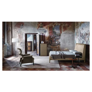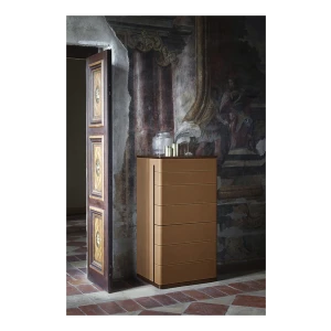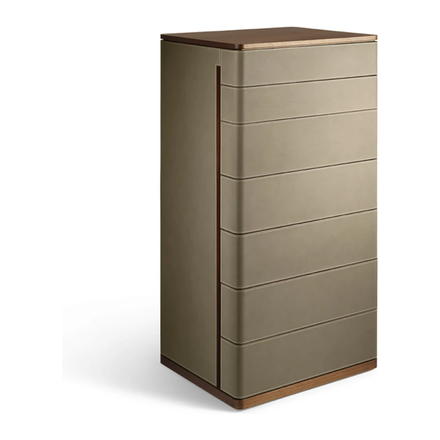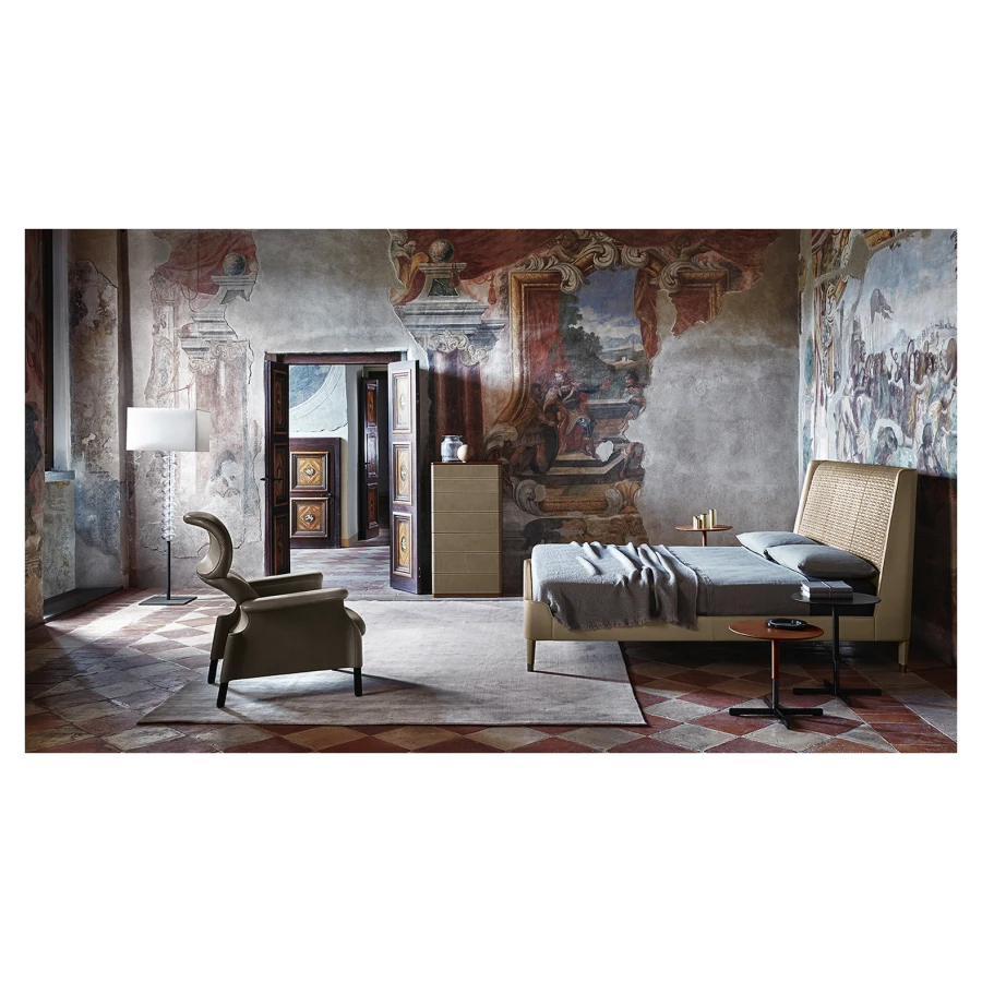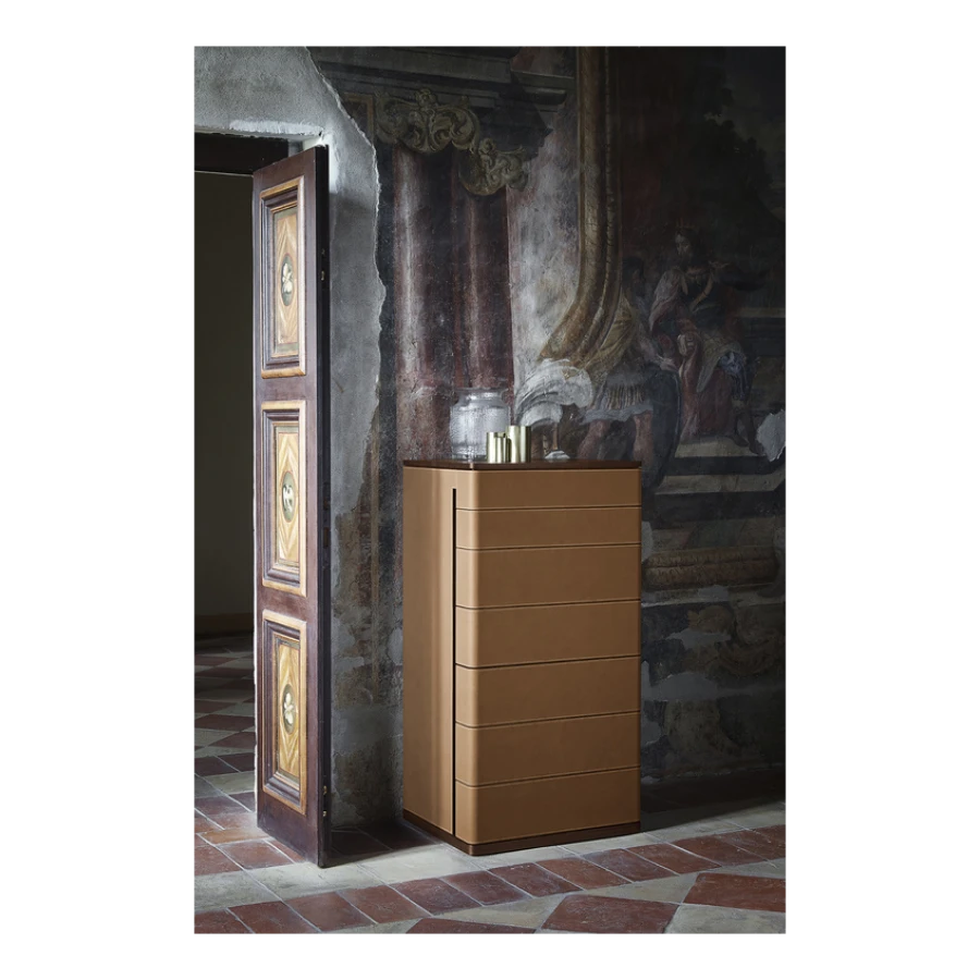 The supporting structure of the Fidelio Notte chest of drawers, tall boy and bedside table is in solid Canaletto walnut and birch plywood with Canaletto walnut veneer. The exterior of the drawers and sides are upholstered in Cuoio Saddle or Saddle Extra leather with tone-on-tone or contrast stitching. On request, the back can also be upholstered in saddle-leather as opposed to Canaletto walnut. Even more evocative is the version of the Fidelio Notte with Calacutta gold marble top and semi-polished finish, which joins the version with Canaletto walnut top. The steel feet can be adjusted.