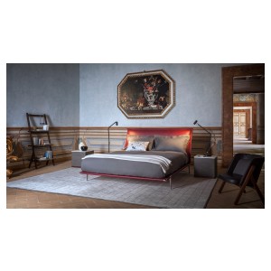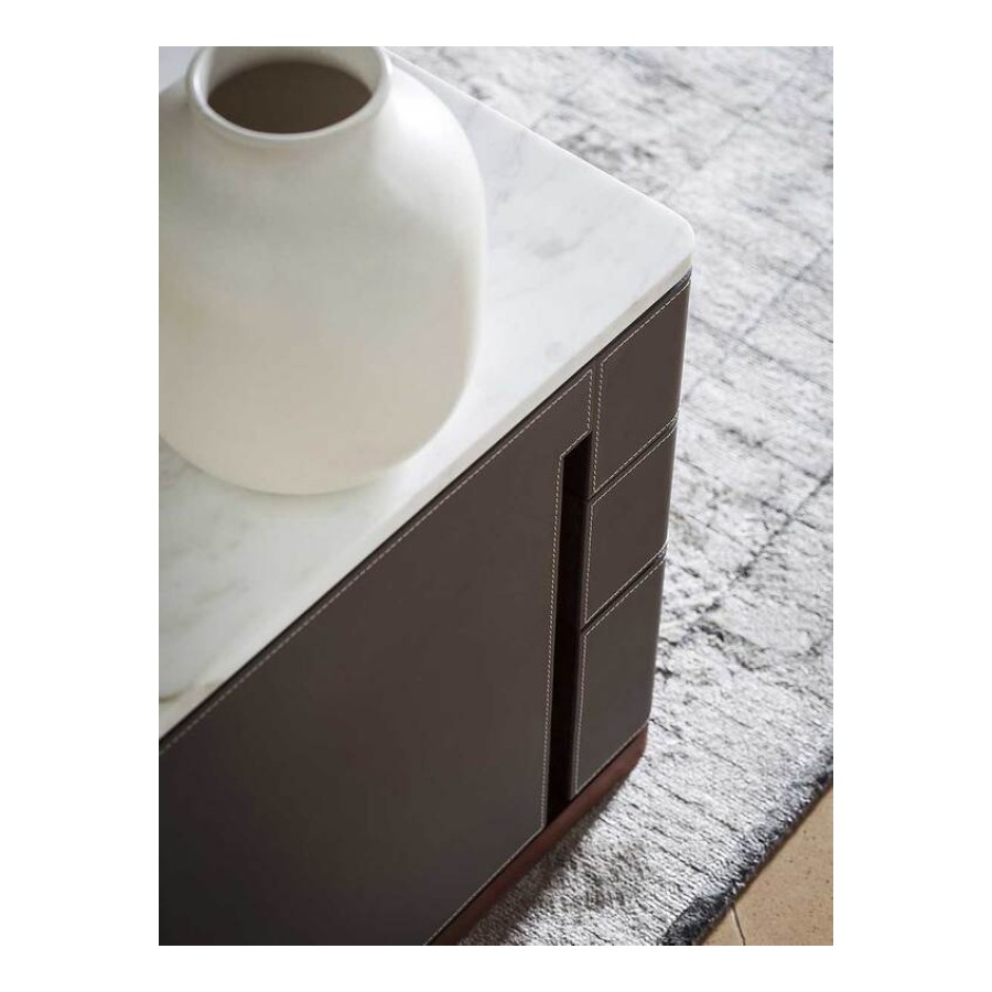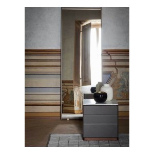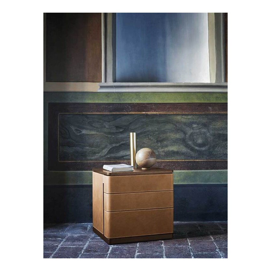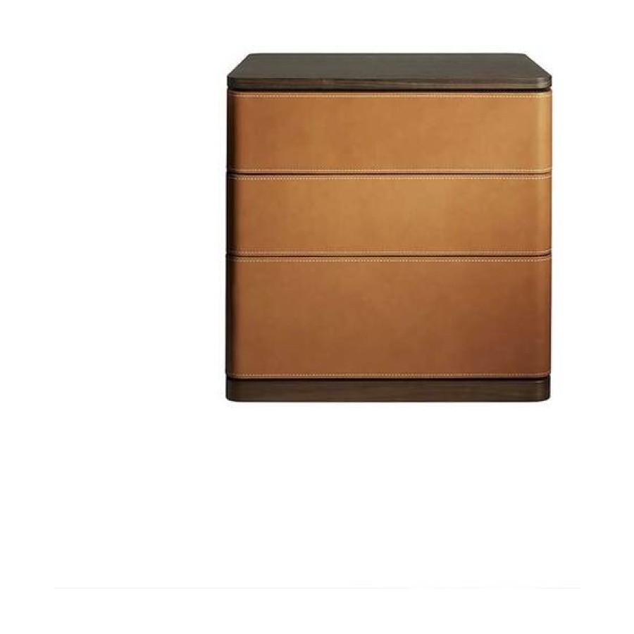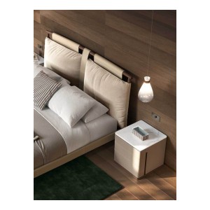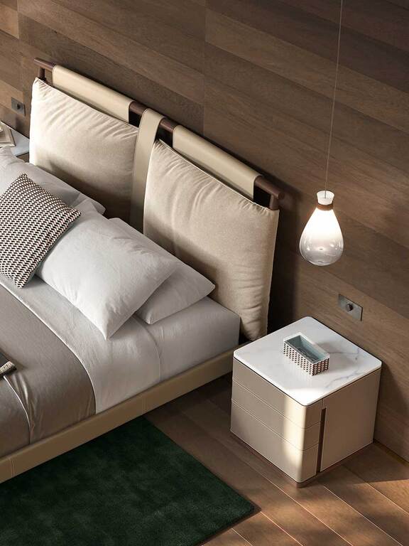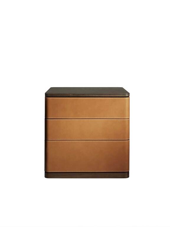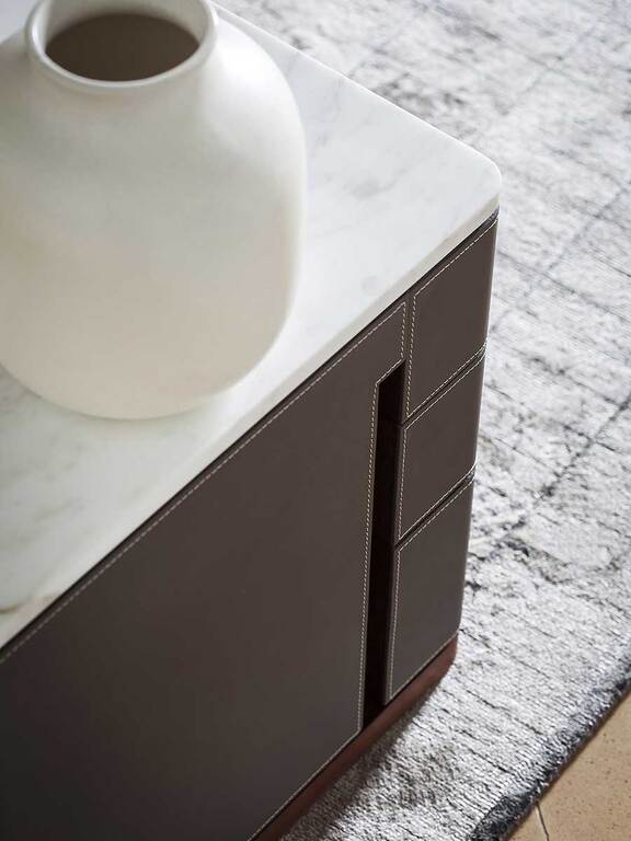 The supporting structure of the Fidelio Notte chest of drawers, tall boy and bedside table is in solid Canaletto walnut and birch plywood with Canaletto walnut veneer. The exterior of the drawers and sides are upholstered in Cuoio Saddle or Saddle Extra leather with tone-on-tone or contrast stitching. On request, the back can also be upholstered in saddle-leather as opposed to Canaletto walnut. Even more evocative is the version of the Fidelio Notte with Calacutta gold marble top and semi-polished finish, which joins the version with Canaletto walnut top. The steel feet can be adjusted.