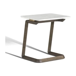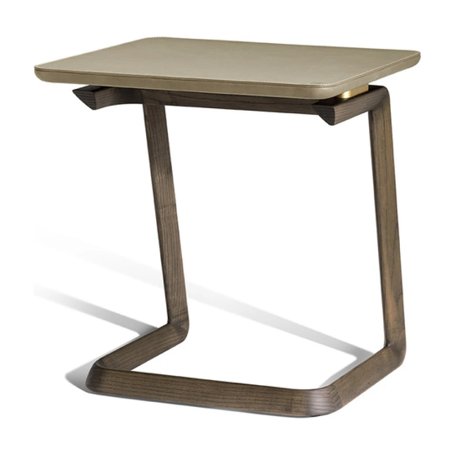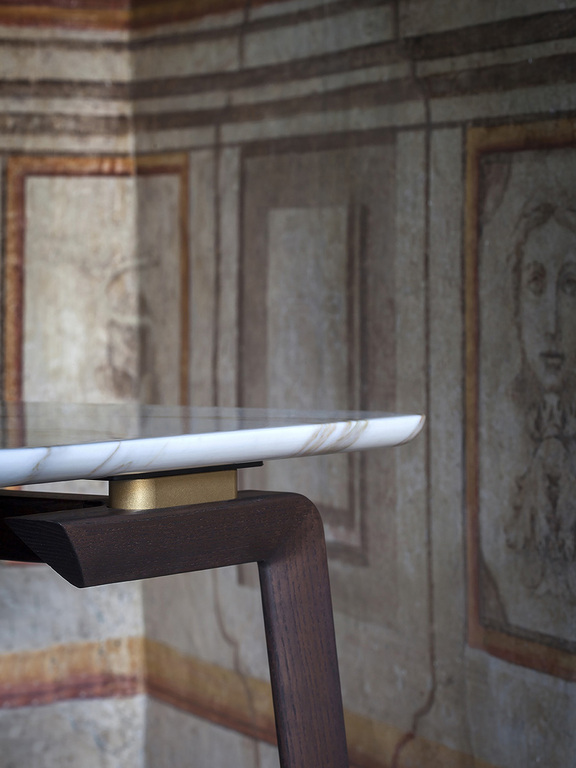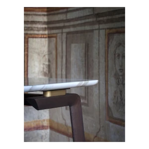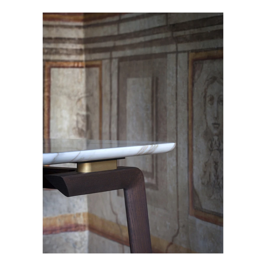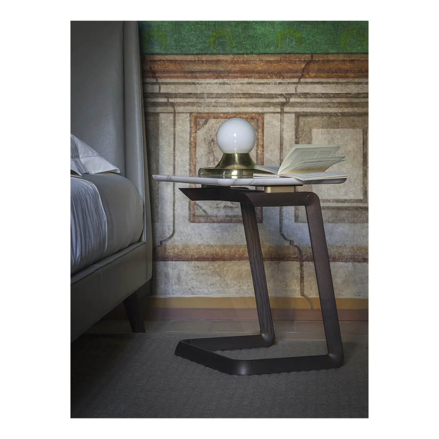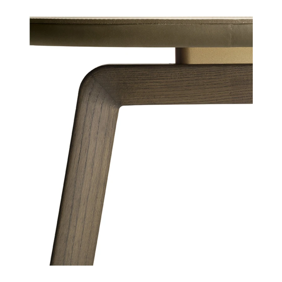 The structure of the Fidelio side tables is made from triangular profile solid ash wood in a moka or wenge stain. The top surface of the table top, in the rectangular and round variants, is upholstered in Cuoio Saddle Extra leather while the underneath is in Pelle Frau® leather. Edge stitching, tone on tone or contrast as desired, embellishes the surface of the saddle-leather top. Alternatively, the tops can come in Arabescato Venato marble with a glossy finish or Calacatta gold marble with a glossy or semi-glossy finish. Fidelio’s metal details are in brushed steel with galvanic treatment and a natural brass finish.