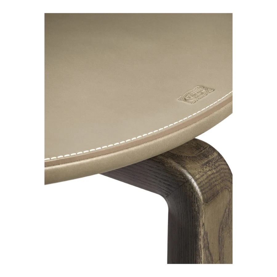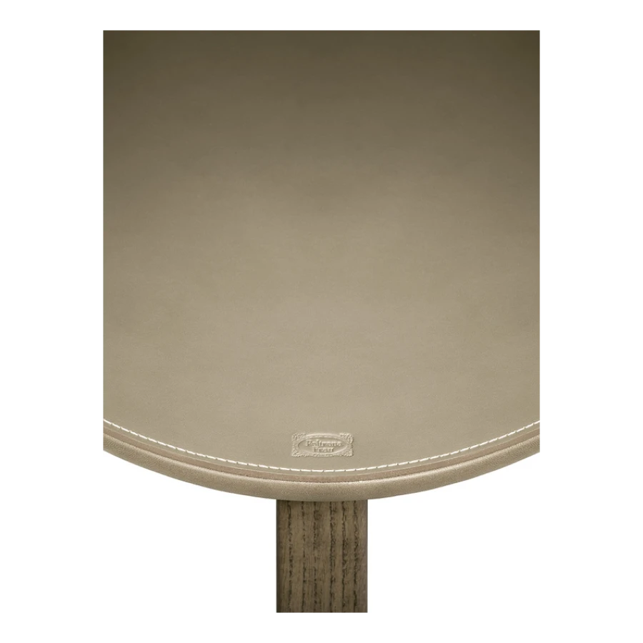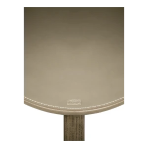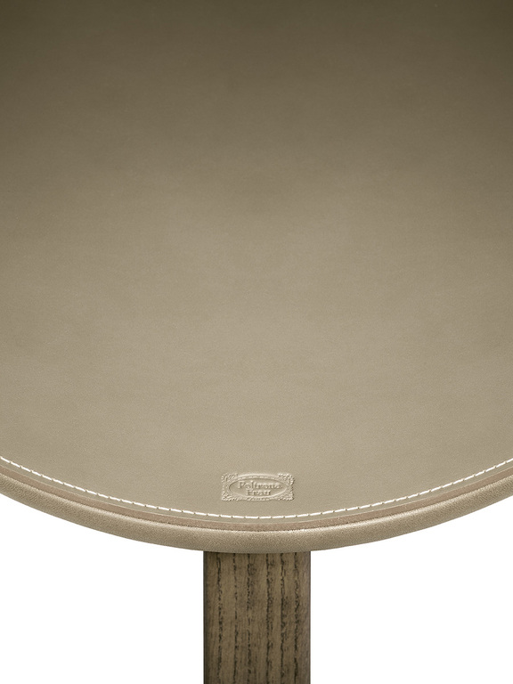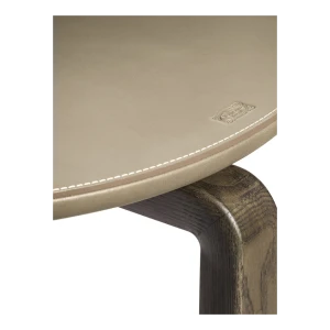 The top surface of the table top, in the rectangular and round variants, is upholstered in Cuoio Saddle Extra leather while the underneath is in Pelle Frau® leather. Edge stitching, tone on tone or contrast as desired, embellishes the surface of the saddle-leather top. Alternatively, the tops can come in Emperador marble with a glossy finish or Calacatta gold marble with a glossy or semi-glossy finish. Fidelio’s metal details are in brushed steel with galvanic treatment and a natural brass finish.
