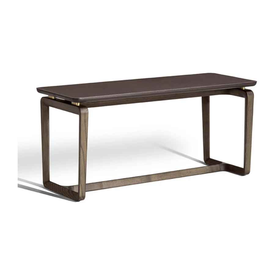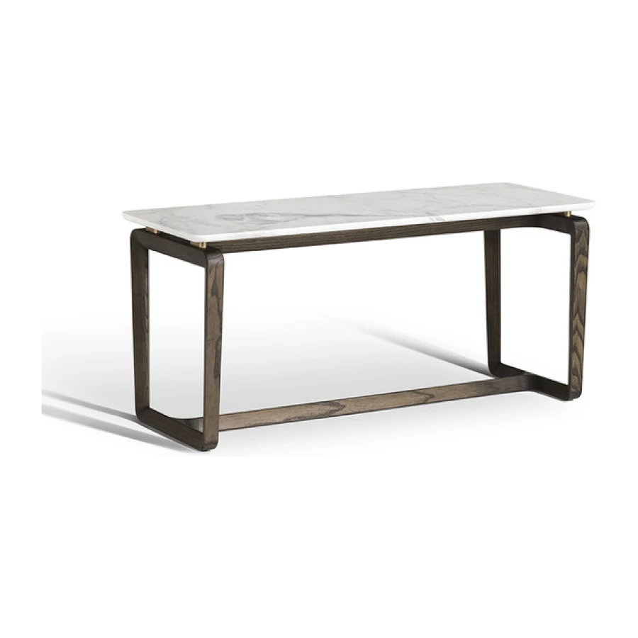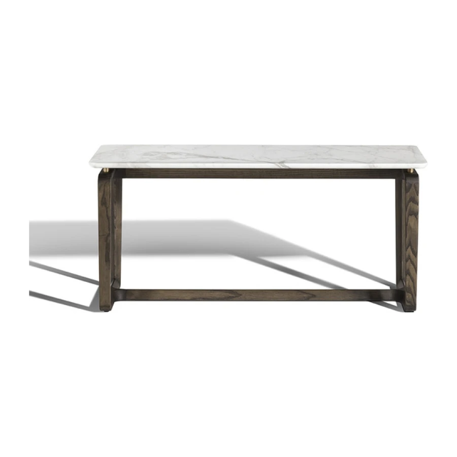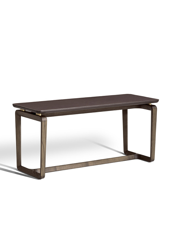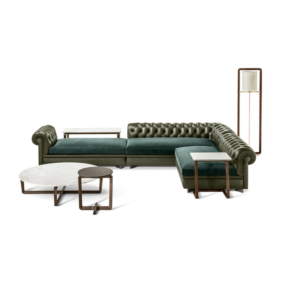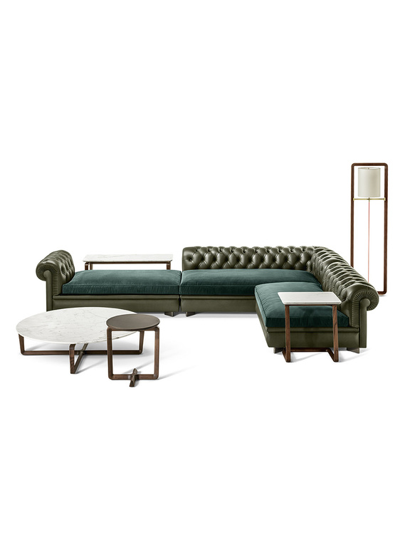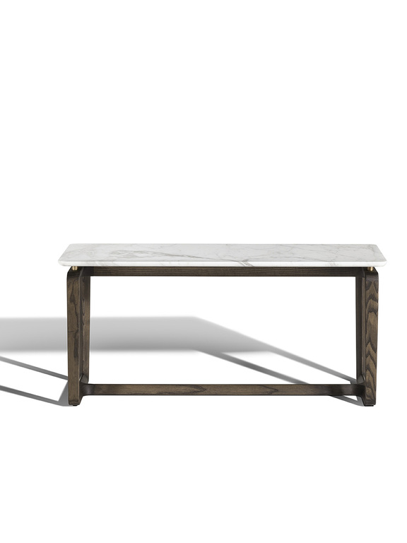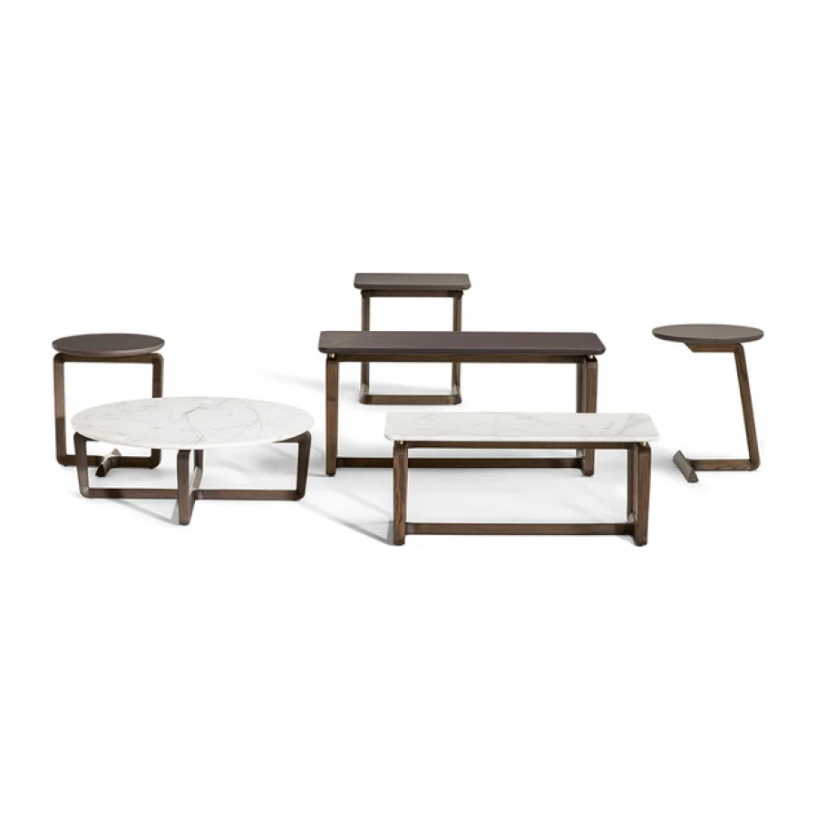 The structure of the Fidelio side tables is made from triangular profile solid ash wood in a moka or wenge stain. The top surface of the table top, in the rectangular and round variants, is upholstered in Cuoio Saddle Extra leather while the underneath is in Pelle Frau® leather. Edge stitching, tone on tone or contrast as desired, embellishes the surface of the saddle-leather top. Alternatively, the tops can come in Arabescato Venato marble with a glossy finish or Calacatta gold marble with a glossy or semi-glossy finish. Fidelio’s metal details are in brushed steel with galvanic treatment and a natural brass finish.