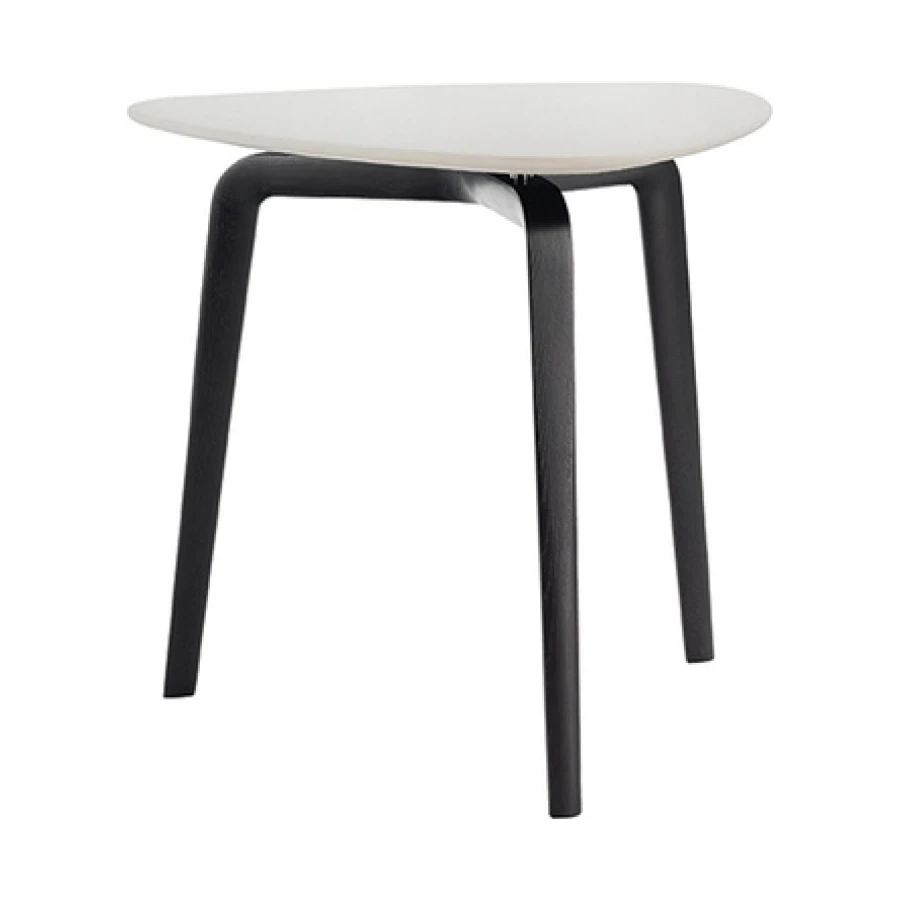The base is made from solid ash in a moka or wenge stain with distinctive triangular cross-section. The top of the Fiorile side tables can be in Pelle Frau® leather, in birch plywood with an inlaid moka- or wenge-stained ash veneer, in Arabescato Venato marble with glossy and semi-glossy finish or in Calacatta marble with glossy and semi-glossy finish.