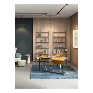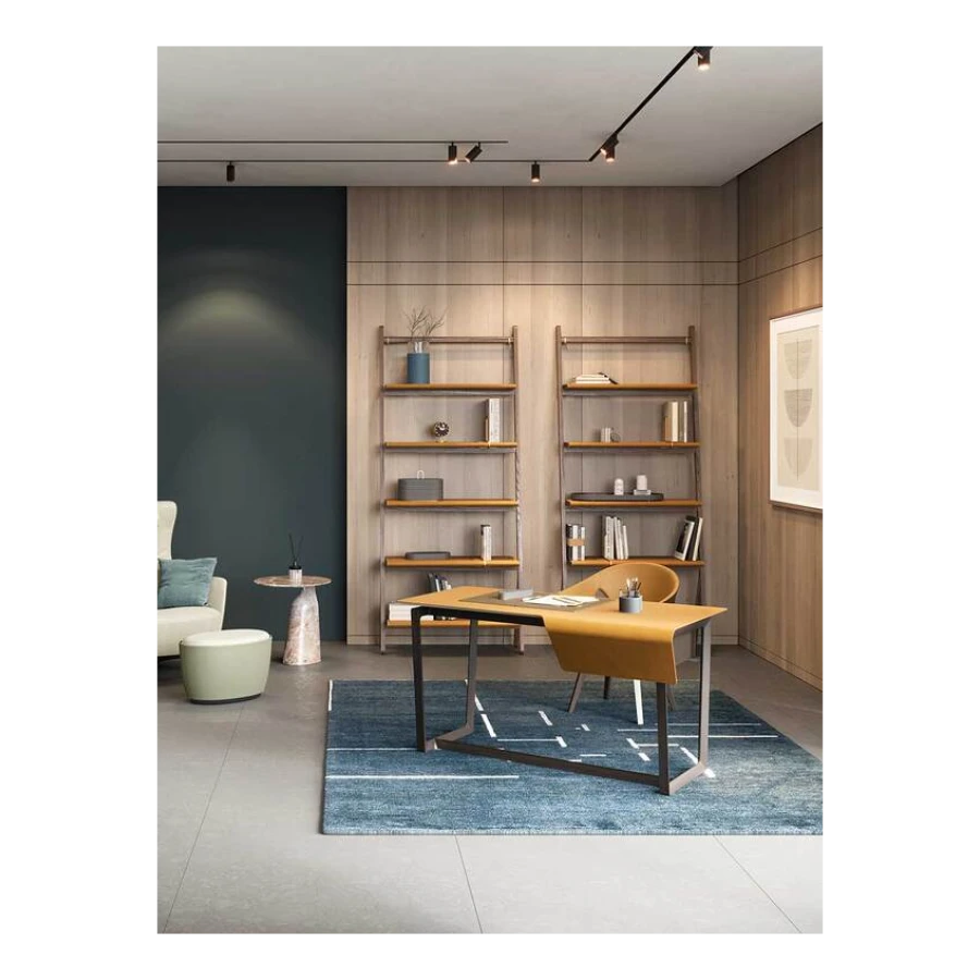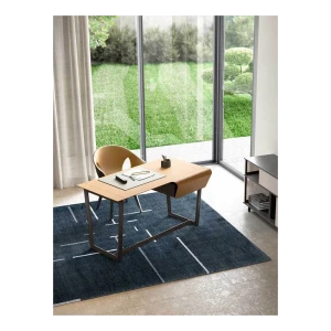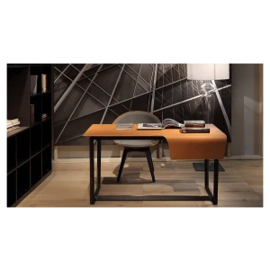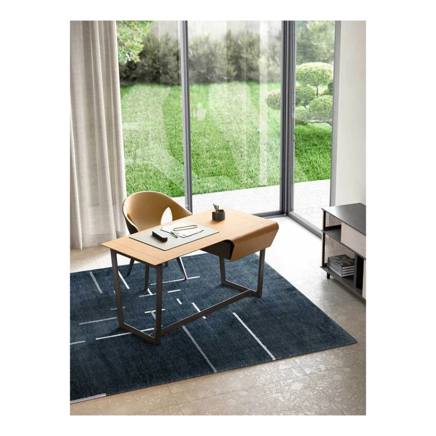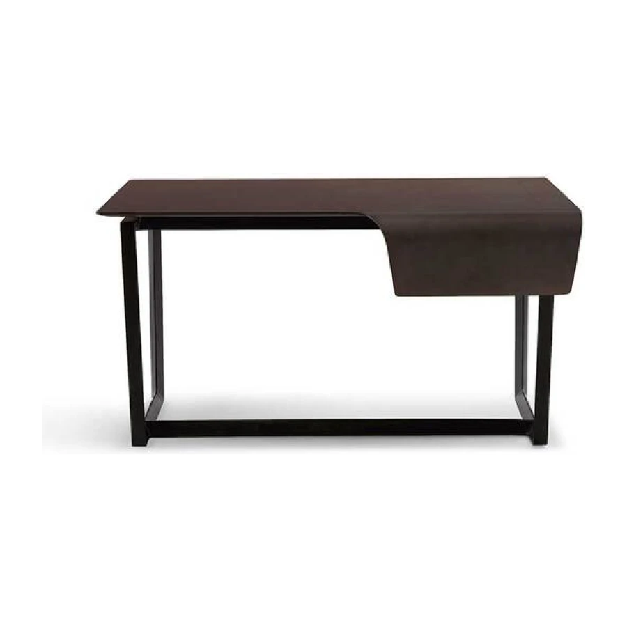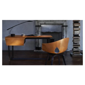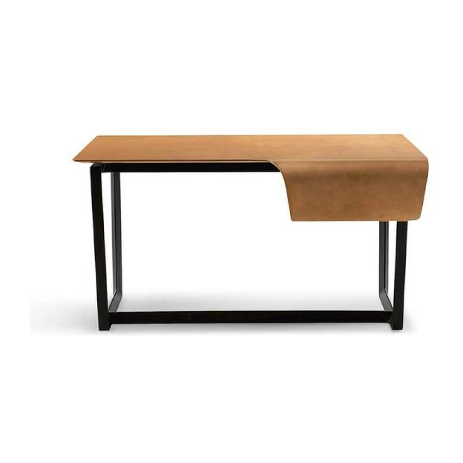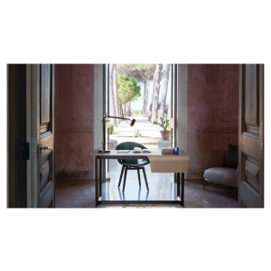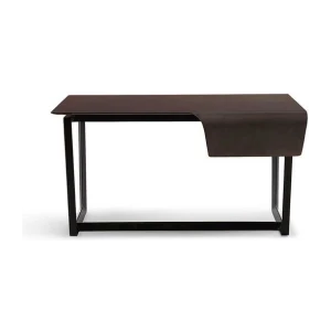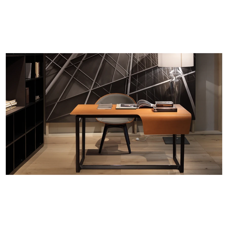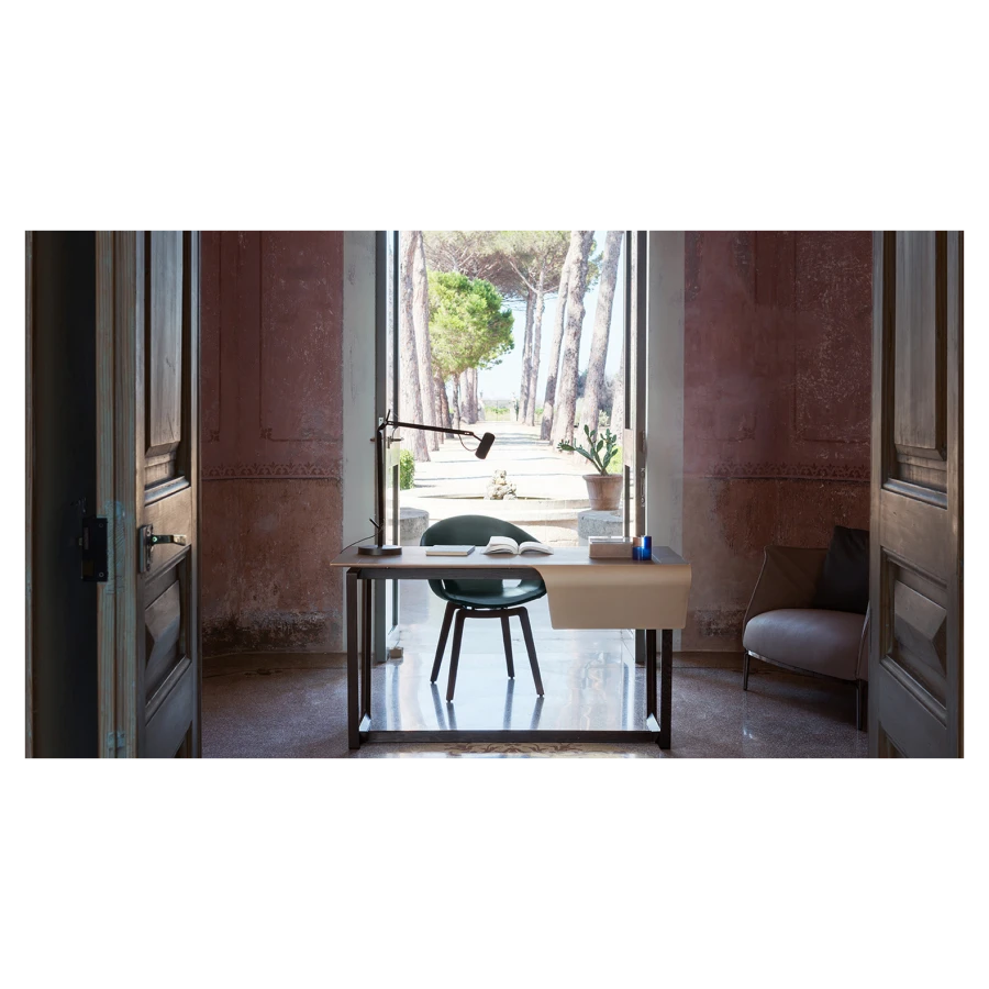 The structure of the Fred desk is made from solid ash with a wenge or moka stain and triangular cross-section, which highlights its lightness. Same material and finishes also for the drawer that completes the desk, mounted on metal runners with soft closing mechanism. The surface is covered using a single piece of 4 mm-thick Cuoio Saddle Extra leather without any divisions or stitching. The raw edge seam is finished with protective wax and dye. Metal accessories with gunmetal grey galvanic treatment and protective varnish.