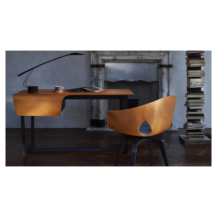 The Fred desk is a meeting of light, almost ethereal geometries. Roberto Lazzeroni creates a piece of furniture in which the visual pleasure of a continuous saddle-leather surface is underlined by delicate hand-produced incisions and cold markings that create refined graphic decorations. A special procedure makes it possible to curve the front of the saddle-leather without any need for internal supports. The ideal companion of the Fred desk is the Ginger chair, designed to make the study even more complete and harmonious.