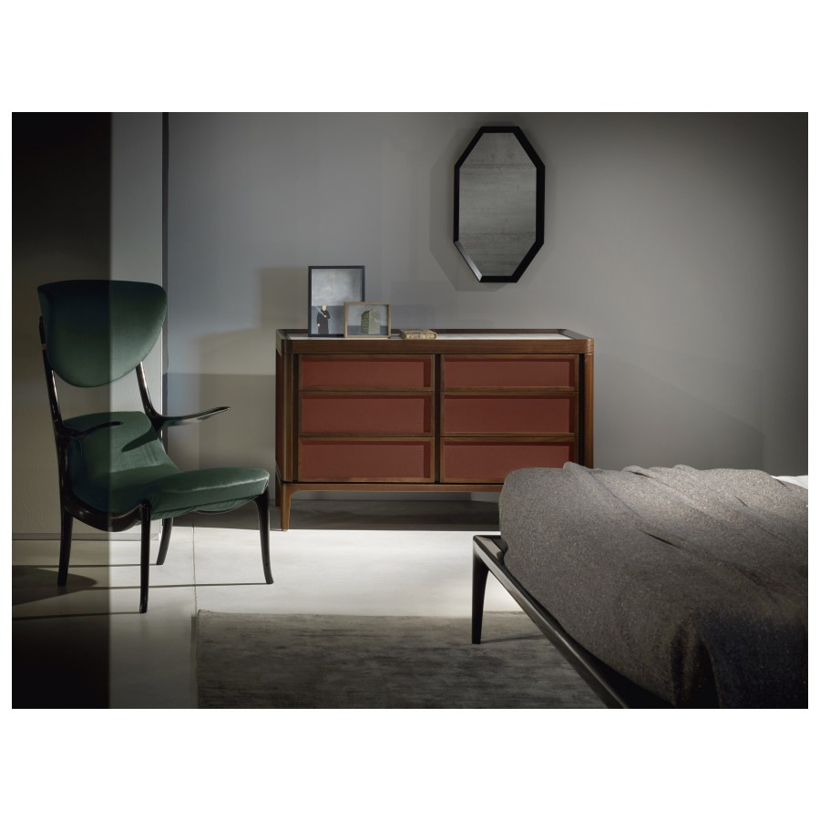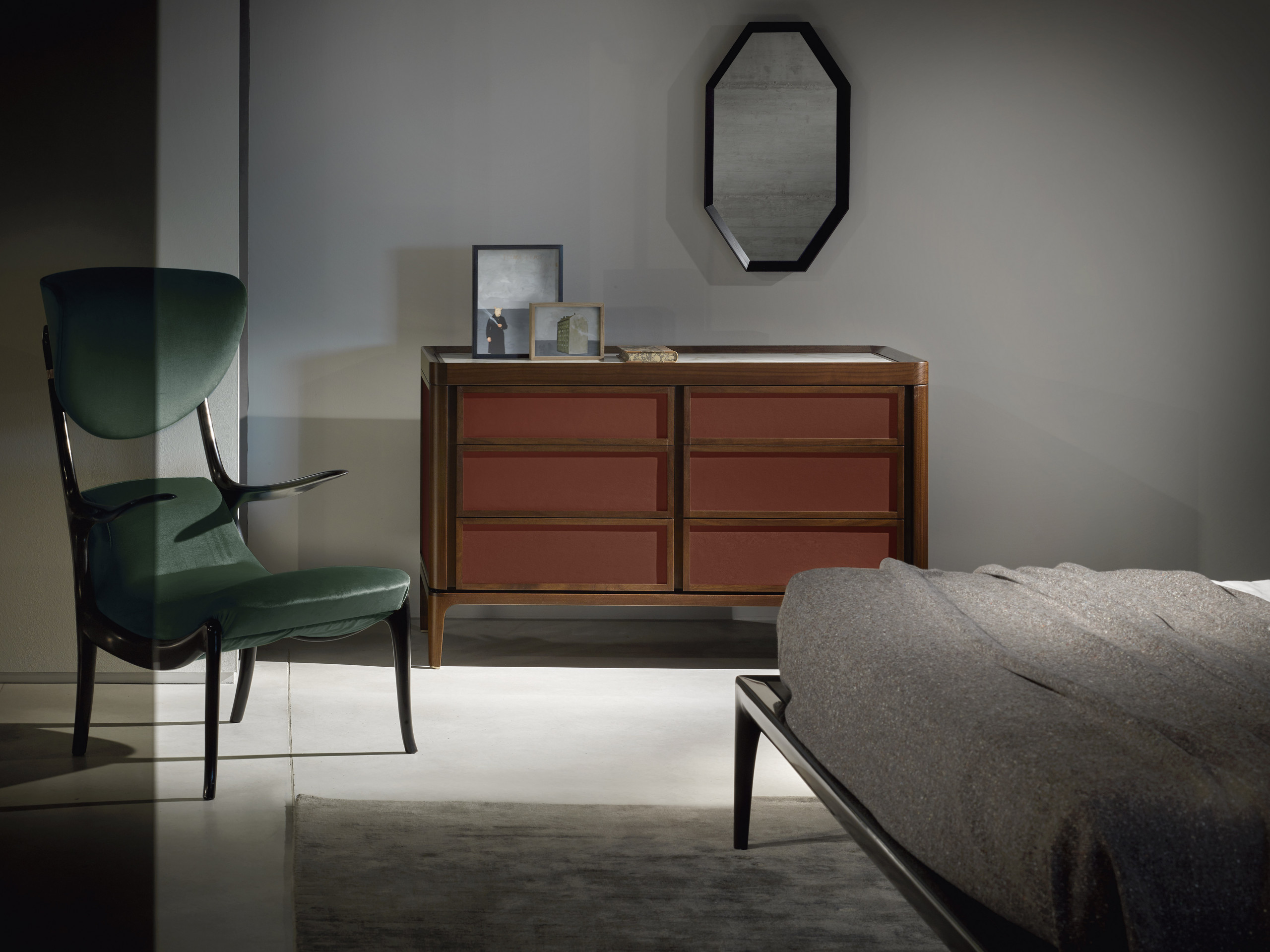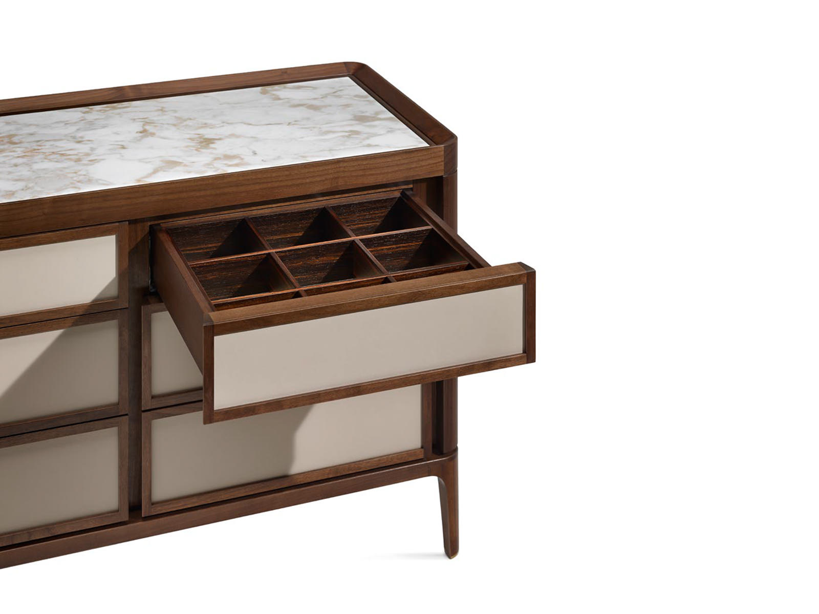 The structure is made of solid American walnut, while the drawer fronts and side panels can be covered in walnut, ebony, fabric or leather, or they can be lacquered. A wide choice of materials is available for the top, which can be made from wood, coloured glass or marble. The Extra version is available with drawer fronts and side panels covered in small strips of solid American walnut, all applied by hand. This is an elegant example of Ceccotti Collezioni’s artisan savoir faire. The bottom of the drawers can also be made from leather, and ebony dividers can be inserted inside the drawers to customise their use. For a complete set, it can be accompanied by the Full bedside table.