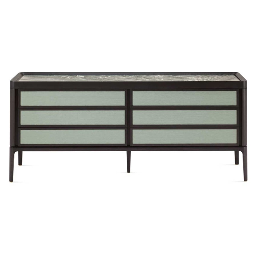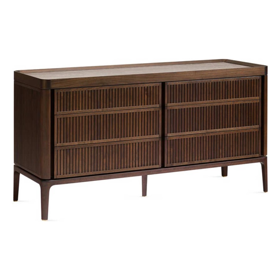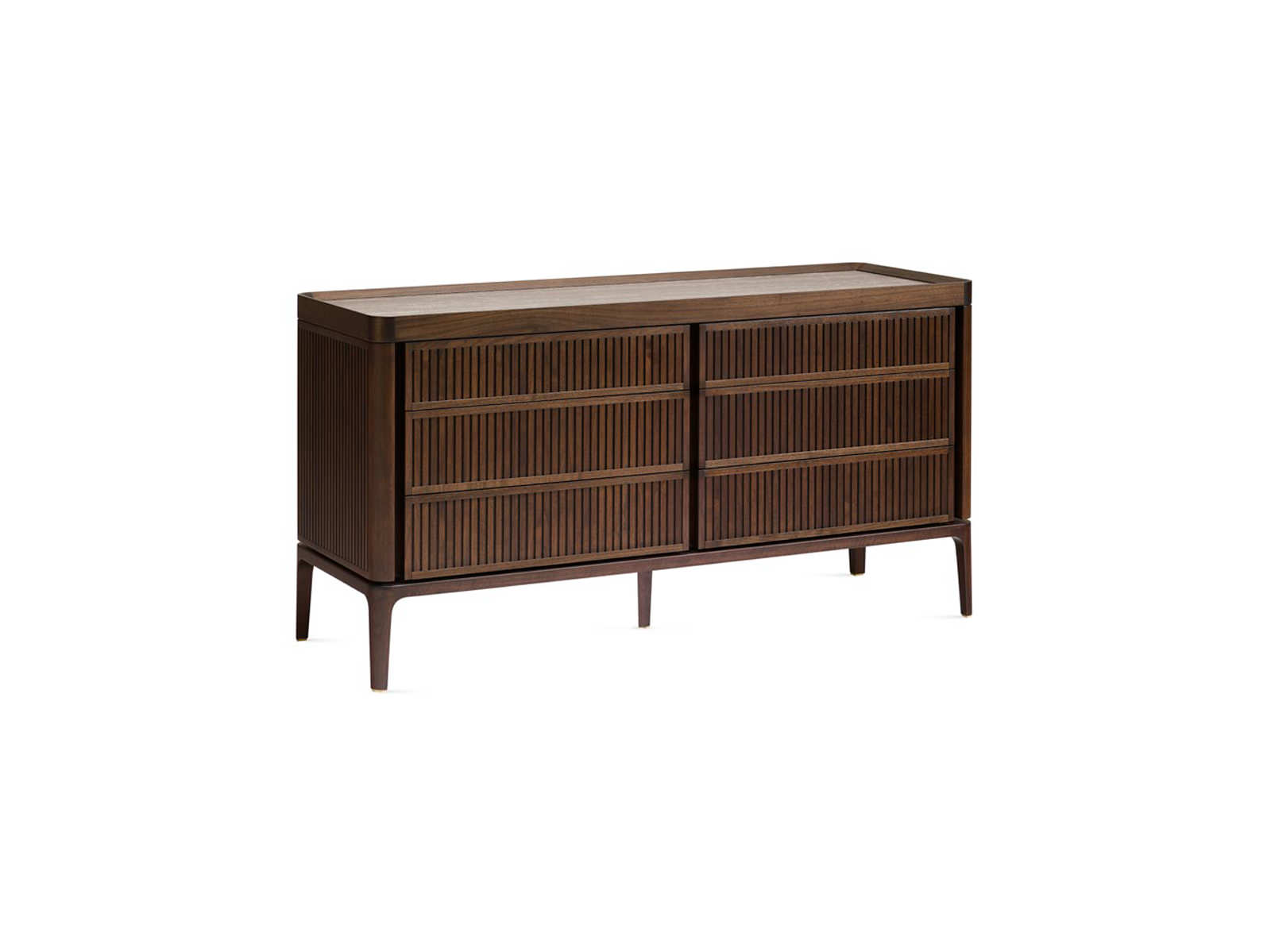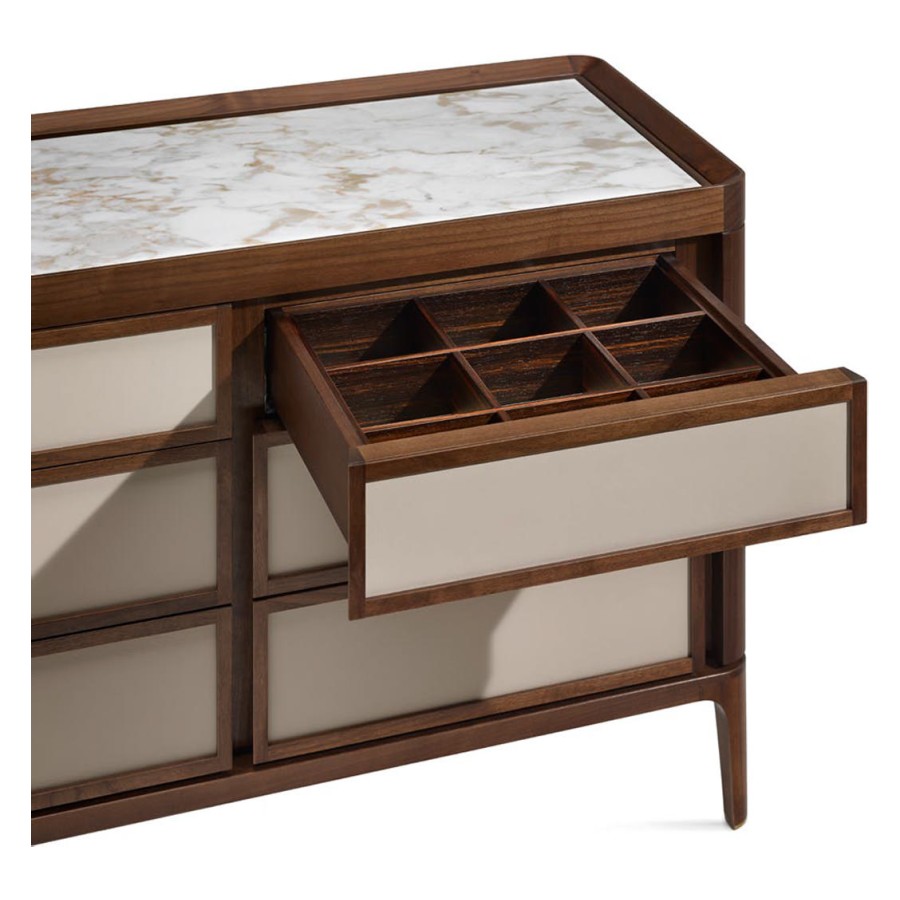 The structure is made of solid American walnut, while the drawer fronts and side panels can be covered in walnut, ebony, fabric or leather, or they can be lacquered. A wide choice of materials is available for the top, which can be made from wood, coloured glass or marble. The Extra version is available with drawer fronts and side panels covered in small strips of solid American walnut, all applied by hand. This is an elegant example of Ceccotti Collezioni’s artisan savoir faire. The bottom of the drawers can also be made from leather, and ebony dividers can be inserted inside the drawers to customise their use. For a complete set, it can be accompanied by the Full bedside table.