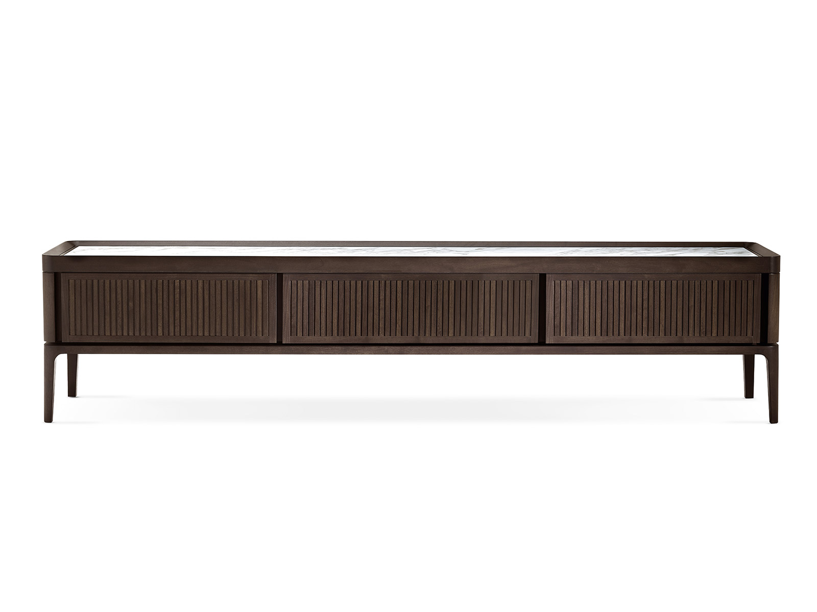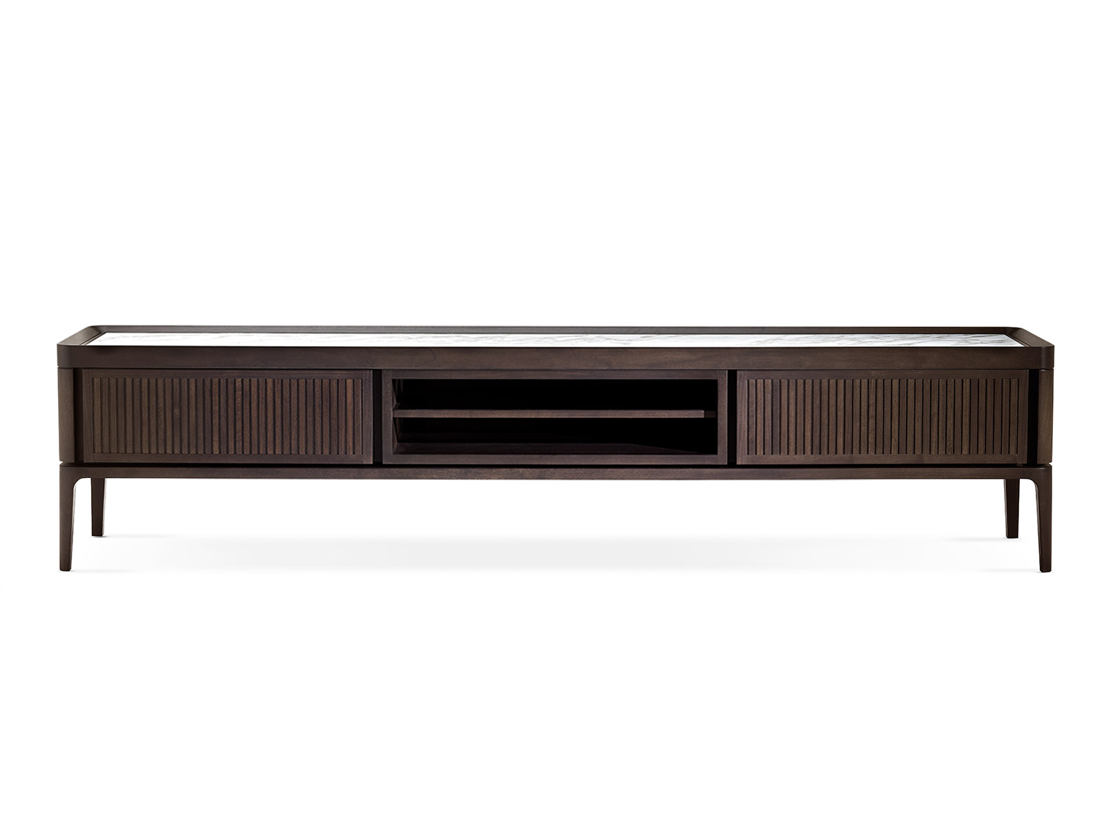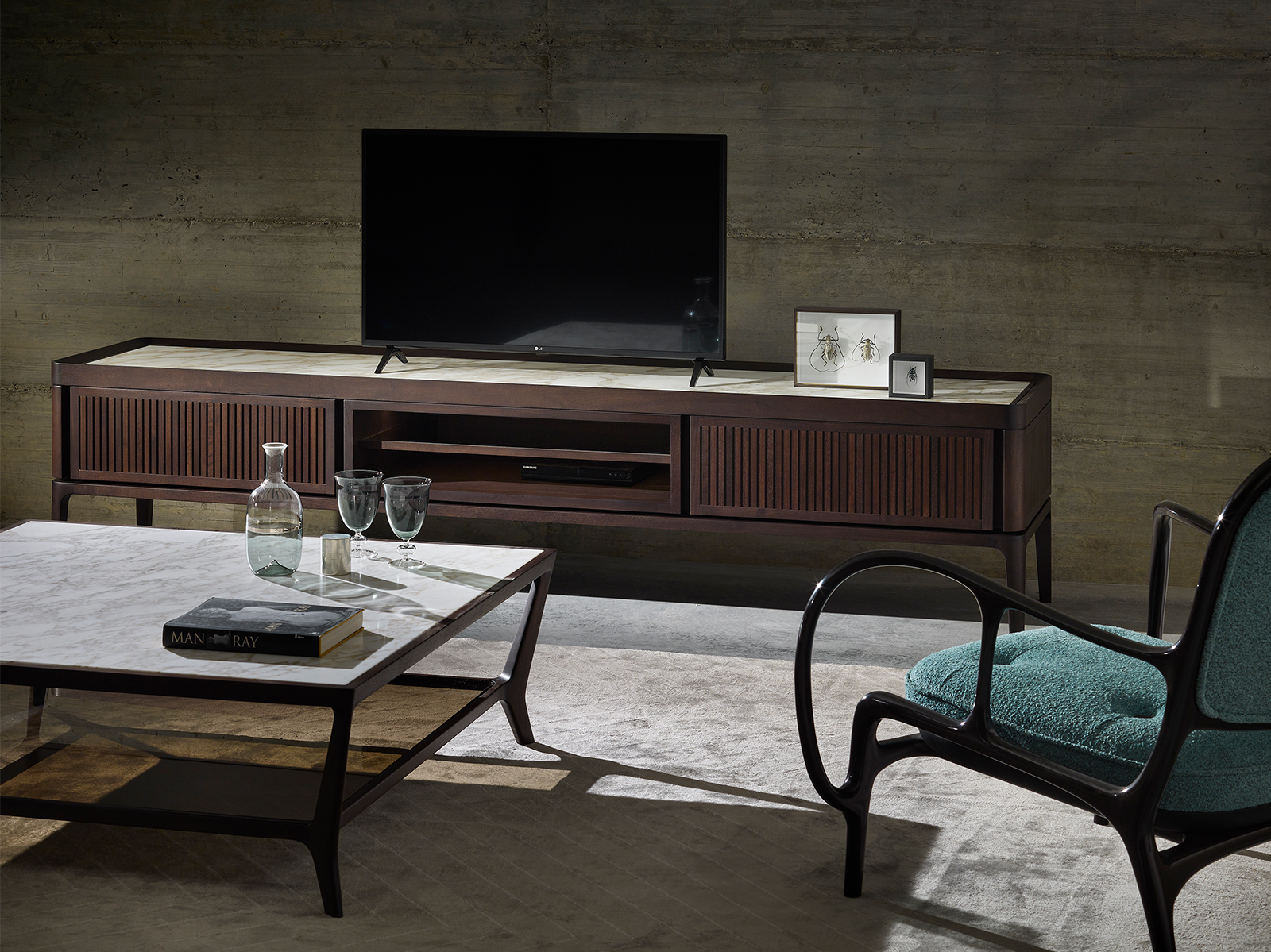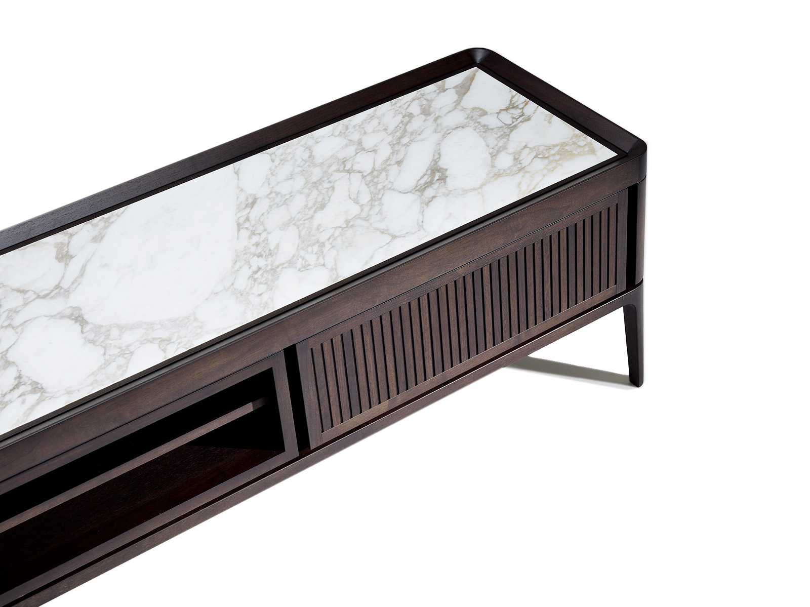 The drawer fronts and sides can be upholstered in different materials, such as ebony, fabric, or leather, or they can be lacquered in different NCS/RAL colours. It is also possible to choose the extra version, which embellishes the furniture with strips of solid American walnut applied by hand. The drawers and sides have been designed with a system that allows you to insert panels with different finishes, even when the cabinet is already polished, offering the possibility of changing the upholstery over time. The top is also available in different finishes: wood, marble or coloured glass. A storage unit with strong aesthetic appeal, but also highly functional, it is designed to accommodate a TV, and offers two side drawers that can be customized with solid maple dividers for storing accessories. The central compartment can be left exposed, displaying the glass shelf (transparent, bronzed or smoked) and the LED lighting with remote control, or it can be closed by a flap door with an elegant brass handle. An additional flap in the central part of the back of the cabinet allows you to hide the opening for the TV cables.