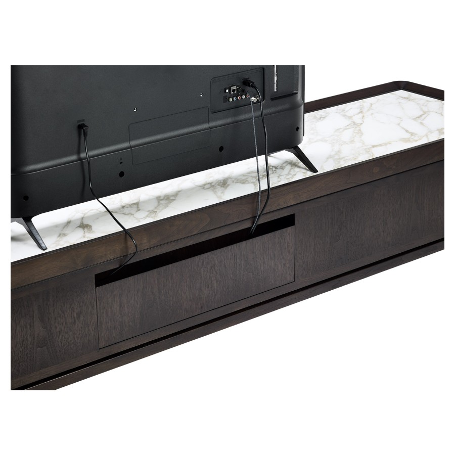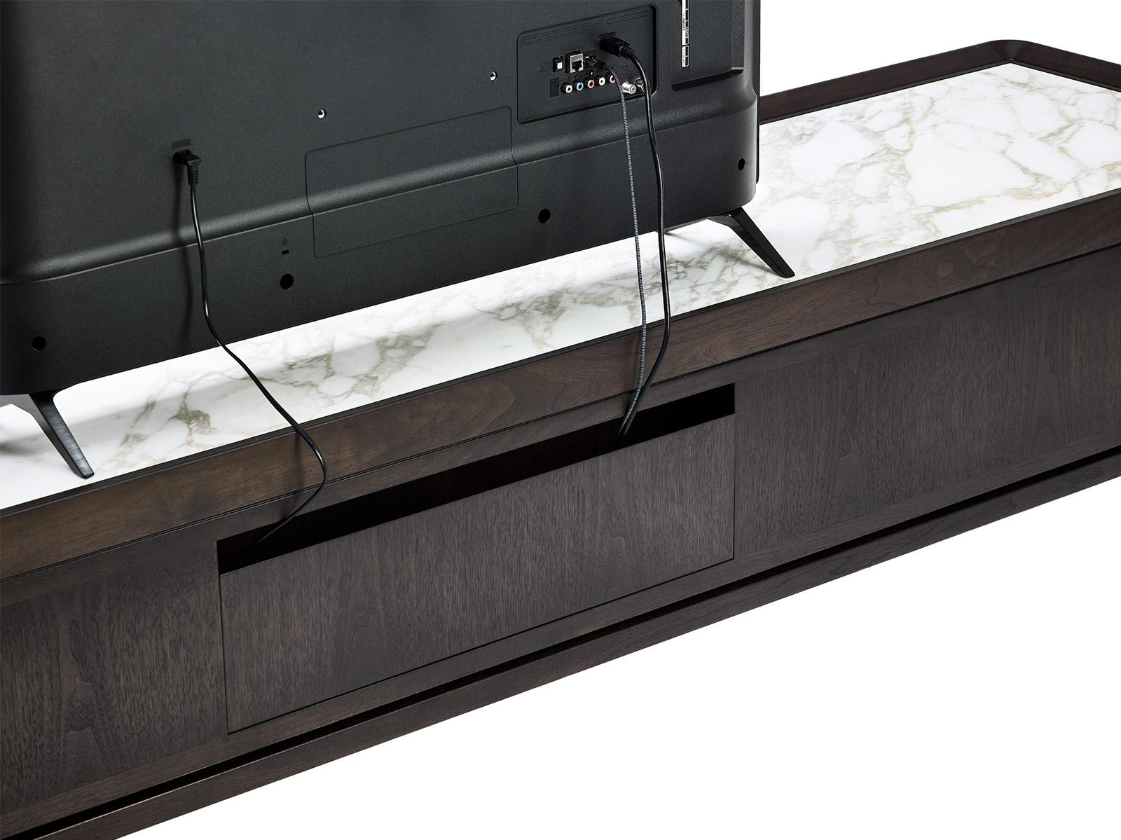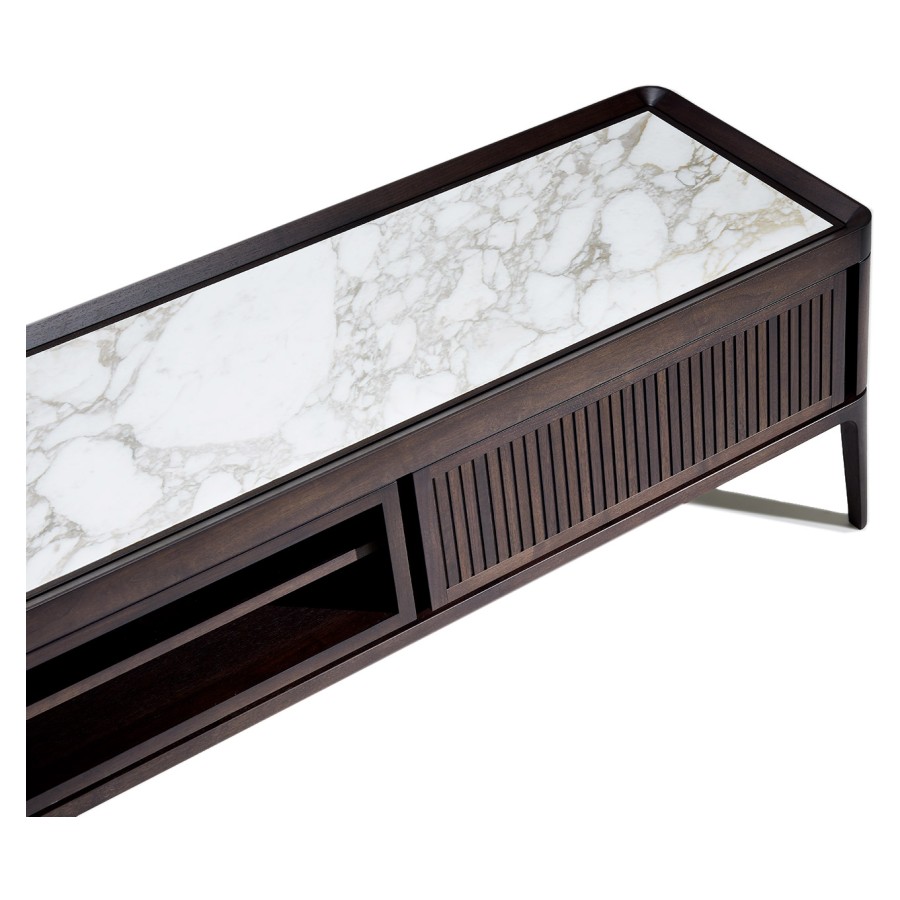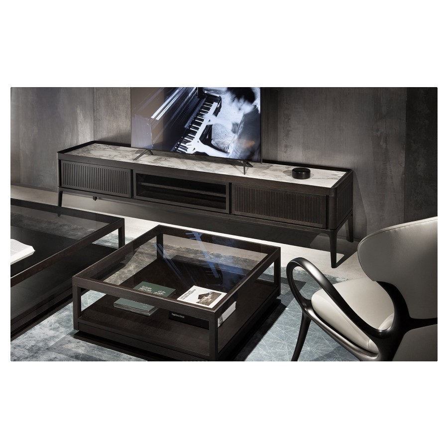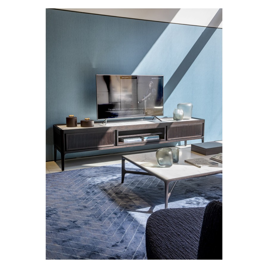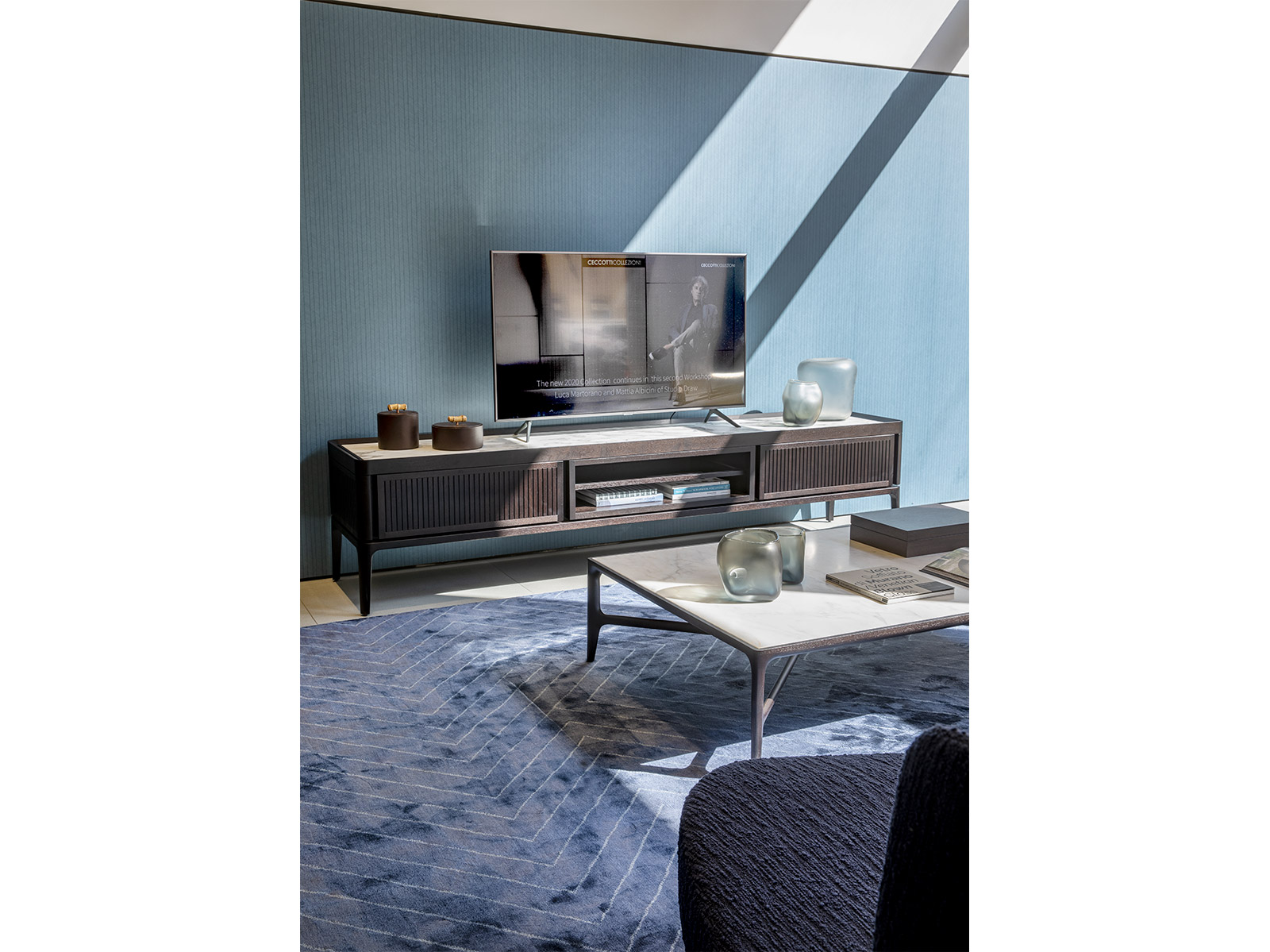 The drawer fronts and sides can be upholstered in different materials, such as ebony, fabric, or leather, or they can be lacquered in different NCS/RAL colours. It is also possible to choose the extra version, which embellishes the furniture with strips of solid American walnut applied by hand. The drawers and sides have been designed with a system that allows you to insert panels with different finishes, even when the cabinet is already polished, offering the possibility of changing the upholstery over time. The top is also available in different finishes: wood, marble or coloured glass. A storage unit with strong aesthetic appeal, but also highly functional, it is designed to accommodate a TV, and offers two side drawers that can be customized with solid maple dividers for storing accessories. The central compartment can be left exposed, displaying the glass shelf (transparent, bronzed or smoked) and the LED lighting with remote control, or it can be closed by a flap door with an elegant brass handle. An additional flap in the central part of the back of the cabinet allows you to hide the opening for the TV cables.