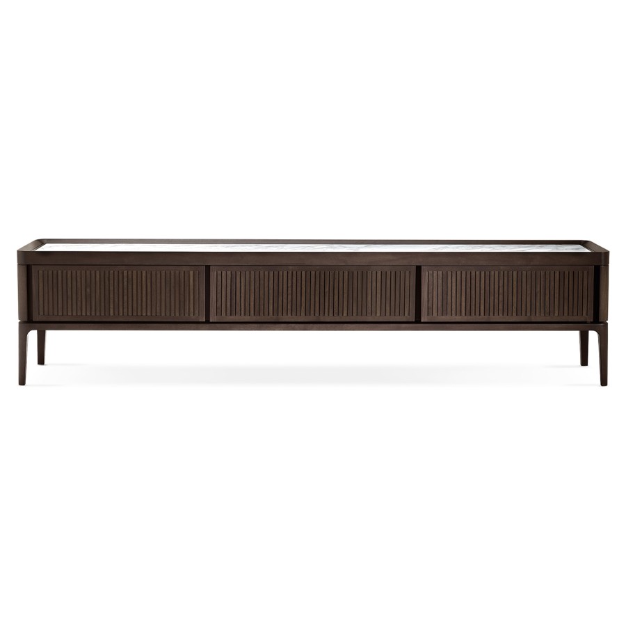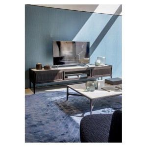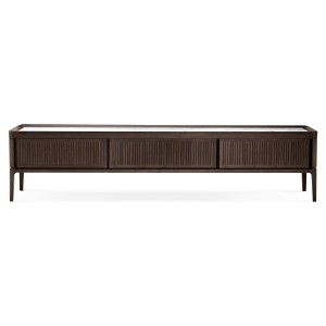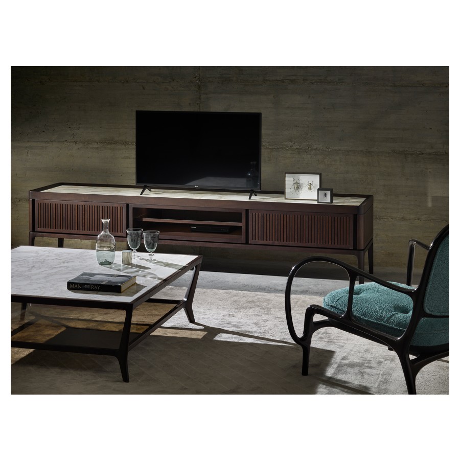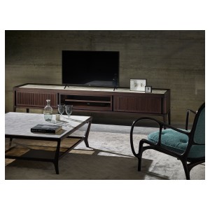 A TV cabinet that integrates with the Full family of cabinets made for the living room and bedroom. Designed by Roberto Lazzeroni in 2020, Full TV, available in two different sizes, has a structure and base made in solid American walnut. It is characterized both by its horizontally elongated volumes and by the many possibilities for customization it offers.