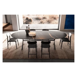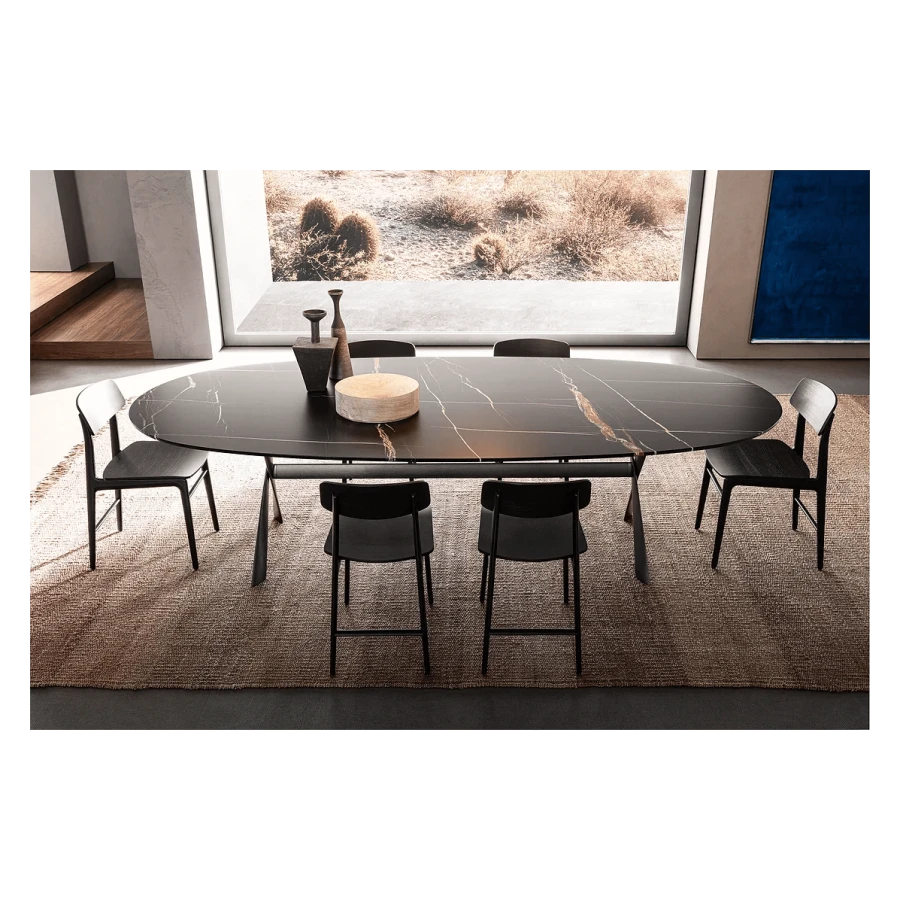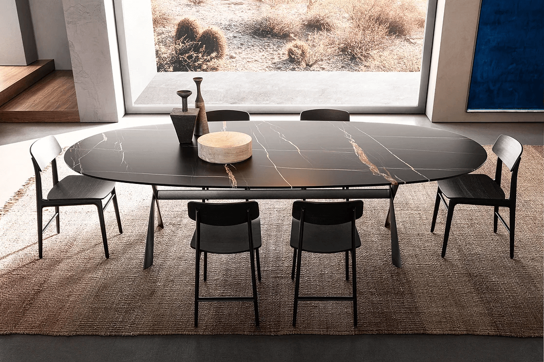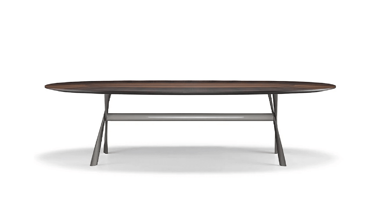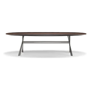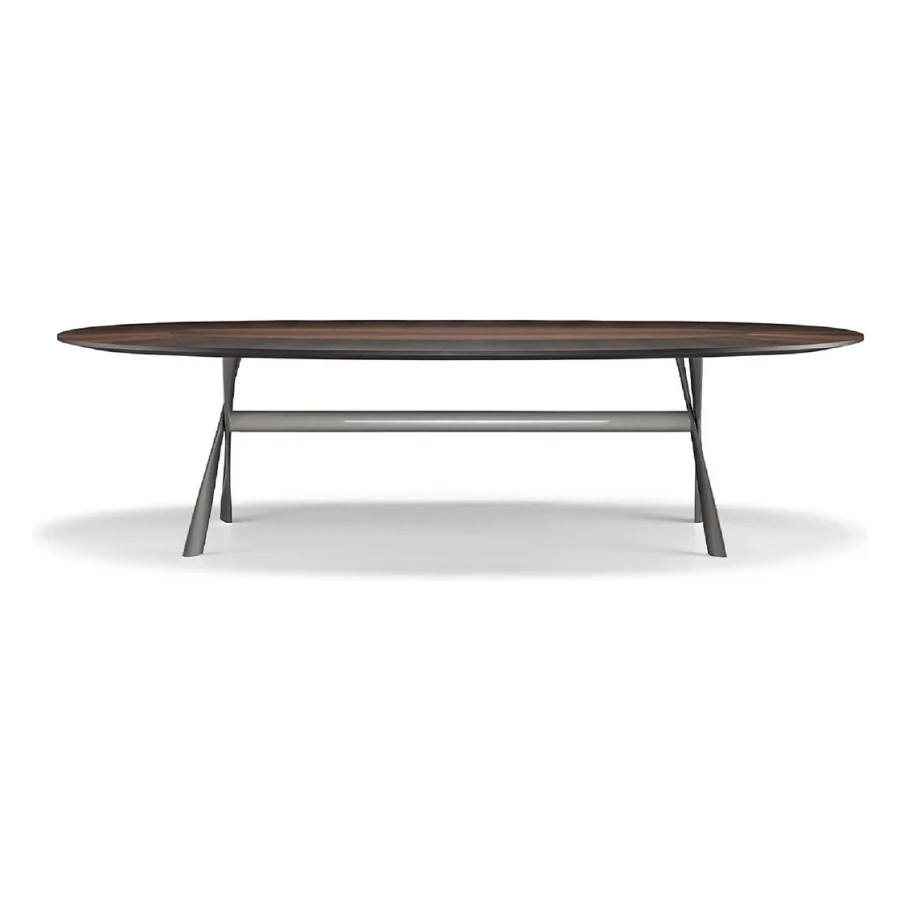 The aluminium frame in several contemporary finishes, such as black chrome and zinc, supports elegant rectangular or oval tops of different sizes enriched with wood or marble, selected from the Molteni&C collection.