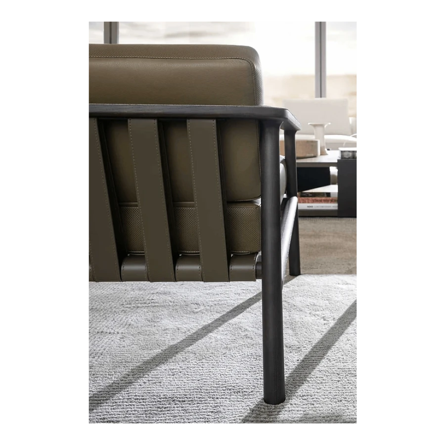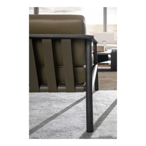 The structural seat and backrest function is performed by hide leather straps that guarantee perfect comfort by adapting ergonomically to the body. Seat and backrest are complete with comfortable cushions covered in textiles or leather chosen from the wide range of the Molteni&C collections