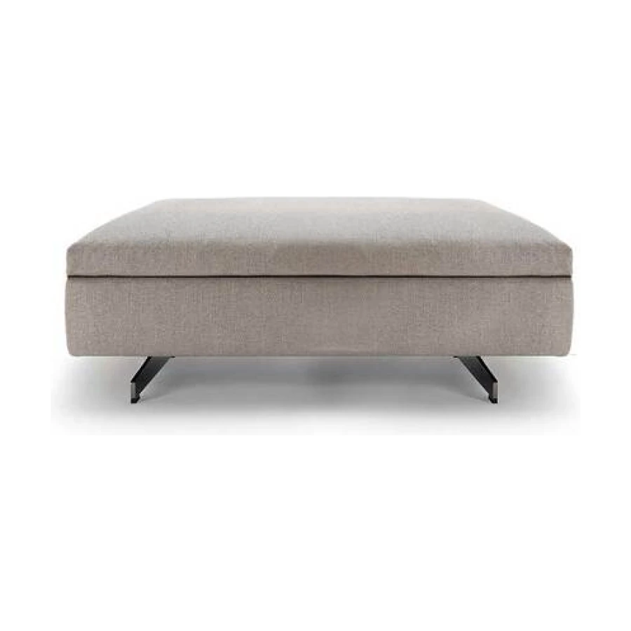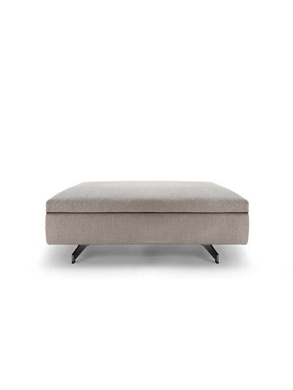 The GranTorino ottoman can be entirely upholstered in Pelle Frau® leather or in options that combine multiple materials. The structure is made of tubular metal with interwoven elastic straps, while the feet are in titanium-colored painted aluminum.