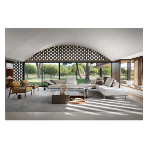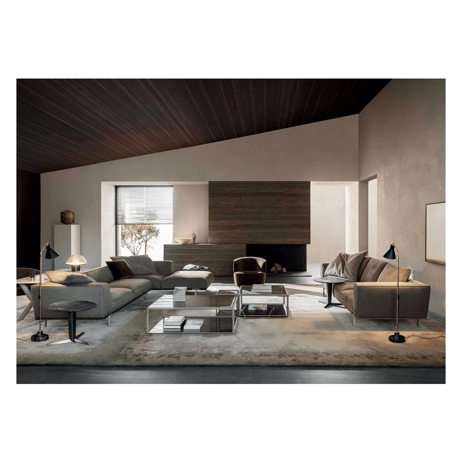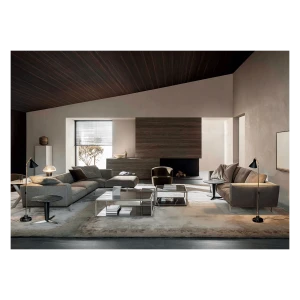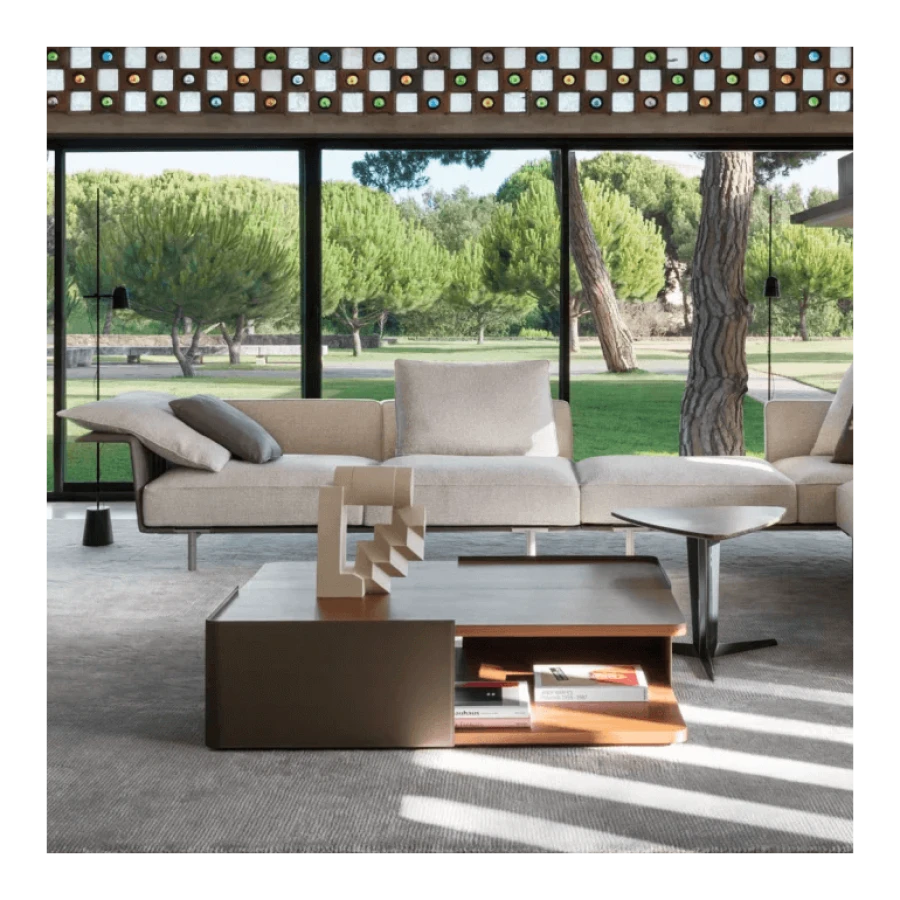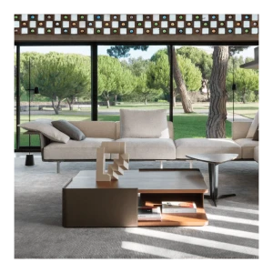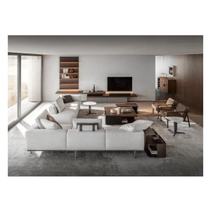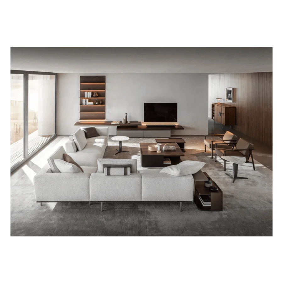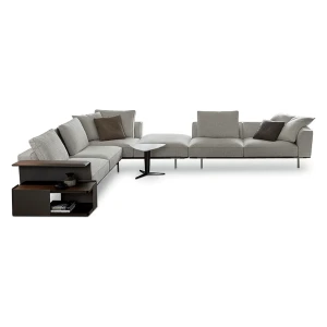 It includes various straight, corner or peninsular units that can be mixed and matched together to give multiple combinations for a living space destined for conversation, reading and entertainment, with all the media devices readily available.