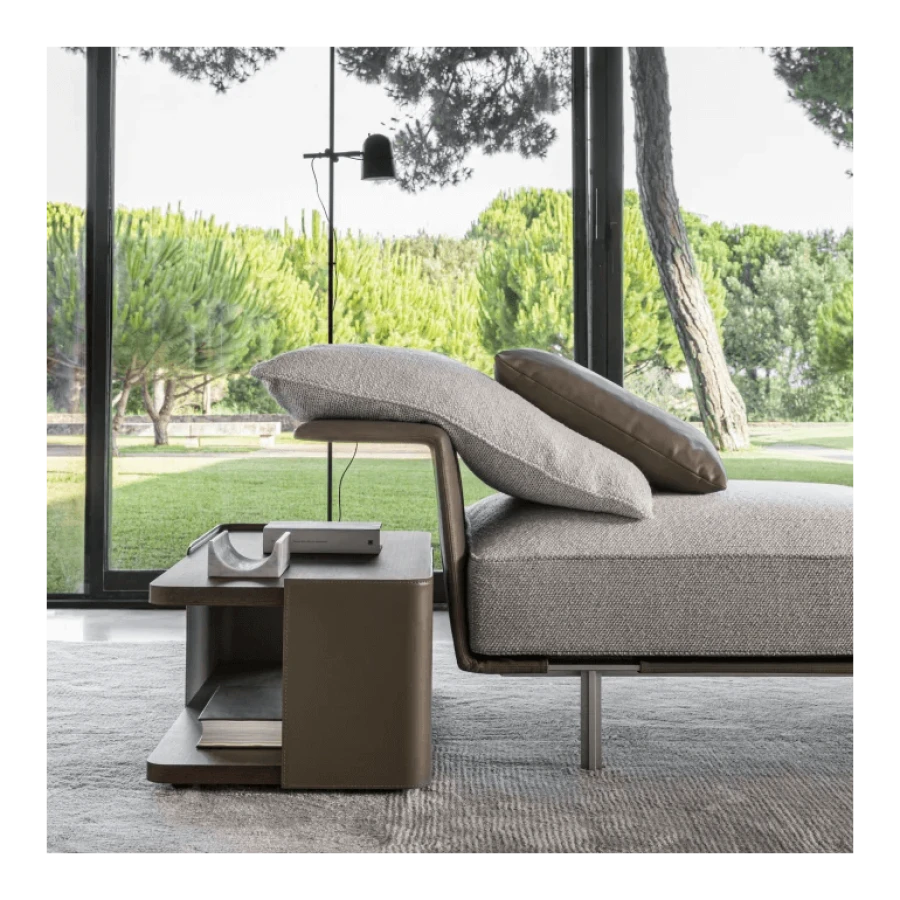 The steel base, in a new zinc finish, supported by small feet that recall VVD’s most recent furniture designs, such as the Quinten sideboards or the Jan small tables, is covered in leather, as are the winged armrests suitable for supporting soft cushions while at the same time acting as a useful surface.
