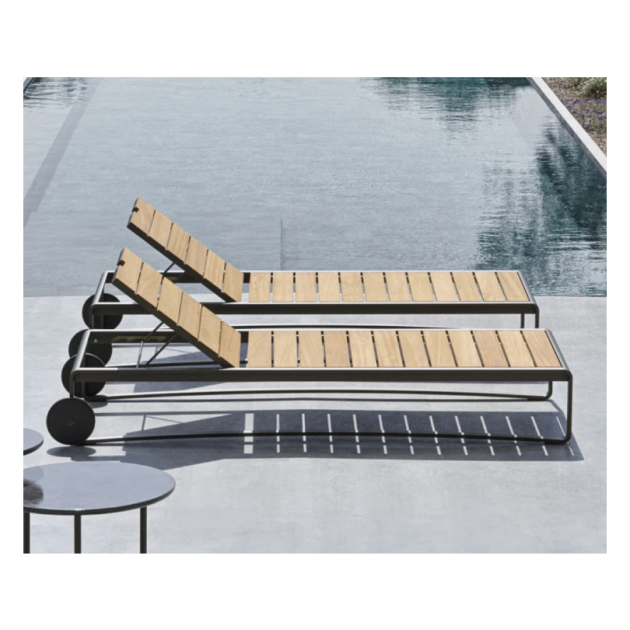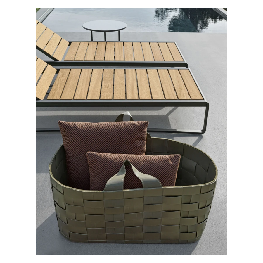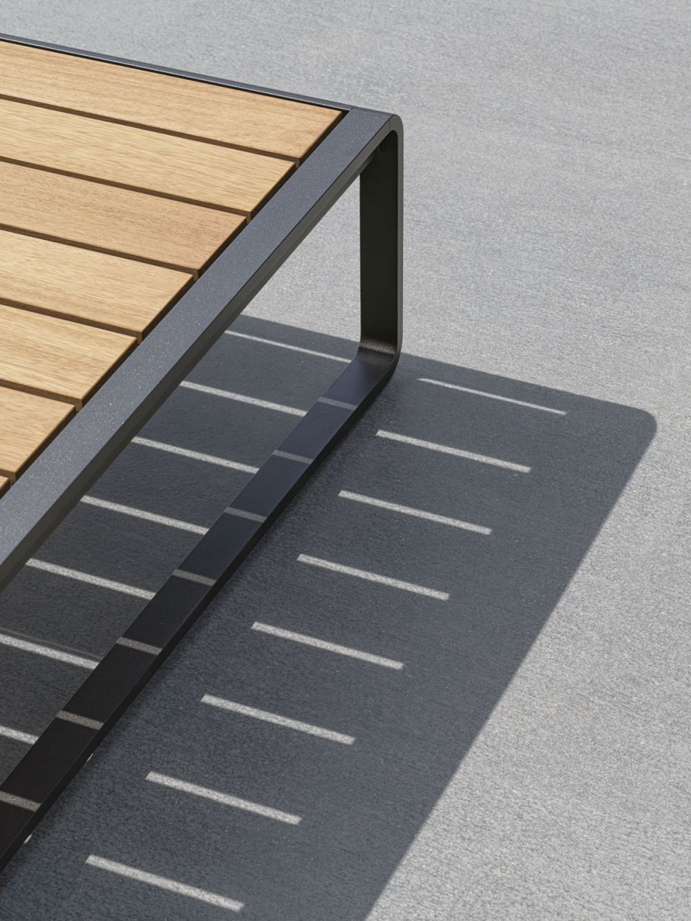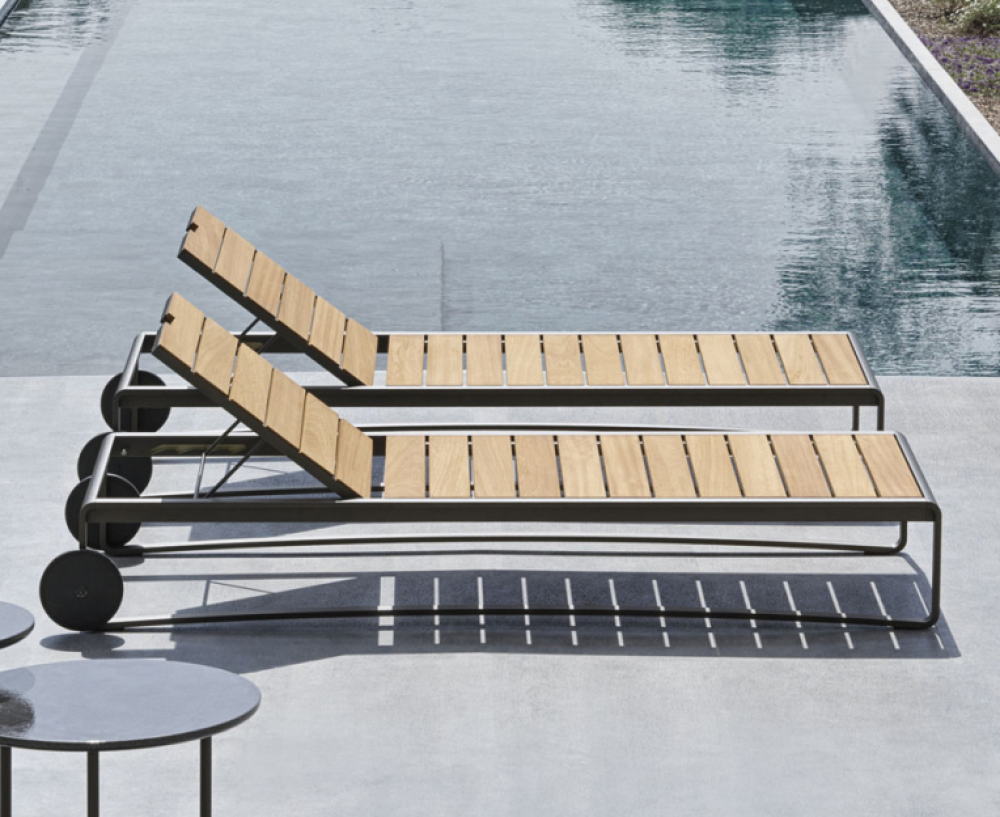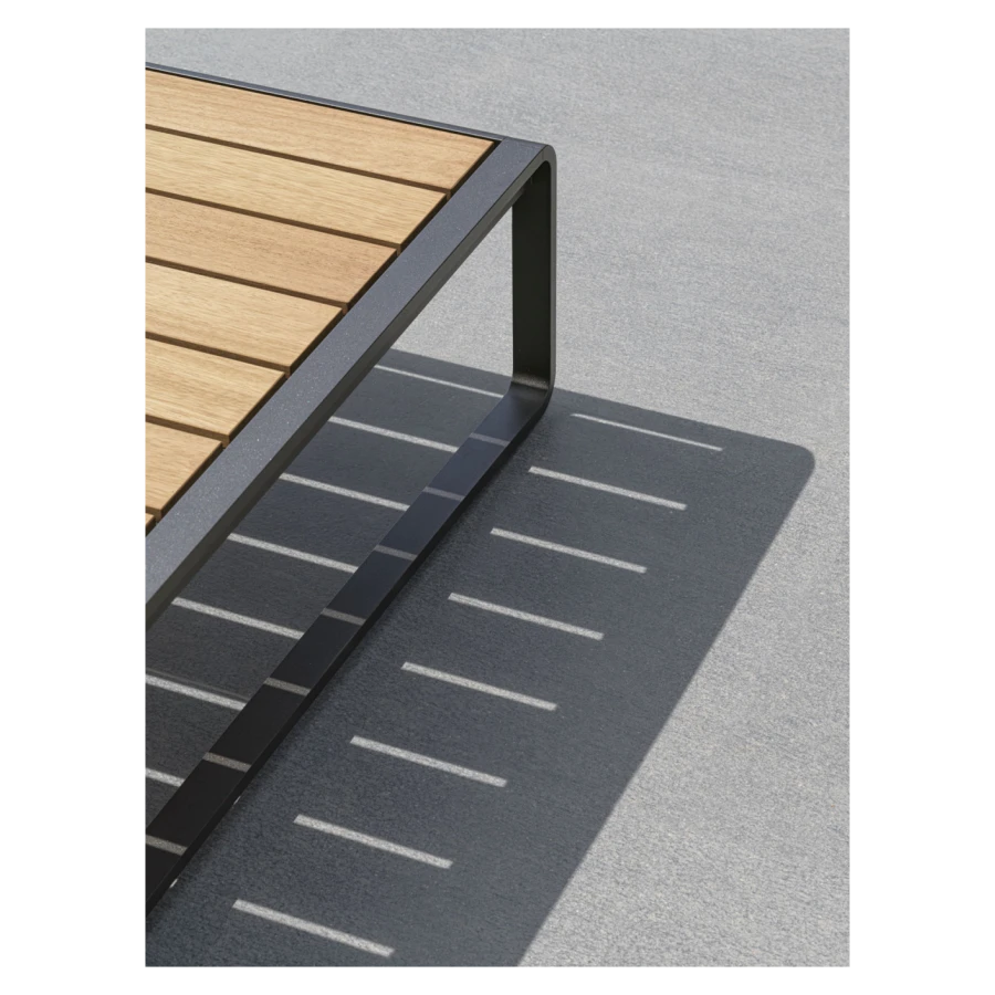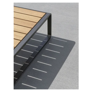 The wooden slats are the same width as those of the 6- or 8-seater table, supporting that refined interplay of dimensional recurrences that links the products of the same collection or between the two families of outdoor furniture.