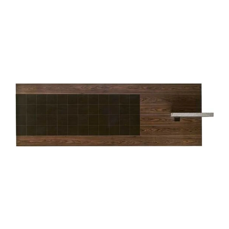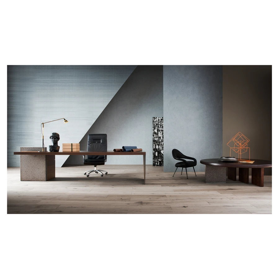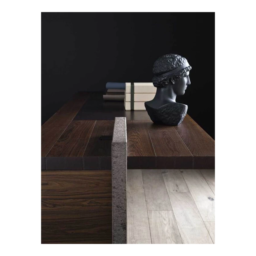 The upper part of the surface features a number of joints that show the craftsmanship of the horizontal slats. The desk pad, made from an MDF panel, is always covered in Cuoio Saddle leather in the colours Tortora or Caffè. The leg is made of metal and upholstered in saddle-leather that matches the desk pad and the fronts of the drawer unit. On the opposite side to the leg, the H_O Desk has a column in Valcamonica porphyry or White porphyry. The H_O President Desk and H_O Executive Desk come in both light and dark versions. The light version sees the White porphyry column, with its white-beige colours, paired with Tortora saddle-leather and Canaletto walnut. In the dark version the column in Valcamonica porphyry, with its browny-red tones, is matched with Caffè saddle-leather and Canaletto walnut. The H_O desks can be accessorised with a modesty panel covered in matching saddle-leather. The saddle-leather, in the two colours, can be either plain or feature a ‘square’ pattern which is handcrafted to produce a tone-on-tone motif with 16×16 cm chequers.
