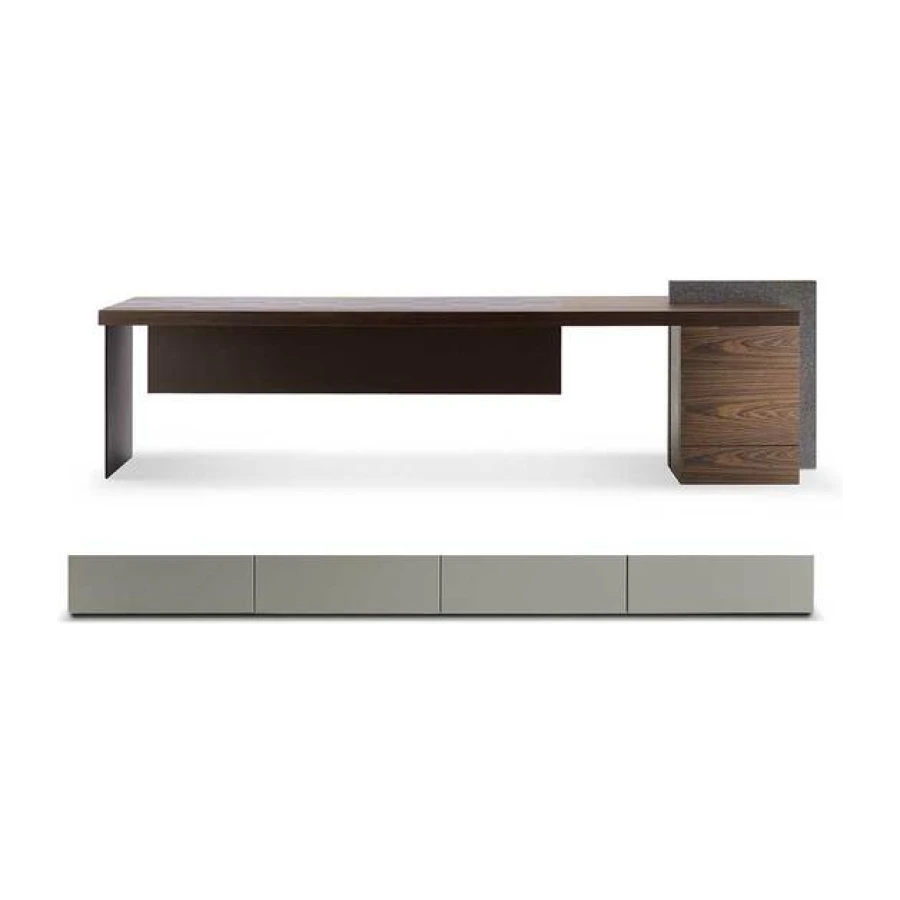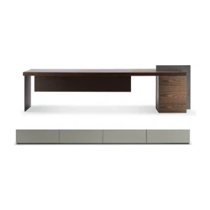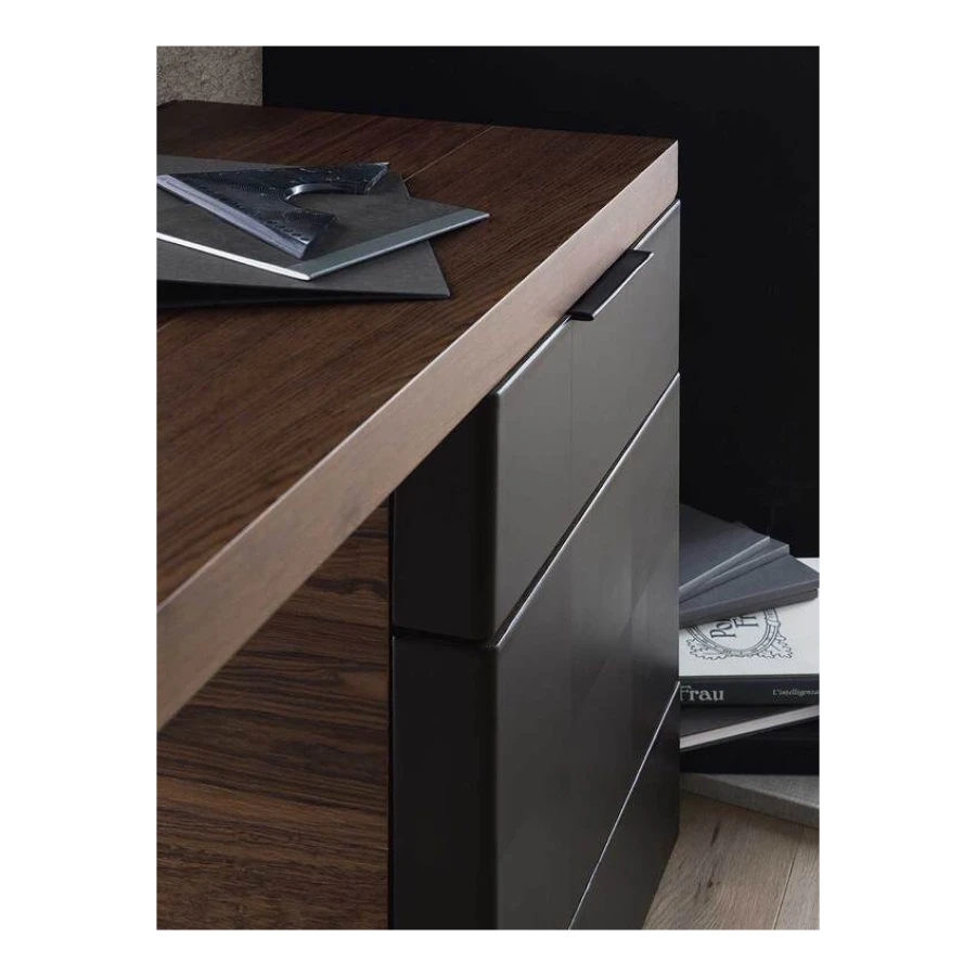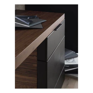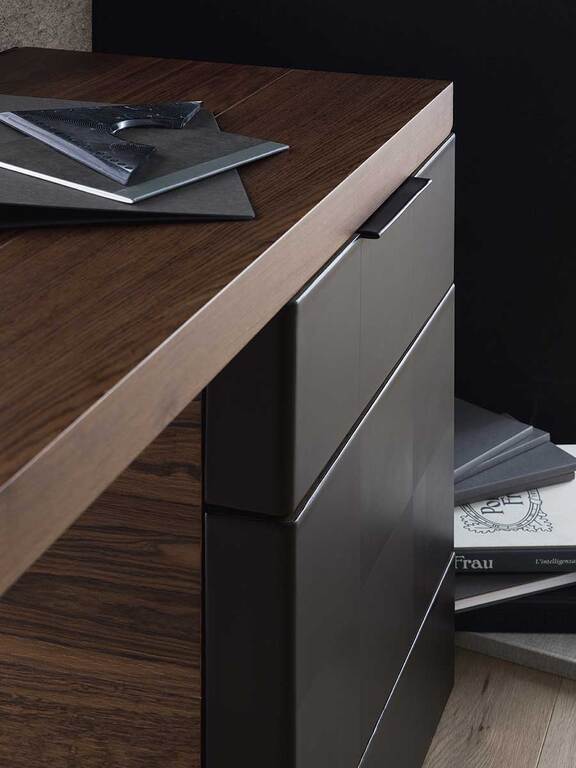 The H_O drawer unit, which can be positioned to the right or left of the user, but always on the same side as the column, has a poplar plywood structure with Canaletto walnut veneer and front in saddle-leather. The drawer unit consists of a drawer and a filing drawer or compartment with door. The joints on the side of the drawer unit show the craftsmanship of the horizontal slats. On the surface, near the column there is an opening through which electric cables can be passed.