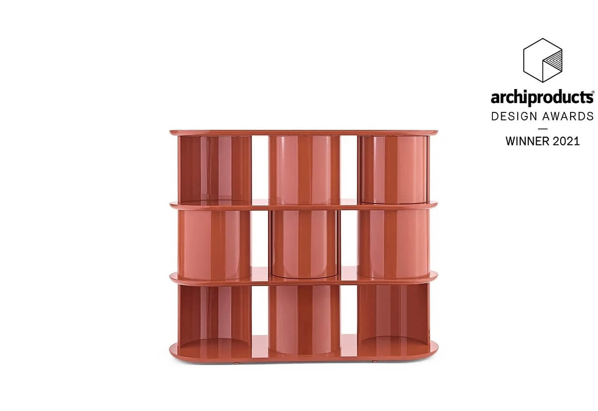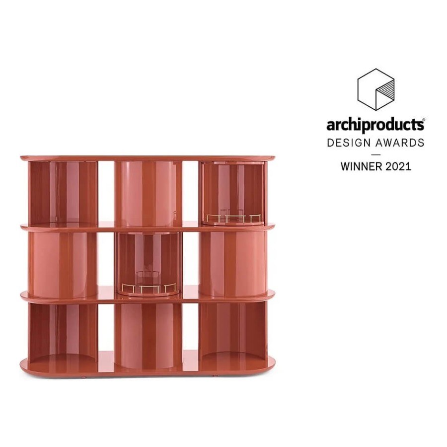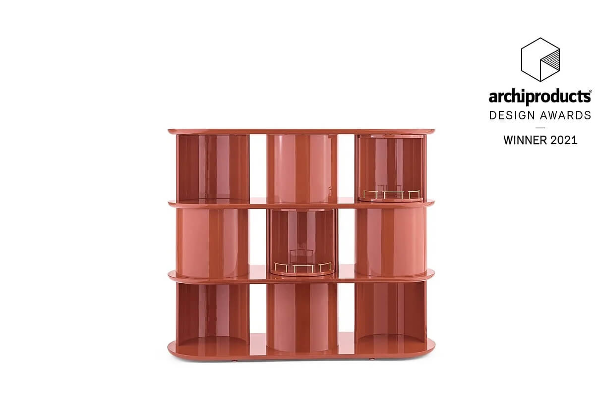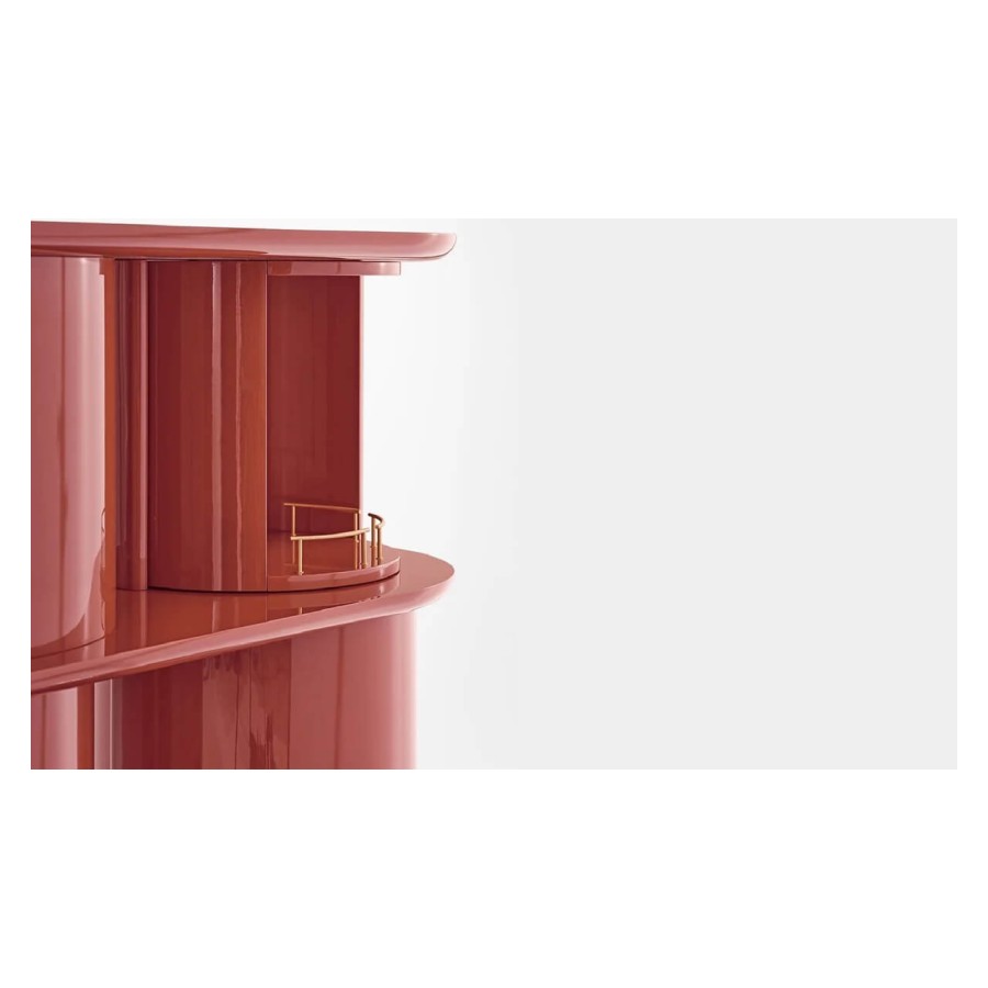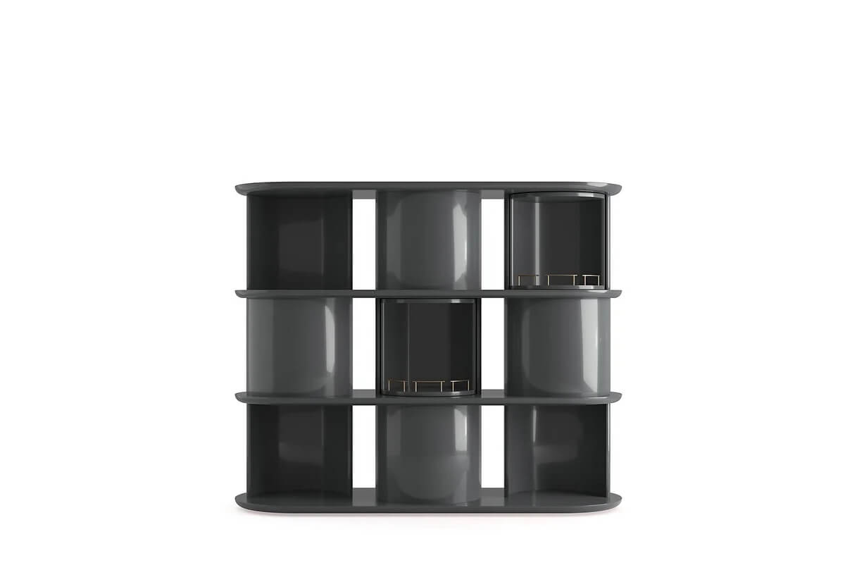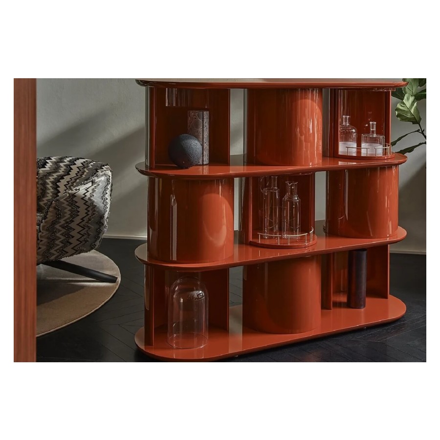 Sideboard with structure, shelves and half-cylinder in glossy or opaque lacquered wood in the colour “Rosso Persia”, “Grigio Londra” or “Nero Giza”. Half-cylinder with front or rear opening. Available version with rotating cylinders, in pre-established positions, which allows the closing of the composition.