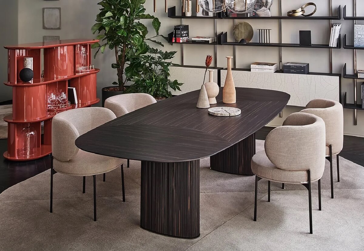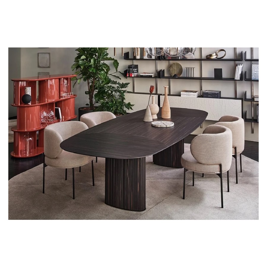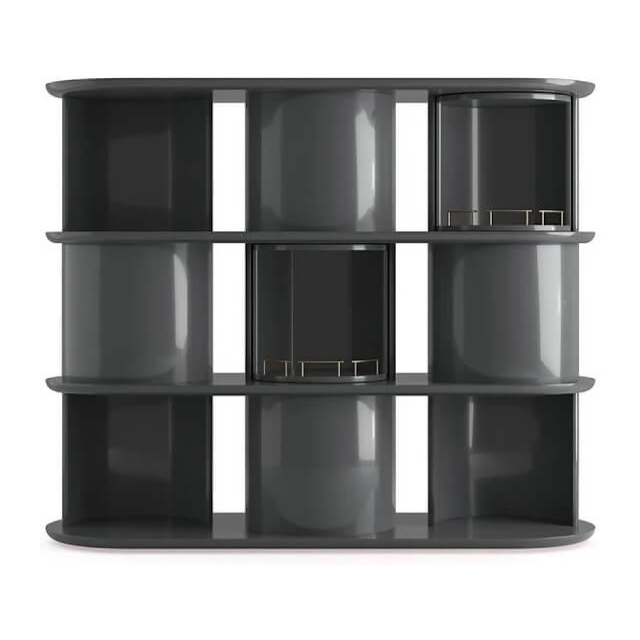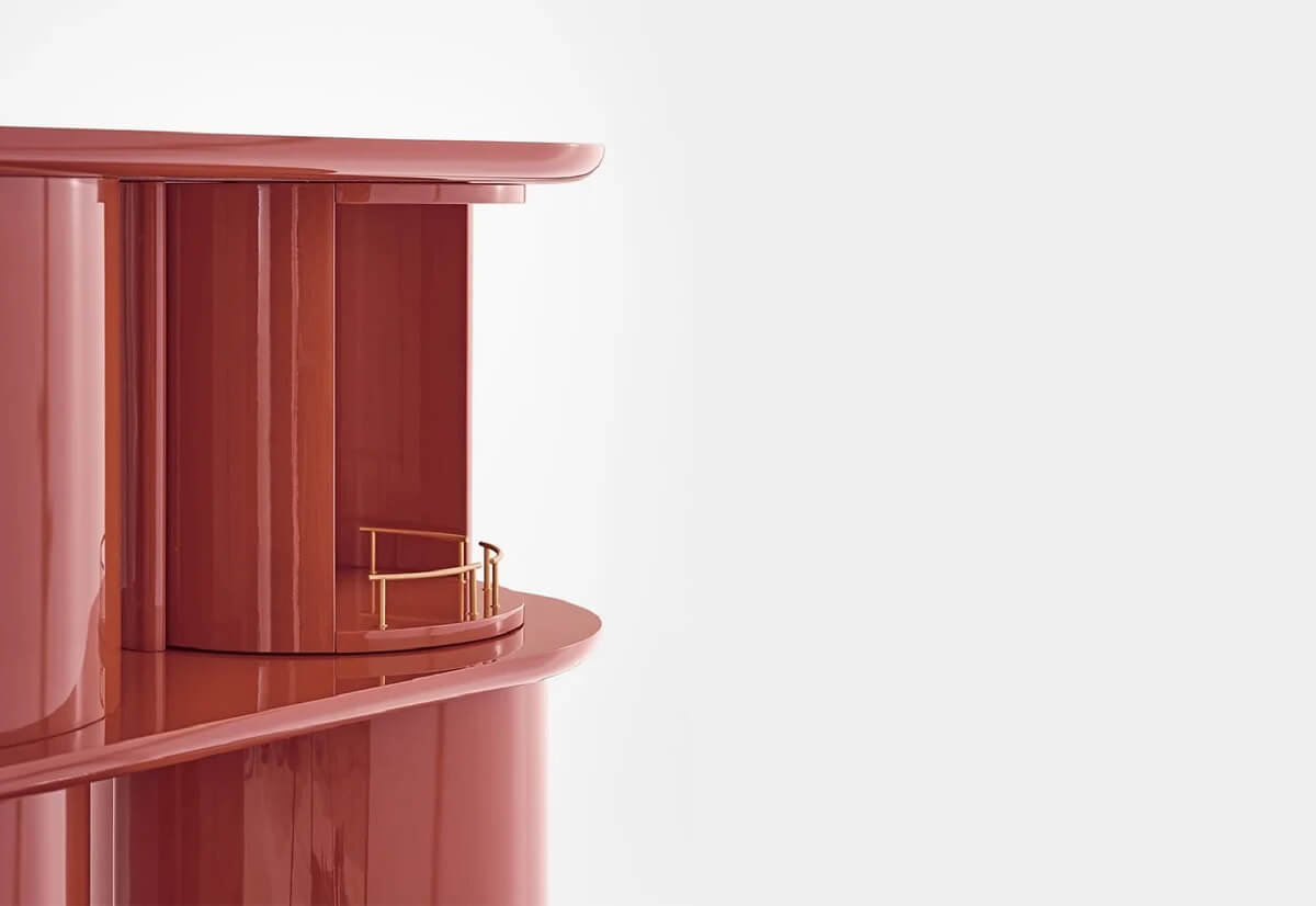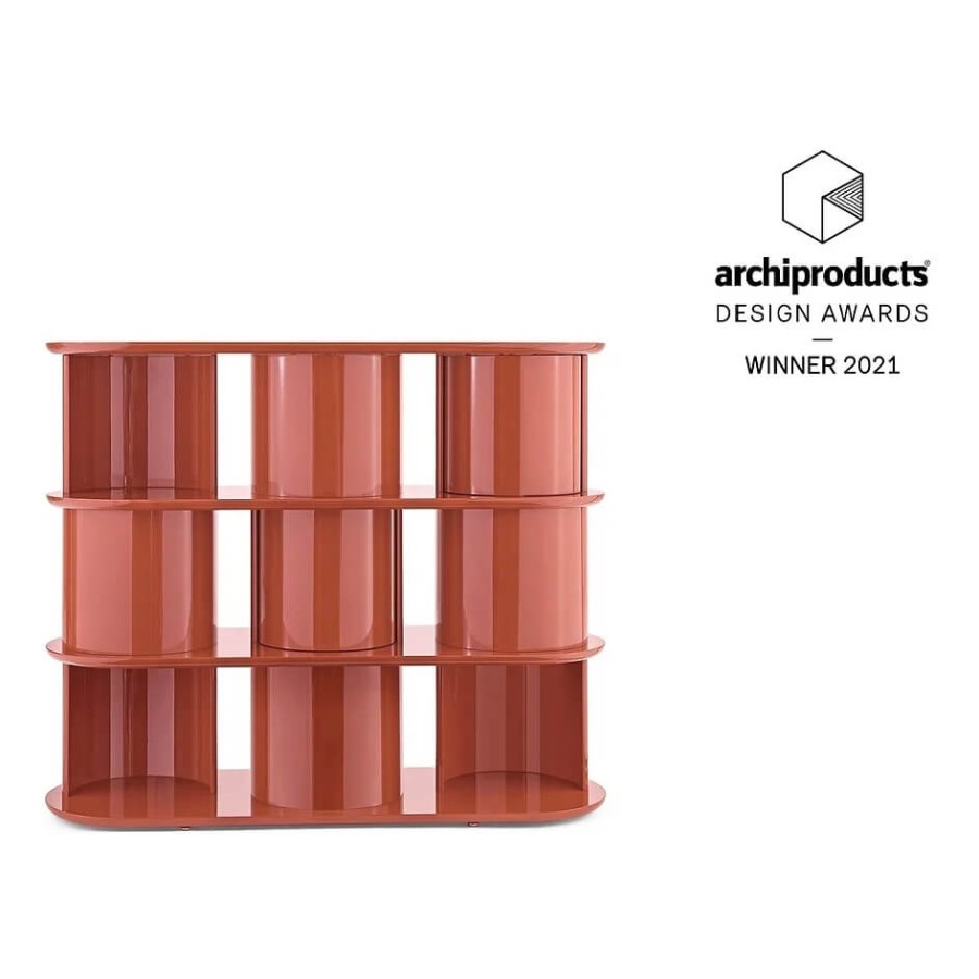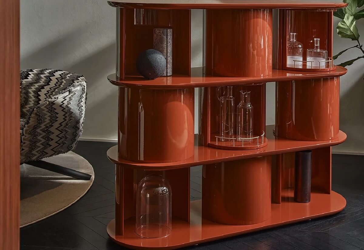 Sideboard with structure, shelves and half-cylinder in glossy or opaque lacquered wood in the colour “Rosso Persia”, “Grigio Londra” or “Nero Giza”. Half-cylinder with front or rear opening. Available version with rotating cylinders, in pre-established positions, which allows the closing of the composition.