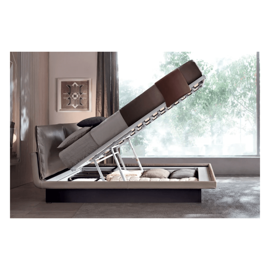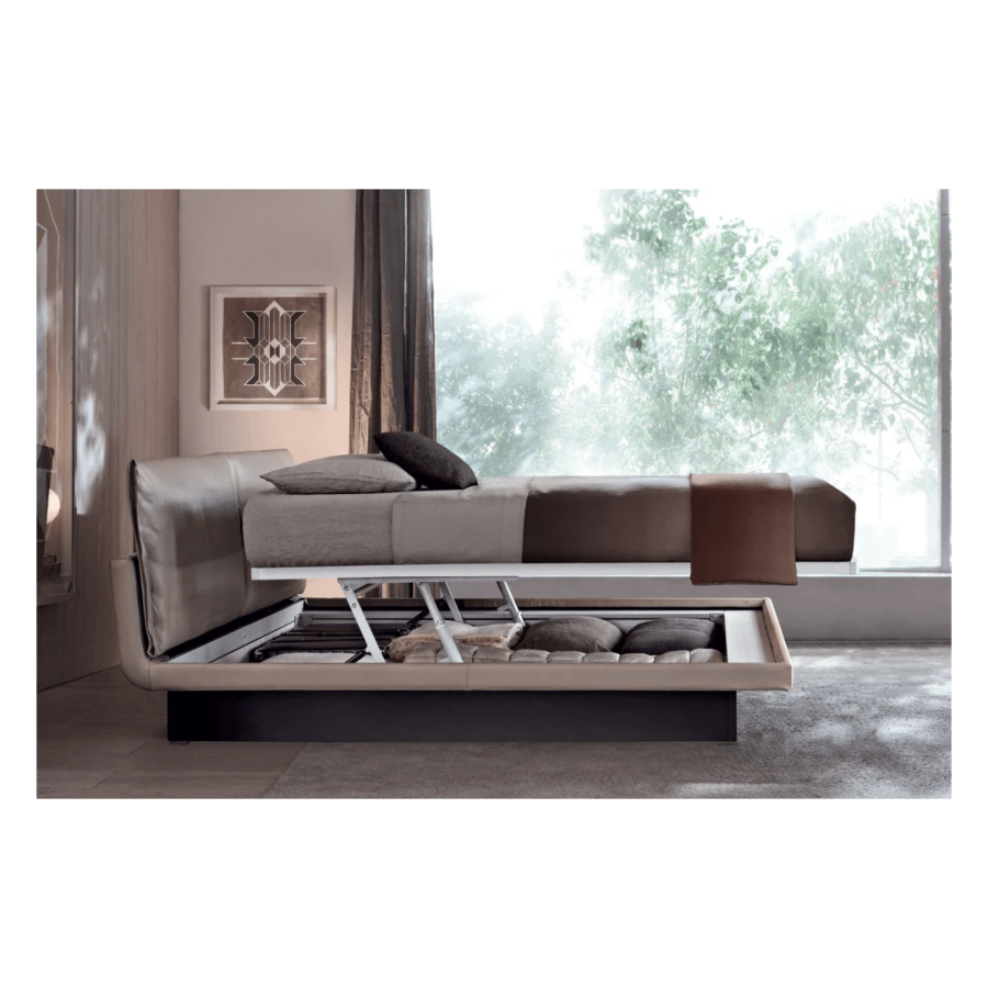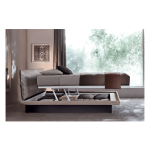 Honey is a fabric bed with a modern line, a bed of limited size, designed to fit into various sleeping environments. The container below the mattress opens with a swing mechanism developed to ease access to the compartment. The front opens to allow access to a horizontal lift for comfortable bed making.